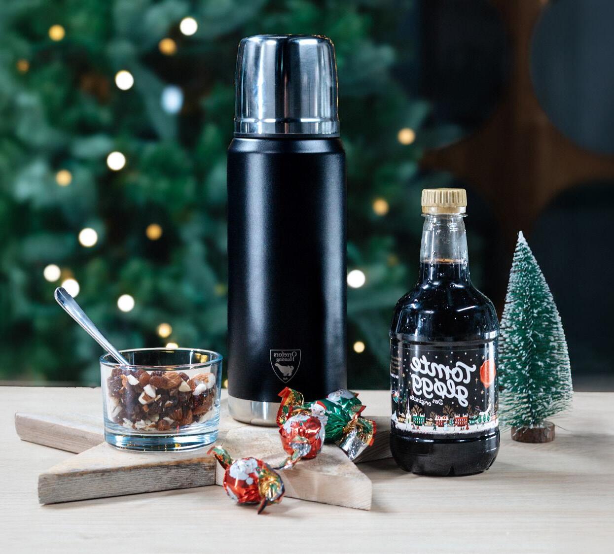 Innhold: 1 stk. Tomtegløgg 0,5 l | 1 stk. Laika nissekuler 4 x 12 g | 1 stk. Gløggmix 80 g | 1 stk. Termos 0,75 L