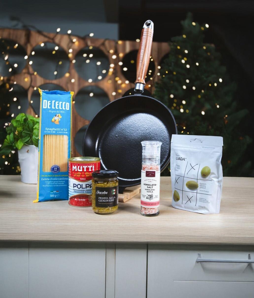 1 stk. De Cecco Spaghetti 500 g | 1 stk. Jacobs Grønn Pesto 130 g | 1 stk. Mutti Finhakkede tomater 1 stk. Havsalt salt 110 g | 1 stk. Oliven Iliada grønn uten sten | 1 stk. Stekepanne i støpejern