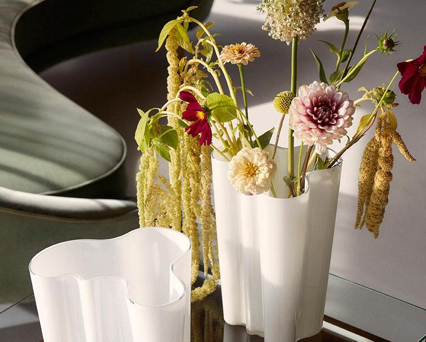 på Iittala-fabrikken i Finland, og det kreves sju høyt kvalifiserte og koordinerte håndverkere for å fremstille en Aalto vase – et ikon for moderne design. Alvar Aalto er uten tvil et av de største navnene innen moderne arkitektur og skandinavisk design. Et allsidig produkt som kan brukes til mer enn blomster. Prøv den f.eks med blomsterløker, snacks eller nøtter.