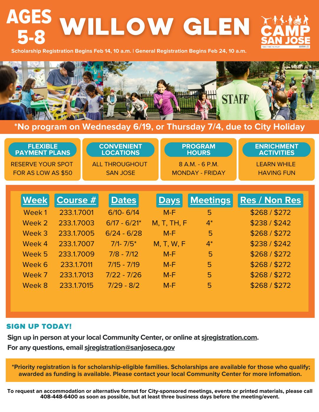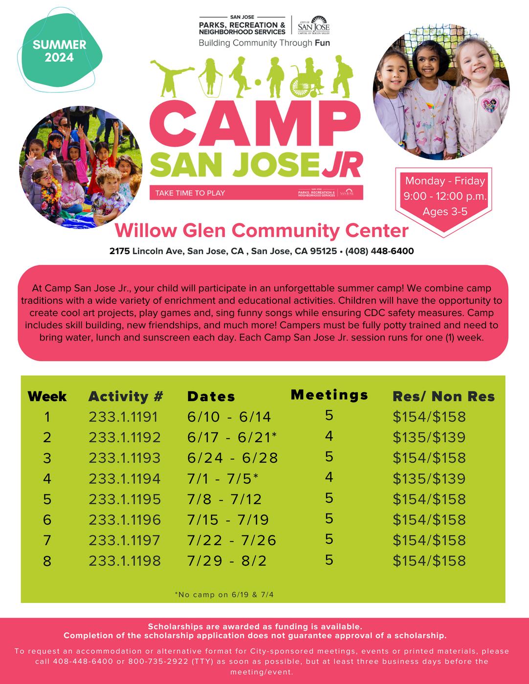 SUMMER 2024 PROGRAMS FOR ALL AGES SCHOLARSHIP DETAILS INSIDE sanjoseca.gov/prns sjregistration.com WILLOW GLEN C O M M U N I T Y C E N T E R 2175 Lincoln Avenue 408-448-6400