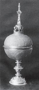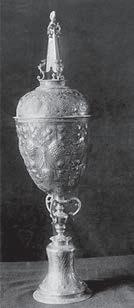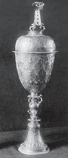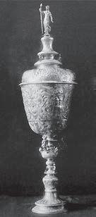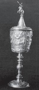 At right: In illustration of the delightful variety of form and decoration on Jacobean steeple cups, here are a number of exceptional (if not well-preserved) examples from the great collection of English silver at the Kremlin Armory.
