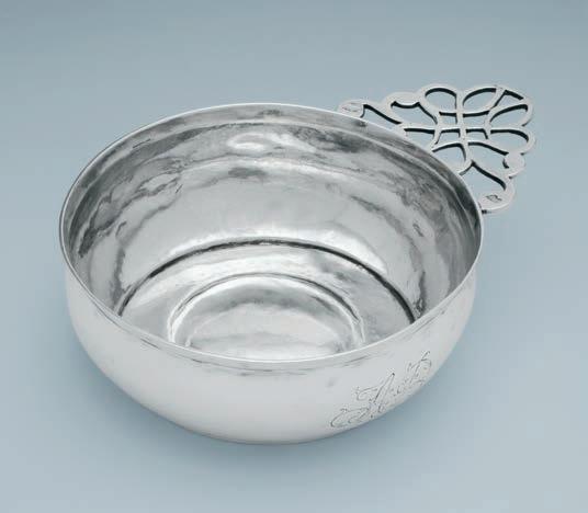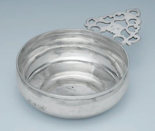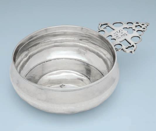 A very early and beautiful porringer with a rare style of handle. The engraved initials and date (1745) are slightly later. It is one of the heaviest porringers we have had.