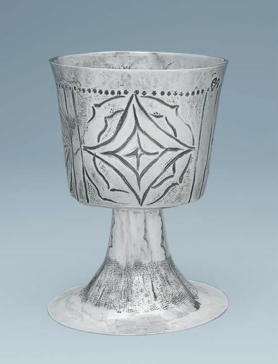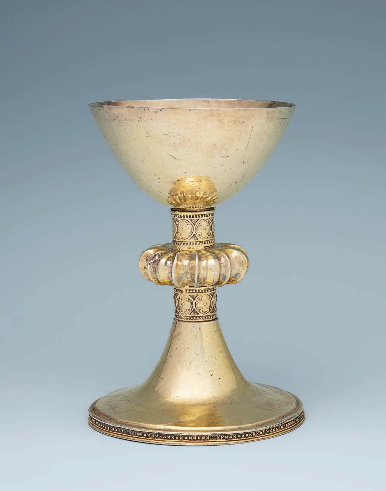 A chalice of similar form, with a knop flanked by apparently identical diestruck bands of roundels enclosing quatrefoils within beaded borders, and thought to have been made at Freiburg about 1350, is in the treasury at Freiburg Cathedral; see Johann Michael Fritz, Goldschmiedekunst der Gotik in Metteleuropa, 1982, p. 213, pl. 210.