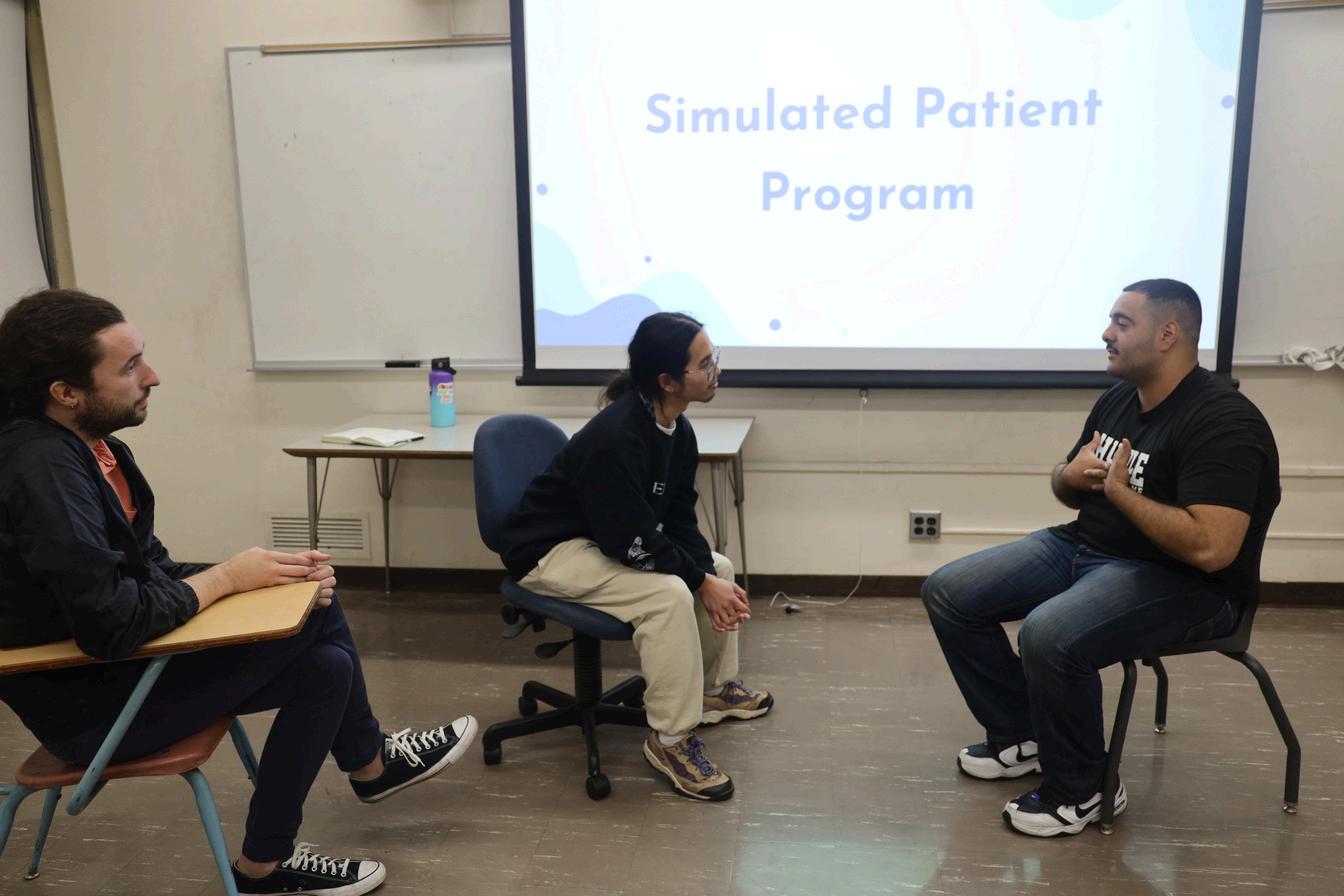 Dr. McN ece (left) observes a pat ent simu at on sess on with students Joaqu n Gawchua (center) and Kyrollos Saw ris (right)