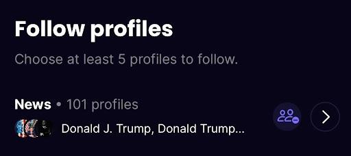 The top of the page read “Follow Profiles,” with instructions to “Choose at least 5 profiles to follow” before proceeding. Below the requirements was a tab labeled “News,” and when I clicked it, a pop-up displayed 101 auto-selected accounts already followed for me. At the top was Trump himself, followed by Donald Trump Jr. and a string of other high-profile right-wing figures.