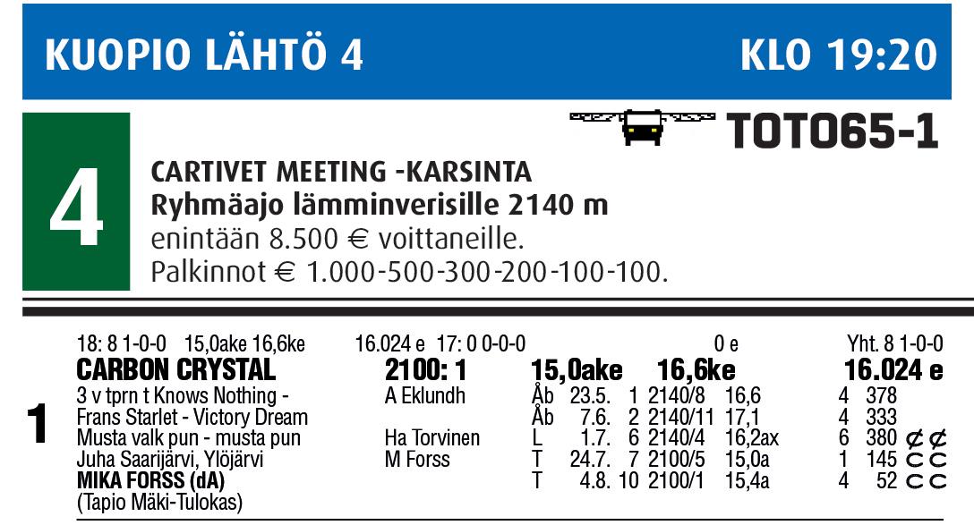 -a hpl 1958 c c 10 22: 5 0-1-1 31,2ke 1.510 e 21: 11 0-1-0 27,2ake 28,3ke 1.614 e Yht. 66 3-13-11 TÅGA PRINSEN* (SE) 2140: 1 27,2ake 25,9ly 25.716 e 8 v mrn r Moe SvartenGomnes Terna - Alm Viktor Sin valk orans - sininen Virolainen Raul & Virolainen Kitta, Lohja MIISA PULKKANEN (A) (Raul Virolainen) K Rosimo H 9.2. 1 2160/2 31,2 7 103 c c J Antti-Roiko R 21.8. 2 2120/6 m31,3 4 154 x c A Teivainen Tk 18.9. 6 2100/5 hpl 408 c c M Pulkkanen H 12.10. 1 2160/2 m33,5 2 60 c c P 22.10. 3 2140/1 m31,2 3 307 c c 11 22: 30 0-0-1 24,6aly 27,7ke 1.400 e 21: 32 0-3-2 26,2aly 27,3ke 6.330 e Yht. 136 2-6-8 NORAN POT 2 24,6aly 27,3ke 18.360 e 10 v trn t TutuariTupla-Viola - Turo Sin valk hopea - sin Soile Färlin, Helsinki EVELIINA SARISMALA (A) (Soile Färlin) E Sarismala K 30.9. 10 1020/6 25,9 7 230 c c Ha Torvinen L 6.10. 3 2140/12 29,5a 8 716 c c E Sarismala H 12.10. 1 2160/1 m34,2x 5 72 c c H 26.10. 2 2120/4 29,9a 7 577 c c F 6.11. 8 2140/1 12 22: 18 2-1-2 25,6ake 27,8ke 6.850 e 21: 17 3-0-0 27,8ake 27,2ke 9.969 e Yht. 66 7-6-4 VIKING GEL* (SE) 2160: 1 25,6ake 27,2ke 34.066 e 7 v mrn r JärvsövikingHorgen Pia - Elding T sin valk - t sin Little Big Horn Stable, Nurmijärvi NELLY KORPIKOSKI (A) (Piia Mäkelä) J Kaija R 21.8. 2 2120/3 m29,2 1 *31 c c J Haapiainen F 6.9. 9 2160/5 hll 276 c c J Kaija H 14.9. 2 2140/5 m29,0 3 60 x x Tk 8.10. 4 2100/4 m28,6 4 48 c c P 22.10. 3 2160/3 m29,4 1 *37 c c 13 22: 3 0-0-0 28,6pi 150 e 21: 20 1-1-3 27,0ake 27,4ke 7.480 e Yht. 78 5-7-13 MONTSAN VIPPI 2 27,0ake 26,6ke 29.930 e 9 v prt r LiisingPaipari - Hovi-Ari Sin valk hopea - sin Jouni Monto, Hattula VILJA KIVINEN (C) T Perttunen H 22.12. 8 2120/4 27,1a 8 509 c c Ju Torvinen T 28.12. 8 2120/3 29,5 9 245 c c T Perttunen T 11.1. 8 2140/1 28,6 5 213 c c He Bollström T 12.4. 5 2120/1 28,6 6 194 c c S Markkula H 20.4. 7 3140/8 28,6 10 1137 c c 14 22: 18 4-7-0 23,3aly 24,3ke 19.950 e 21: 26 7-5-7 26,9ake 26,1ke 16.670 e Yht. 76 16-15-11 MAISTERI JUTILA 2200: 1 23,3aly 24,3ke 48.640 e 9 v vprt r VillihottiMaisi - Erovisku Harmaa kelt - harmaa kelt Sanna-Kaisa Liukkonen, Orimattila PIA-MARIA MOILANEN (A) (Sanna-Kaisa Liukkonen) Ha Torvinen T 13.8. 10 2100/2 24,3 4 273 c c E Holopainen L 18.8. 4 2140/6 26,3a 4 162 c c J Koskela H 14.9. 2 2140/4 m28,5 2 *25 c c A Moilanen L 22.9. 3 2140/7 27,3a hlo3 70 c c La 24.9. 7 2120/4 26,2x 9 247 c c RANKING A) 14,12 B) 5,10,6,8,3 Voittaja Sija | | Kaksarikerroin 1. 500m 1000m 3. 500m viim. 500m KOUVOLA | RATANRO 04 KLO 20:56 PRIX DU NORD | MONTÉ Kylmäveriset tasoitusajo 2100 m p. 7500 € + 20 m/ 10 000 €, enintään 57 500 €. Palkinnot € 1000-500-300-200-(100). LÄHTÖ 8 MAGIC MONDAY