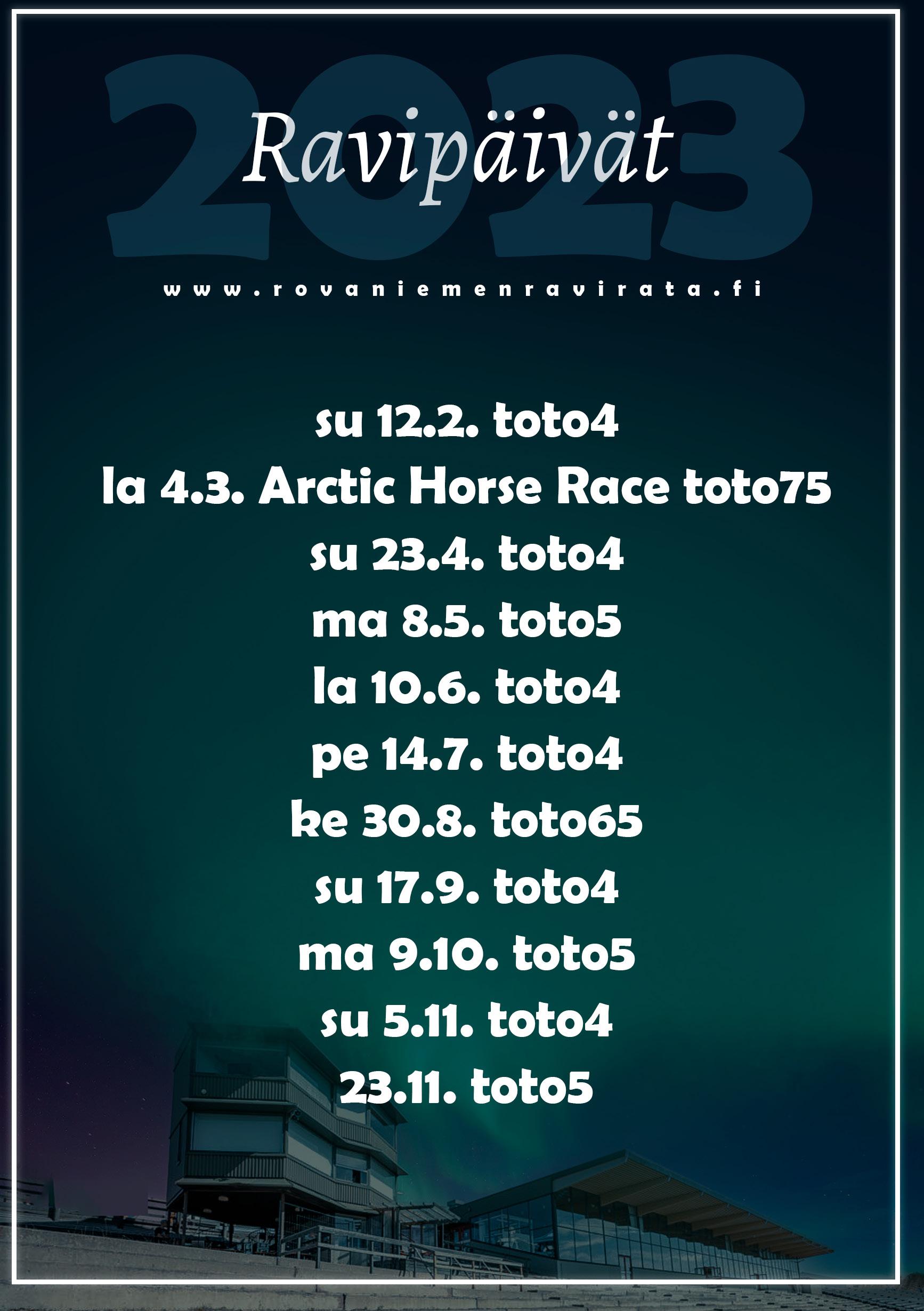 Lämminveriset ryhmäajo 1600 m enintään 20 500 e. Palkinnot € 800-400-240-160-(80) Voittajahevosen omistajalle tuotepalkinto. www.rovaniemenravirata.fi