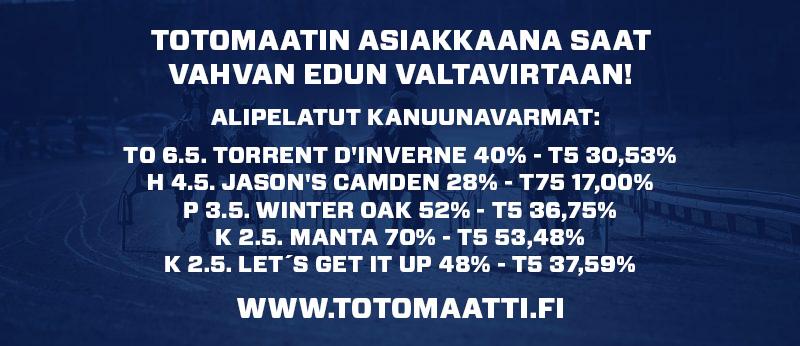 Te Toroska Tk 3.9. 9 2100/12 16,7a 2 381 c c NotBad,StarOfDa,PaperInF J Riikonen T 9.9. 6 2100/7 16,4a 6 218 c c Stoneisl,BuckLane,Expensiv F 15.9. 9 2140/2 18,5a 9 488 c c BWTIronM,NotBad,TheBossB J Hurme Tk 26.4. 3 2100/7 19,7a 7 654 c c FiglioDi,LikeYour,AmazingI M Helin-Saarine. P 3.5. 10 2100/2 m20,6 4 350 c c ElyseeAr,Zetaime,SaharaMa