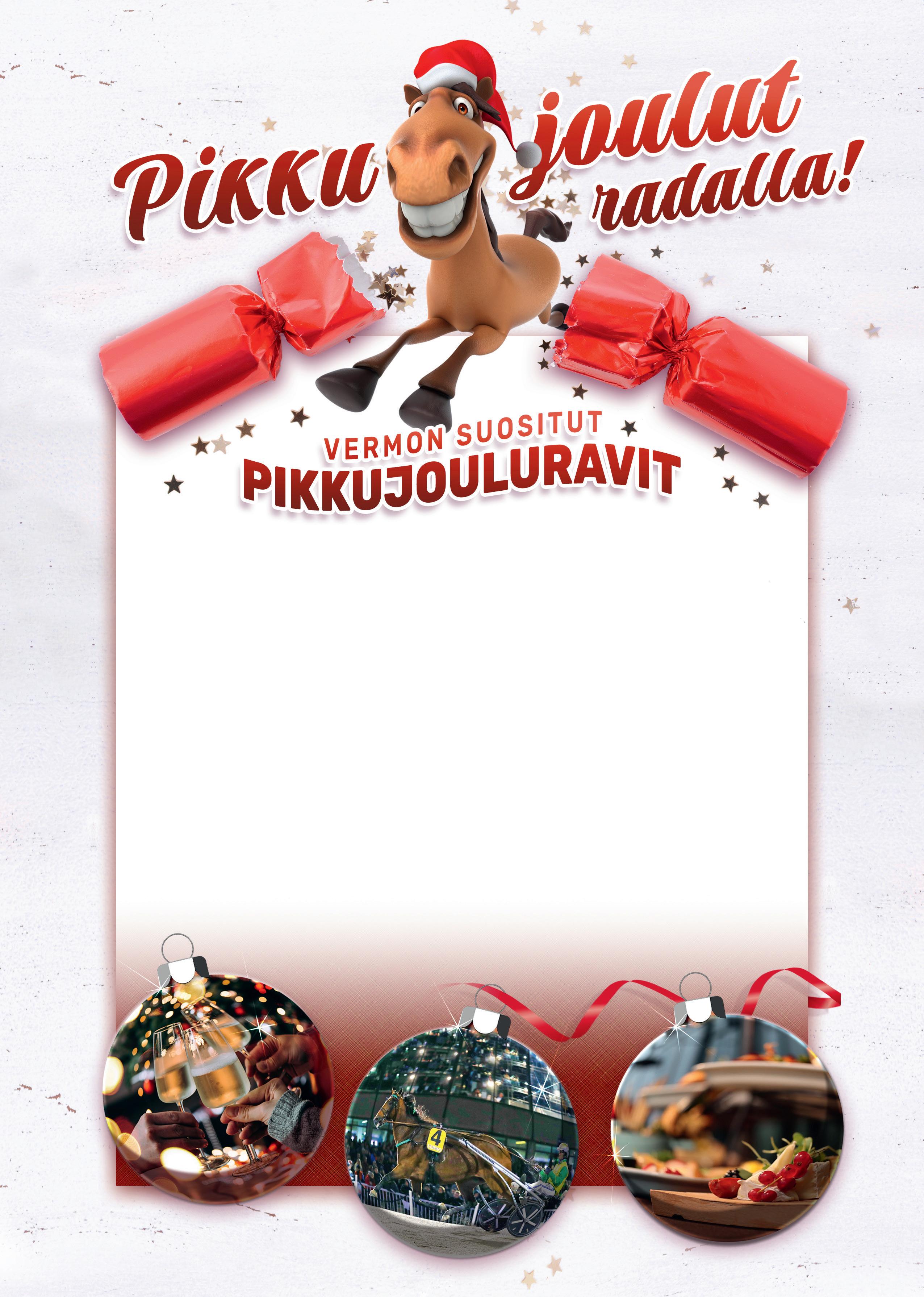 Vietä pikkujoulua erilaisen elämyksen ja maittavan ruuan parissa Vermo Areenalla. Marras-joulukuussa ravaamme pikkujoulujen merkeissä viite nä ravipäivänä. Tunnelmallinen ja tilava ravintolakatsomo Ravilla odottaa sinua – varaa paikkasi nyt!