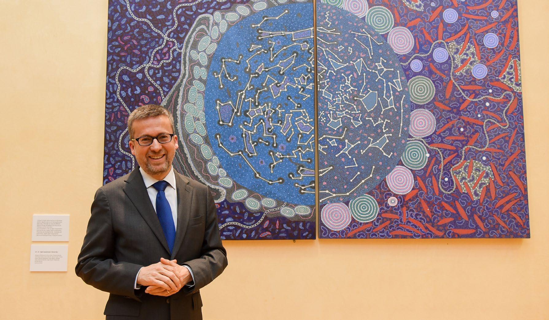 Then-EU Commissioner for Research, Innovation and Science, Carlos Moedas at the European Commission Headquarters in April 2018, where the SKAO’s indigenous astronomy art exhibition Shared Sky was on display.