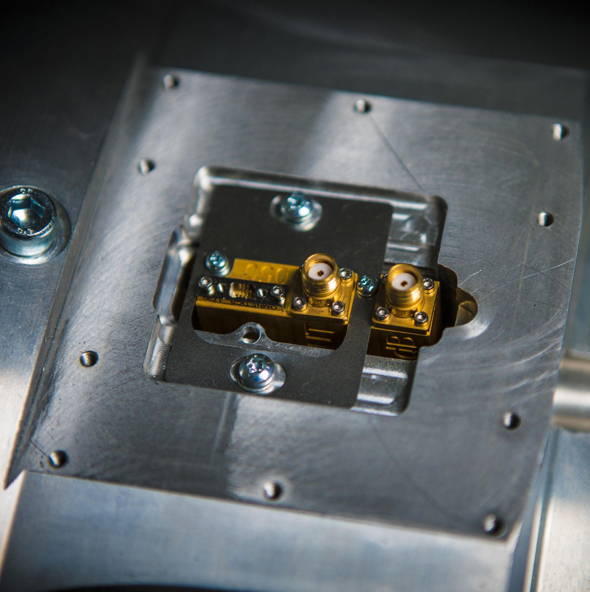 Low noise amplifiers in the band 1 receiver for for the SKA dishes. The Gothenburg company Low Noise Factory developed the unique low noise amplifiers for SKA band 1 that are visible in the middle of this image. They are specially designed for optimal performance without the need for cooling the feed.