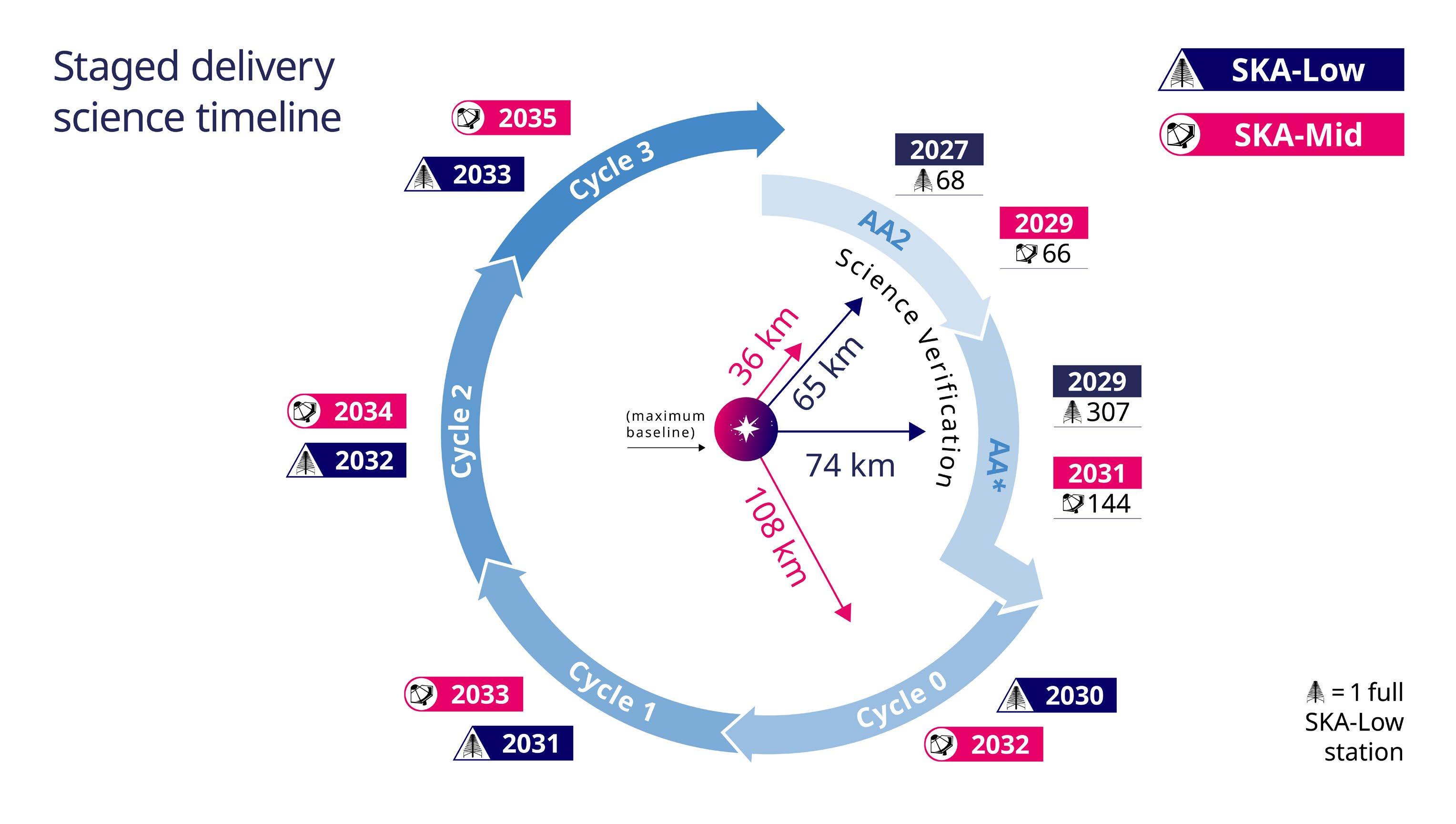 PI proposal-driven observations with the AA* arrays are scheduled to begin in 2030 for SKA-Low, and 2032 for SKA-Mid, during a phase known as Cycle 0. From this point on, specific telescope modes and capabilities will be added during each cycle. Key science projects – major science investigations involving large, international teams – are expected to start in Cycle 3, following several years of engagement with the community to refine the projects.