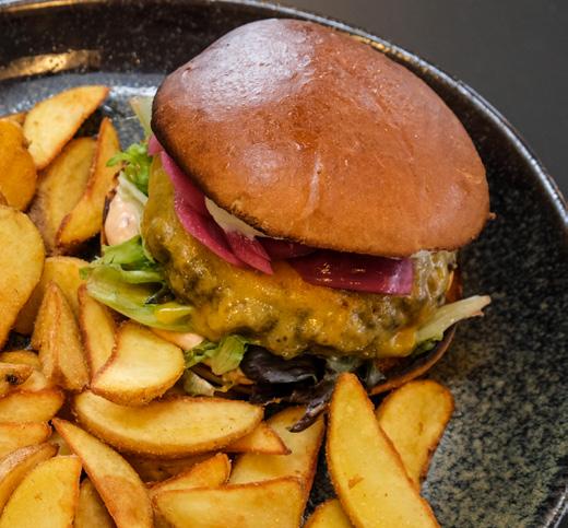 Danish beef patty au gratin, brioche bun with homemade aioli, chipotle mayo, lettuce, tomato and pickled red onion, served with potato wedges and dip .......... kr. 159,-