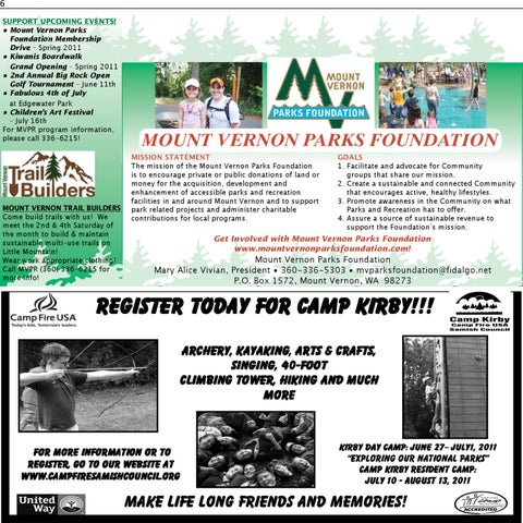 Support Upcoming Events! • Mount Vernon Parks Foundation Membership Drive – Spring 2011 • Kiwanis Boardwalk Grand Opening – Spring 2011 • 2nd Annual Big Rock Open Golf Tournament – June 11th • Fabulous 4th of July at Edgewater Park • Children’s Art Festival – July 16th For MVPR program information, please call 336-6215!
