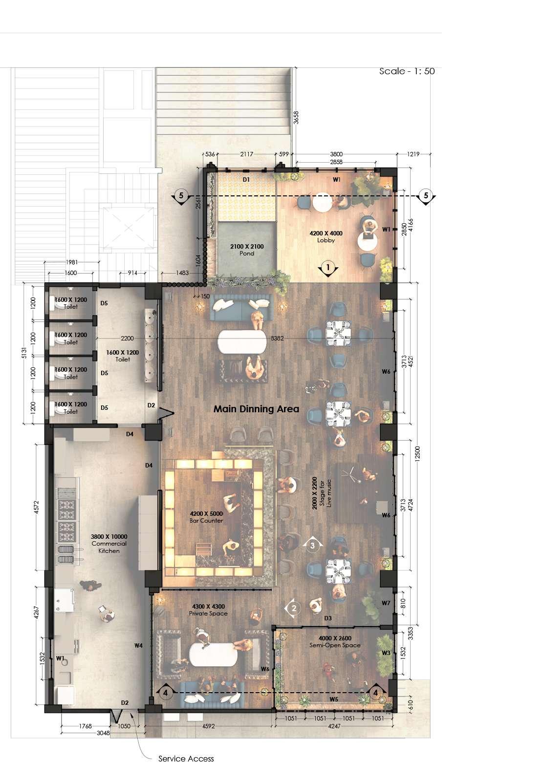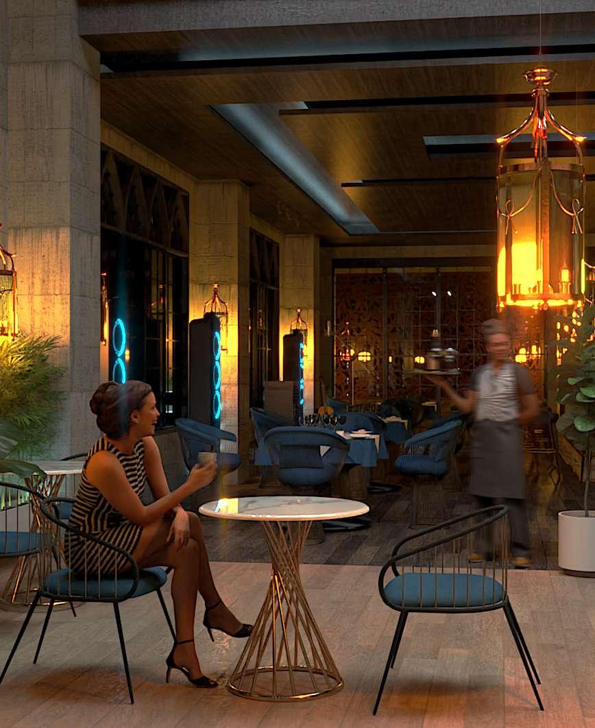The cafe/restaurant is located in Mangaluru city, the requirements presented for the design was to create an ambient environment with a dark theme, but by using pastel colors. The client wanted to include a small water body in the cafe and have a sense of openness and not have any form of separation at the same time maintaining a sense of privacy. The client also wanted to integrate nature and live music into the design and specifically requested for arched openings.