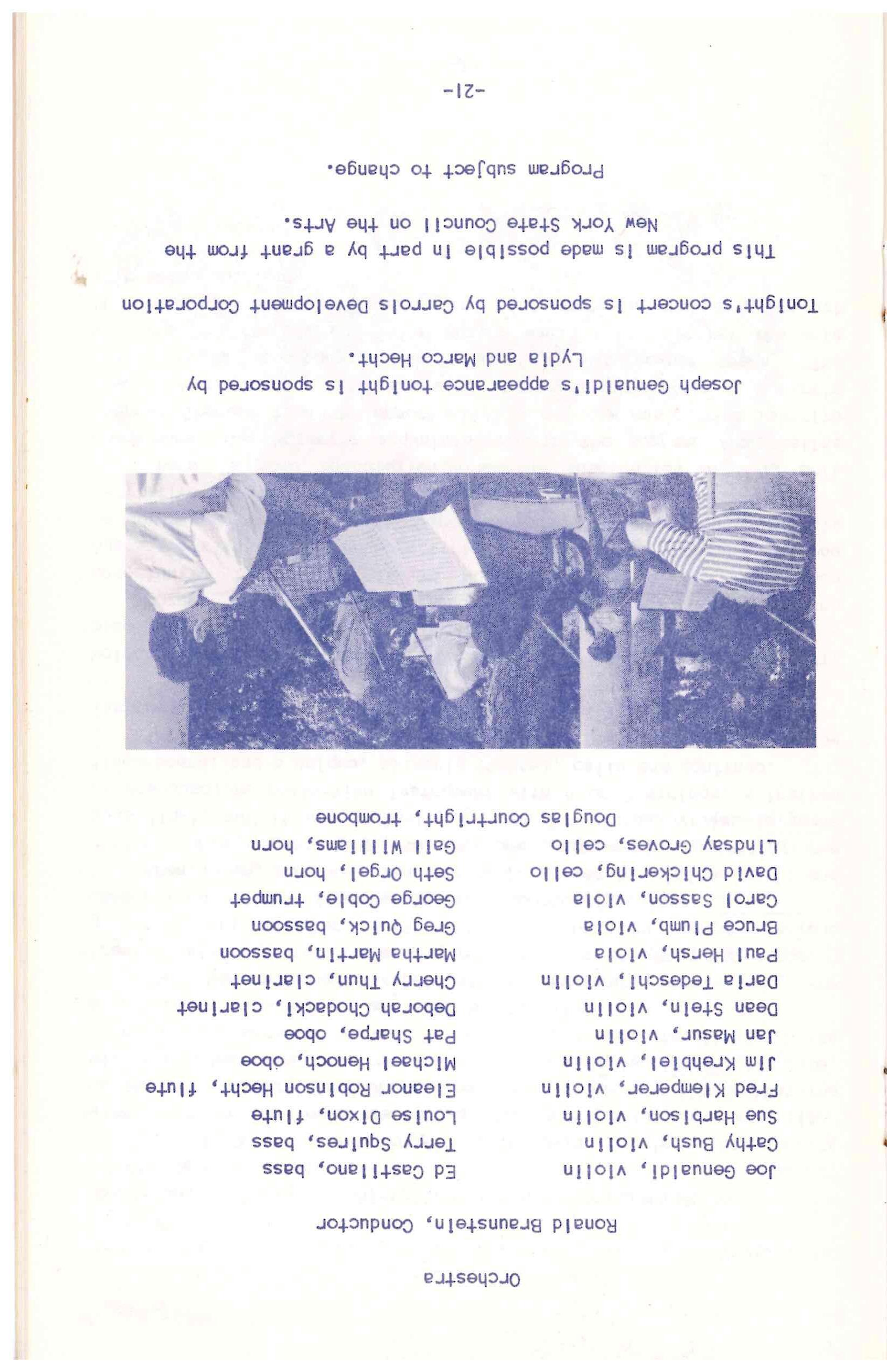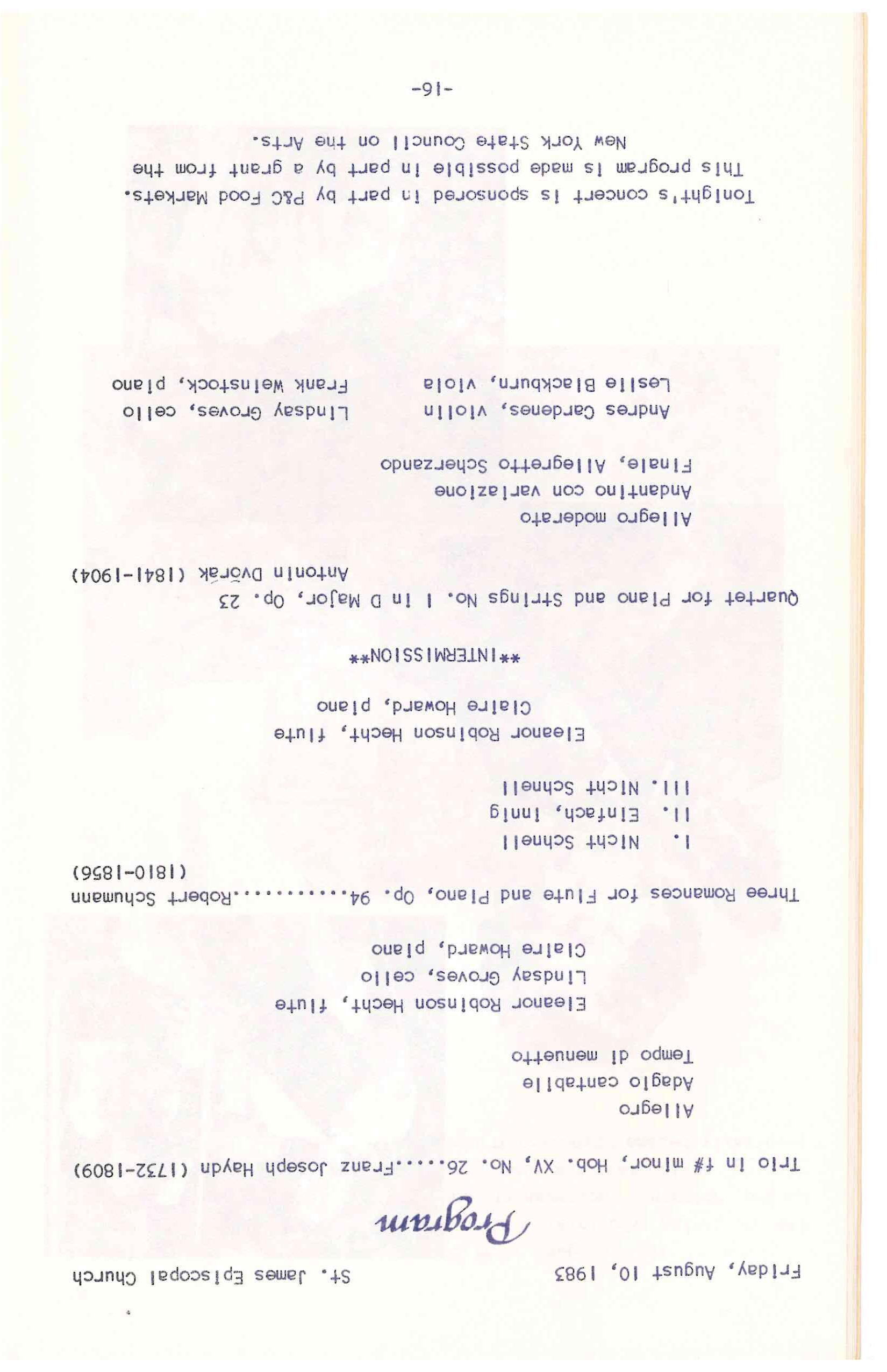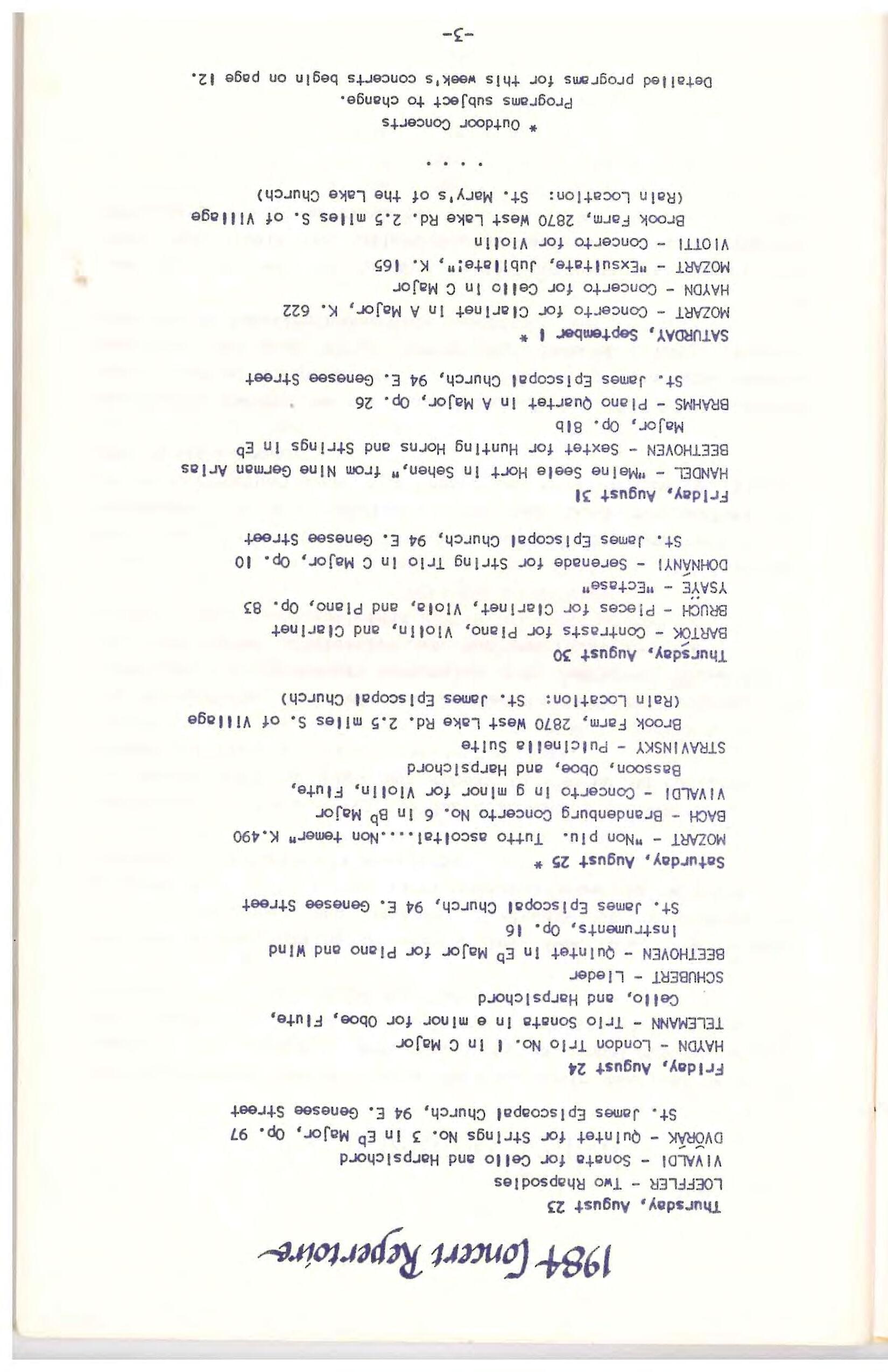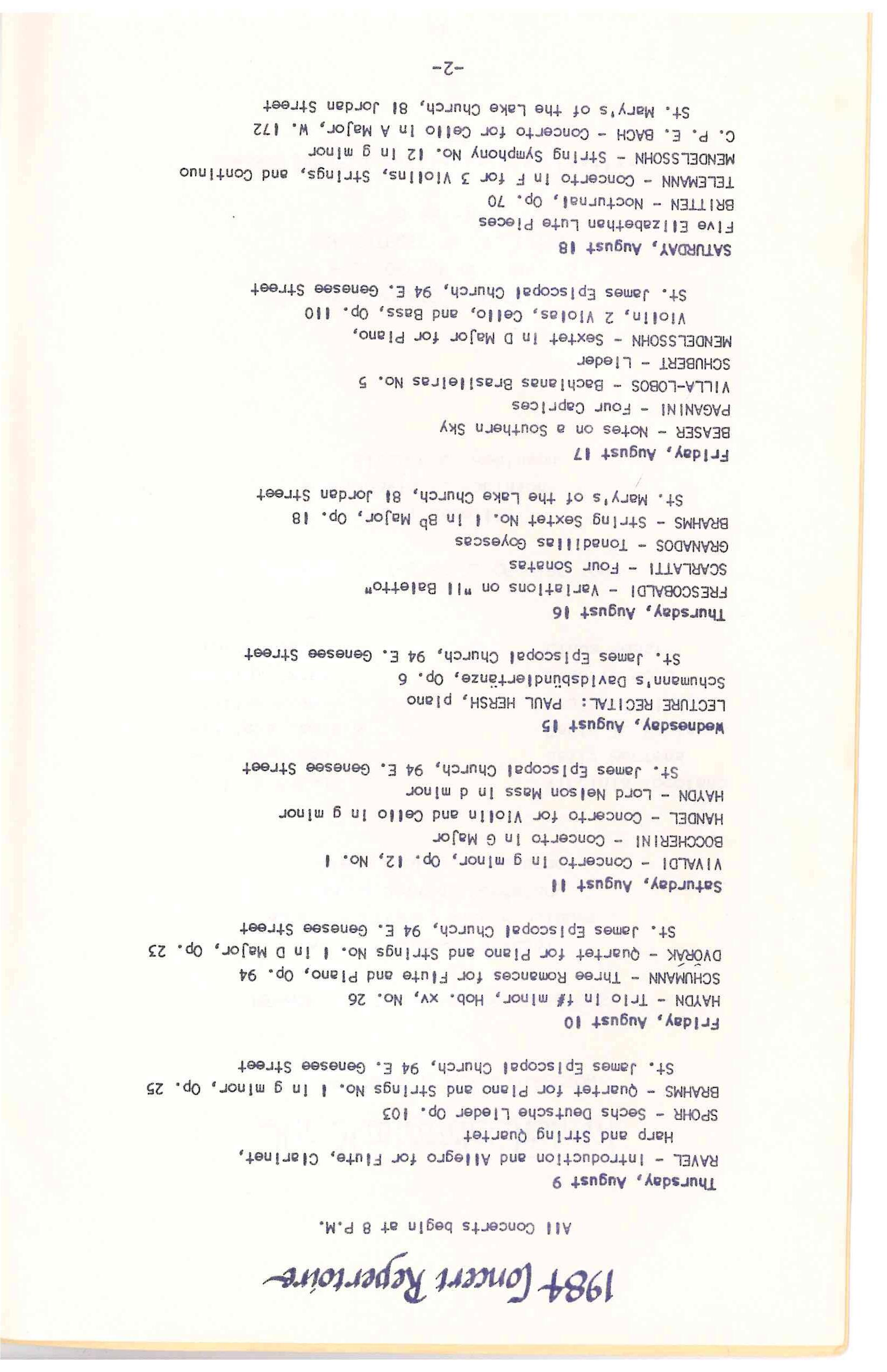 Violinist Andres Cardenes makes his Festival debut Aug. 9 in Brahms’ Piano Quartet No. 1 in G Minor and Dvořák’s Quartet No. 1 in D Major. The Syracuse Vocal Ensemble, conducted by G. Burton Harbison, performs Haydn’s Lord Nelson Mass. Guitarist Eliot Fisk performs eight pieces over three nights. Jonathan McPhee conducts the final concert, featuring Larry Combs in Mozart’s Clarinet Concerto in A Major, Steven Doane in Haydn’s Cello Concerto in C Major, Joseph Genualdi in Viotti’s Concerto in A Minor, and soprano Julie Newell in Mozart’s Exsultate, Jubilate!
