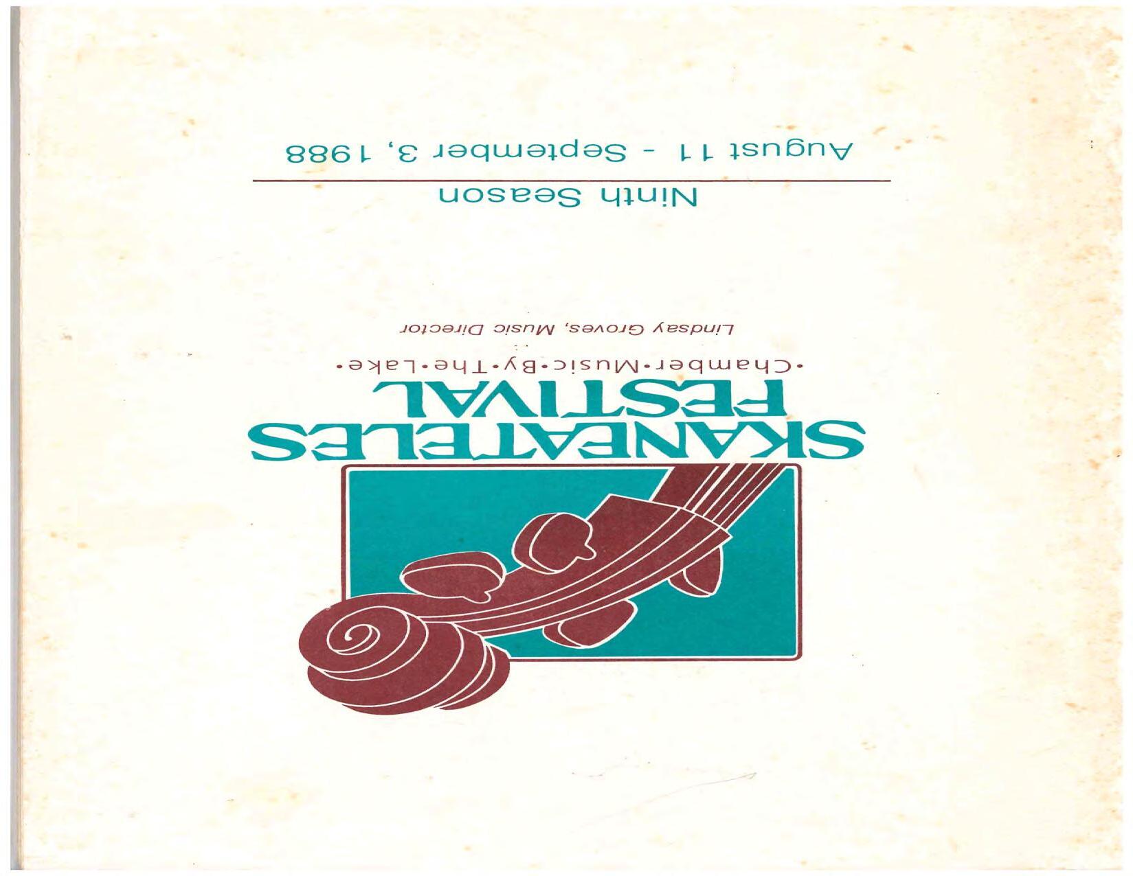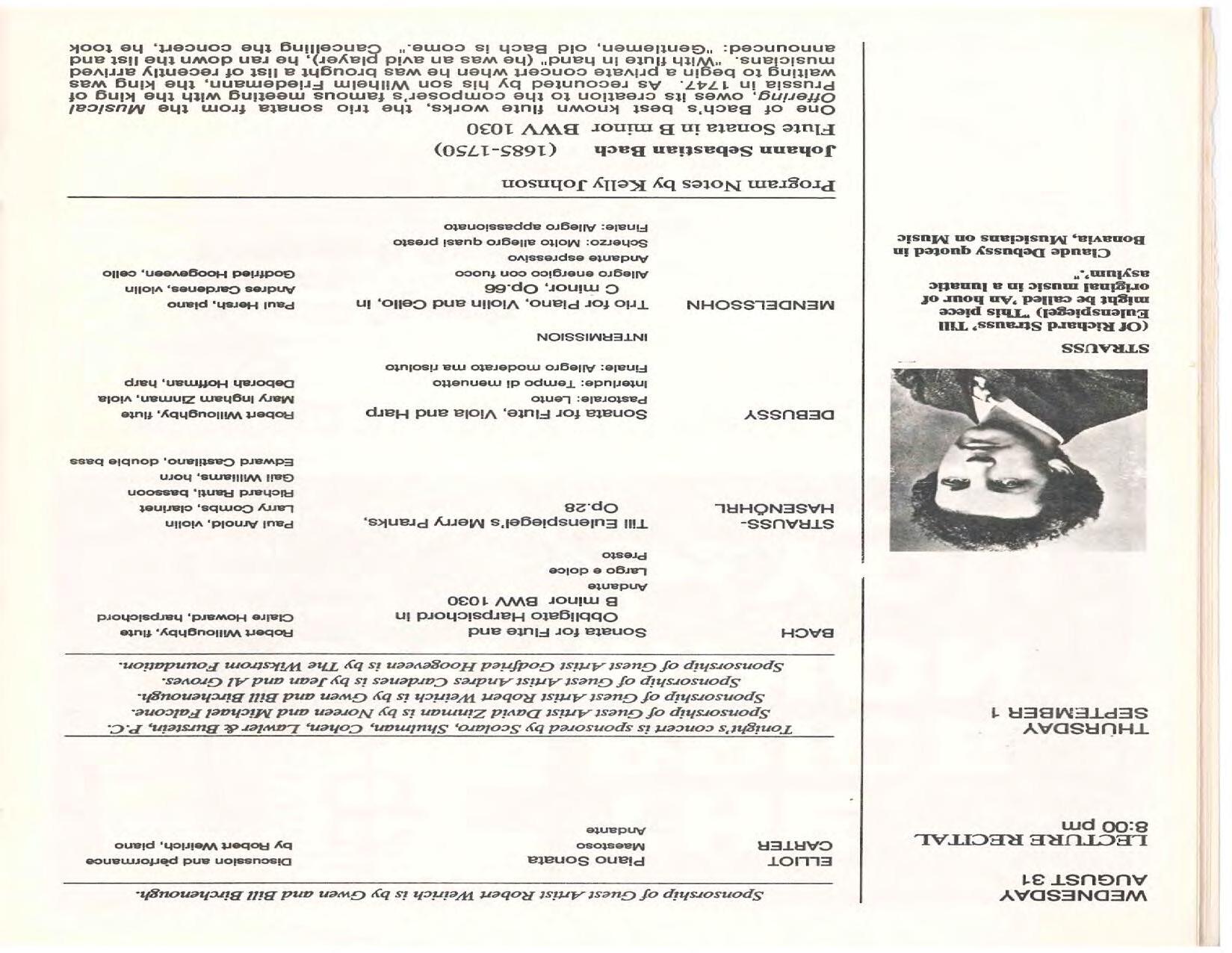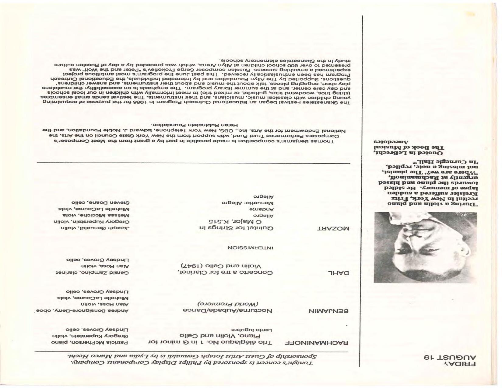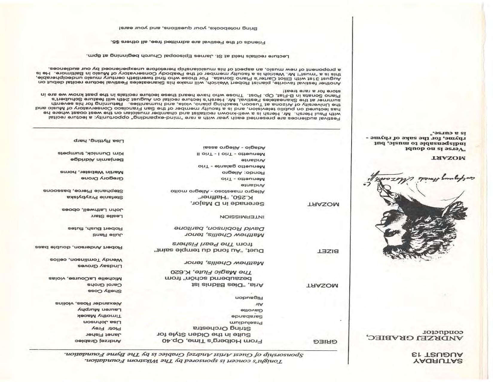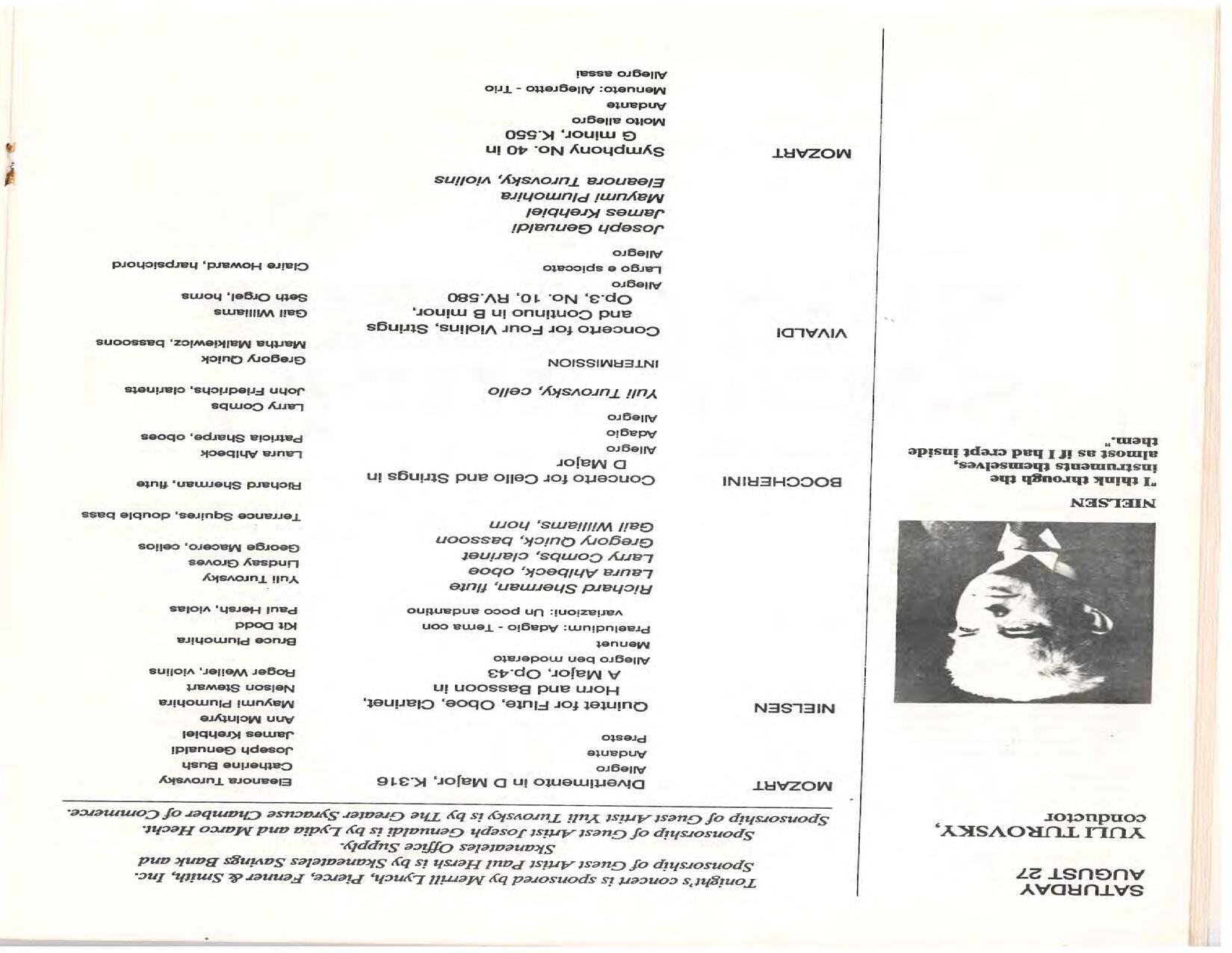 The Festival Educational Outreach Program presents Prokofiev’s Peter and the Wolf to 900 schoolchildren at Allyn Arena in June. Thomas Benjamin’s Nocturne/Aubade/Danse has its world premiere, with Andrea Bonsignore-Berry, oboe; Alan Ross, violin; Michelle LaCourse, viola; and Lindsay Groves, cello. Robert Weirich gives his first lecture-recital, on Elliott Carter’s Piano Sonata. Cellist Yuli Turovsky plays in Schubert’s Quintet for Strings, D. 956 and Tchaikovsky’s sextet Souvenir of Florence, solos in Boccherini’s Concerto for Cello and Strings, and conducts Mozart’s Symphony No. 40. Robert Weirich plays Mozart’s Piano Concerto No. 22 in the final concert, David Zinman conducting.