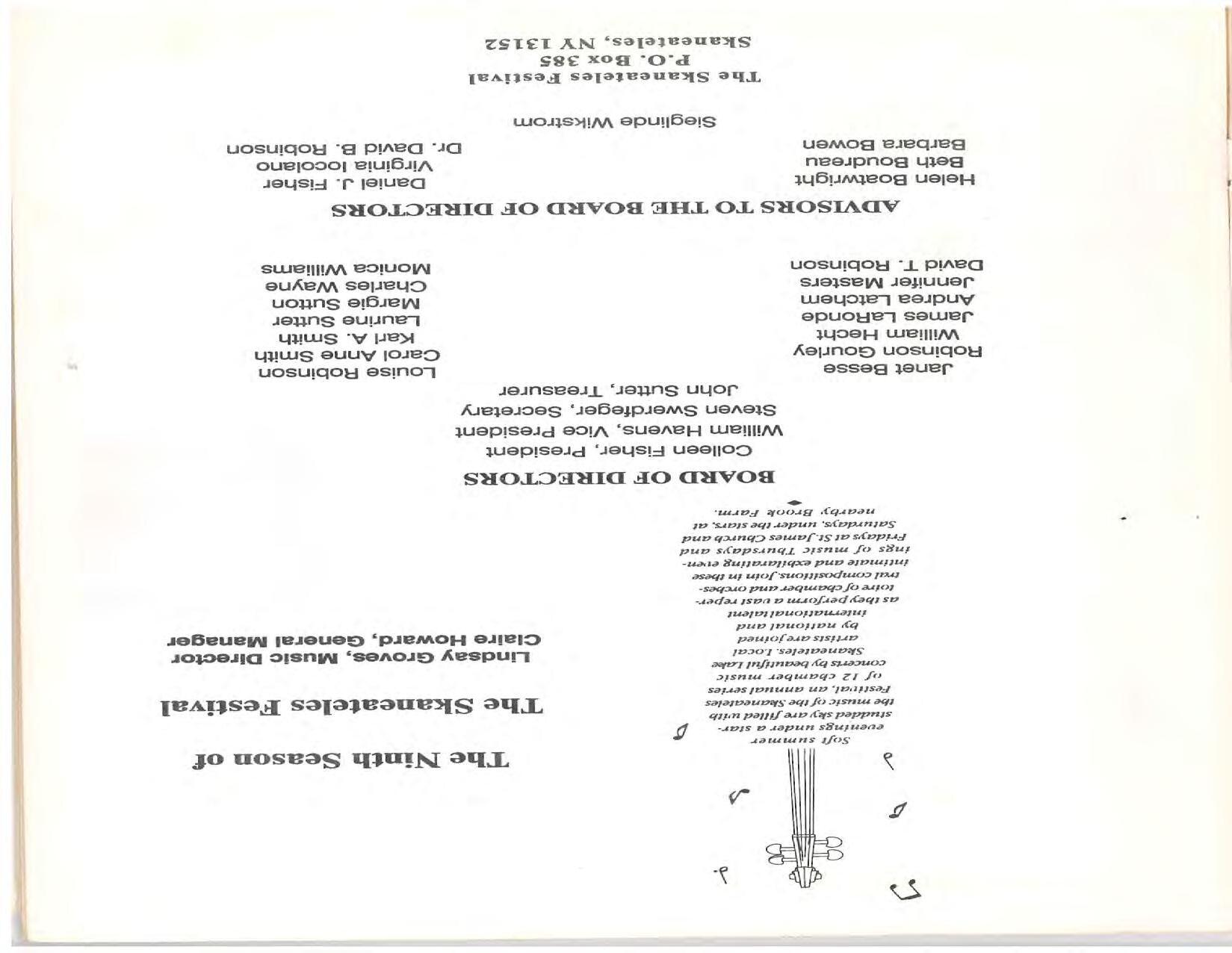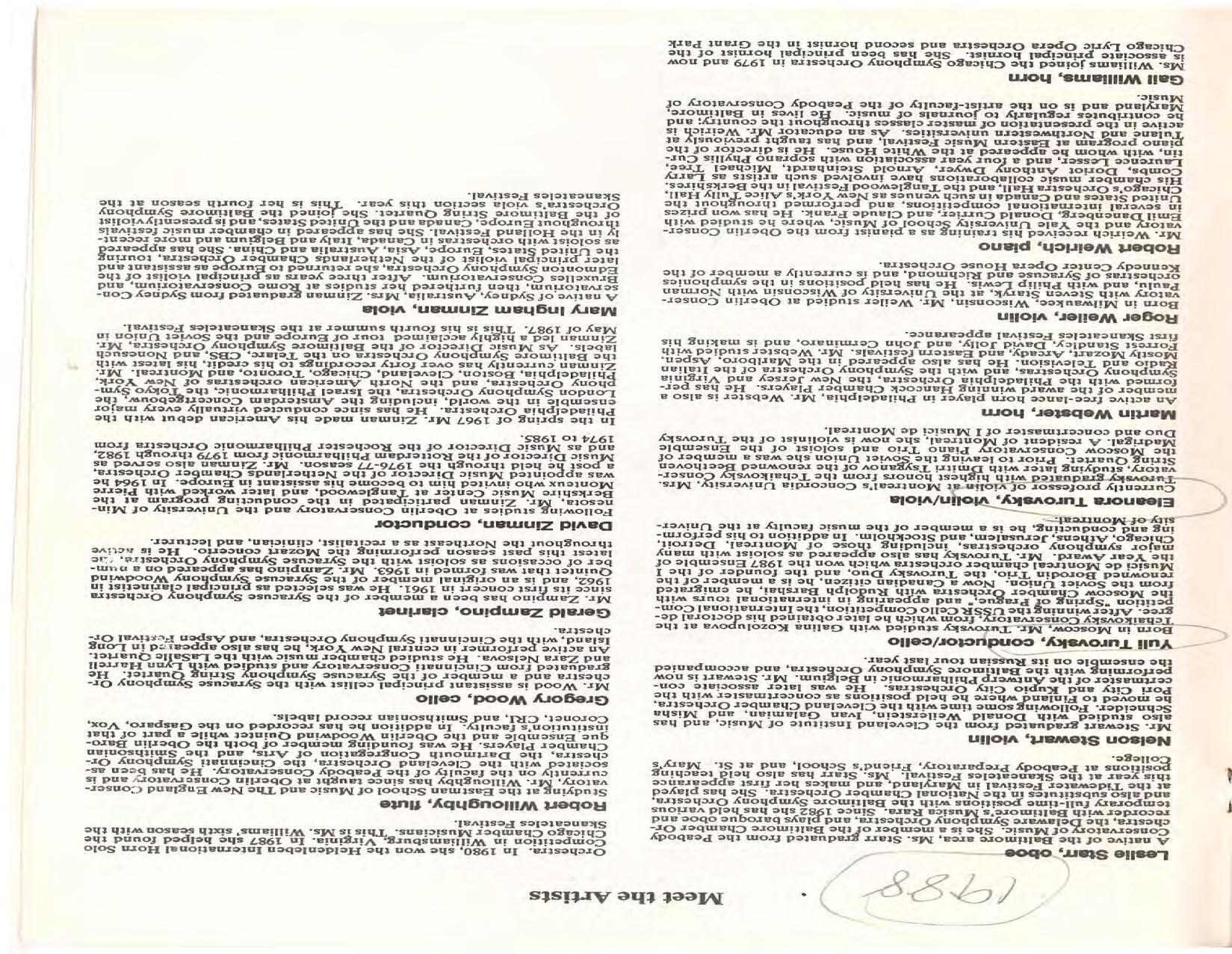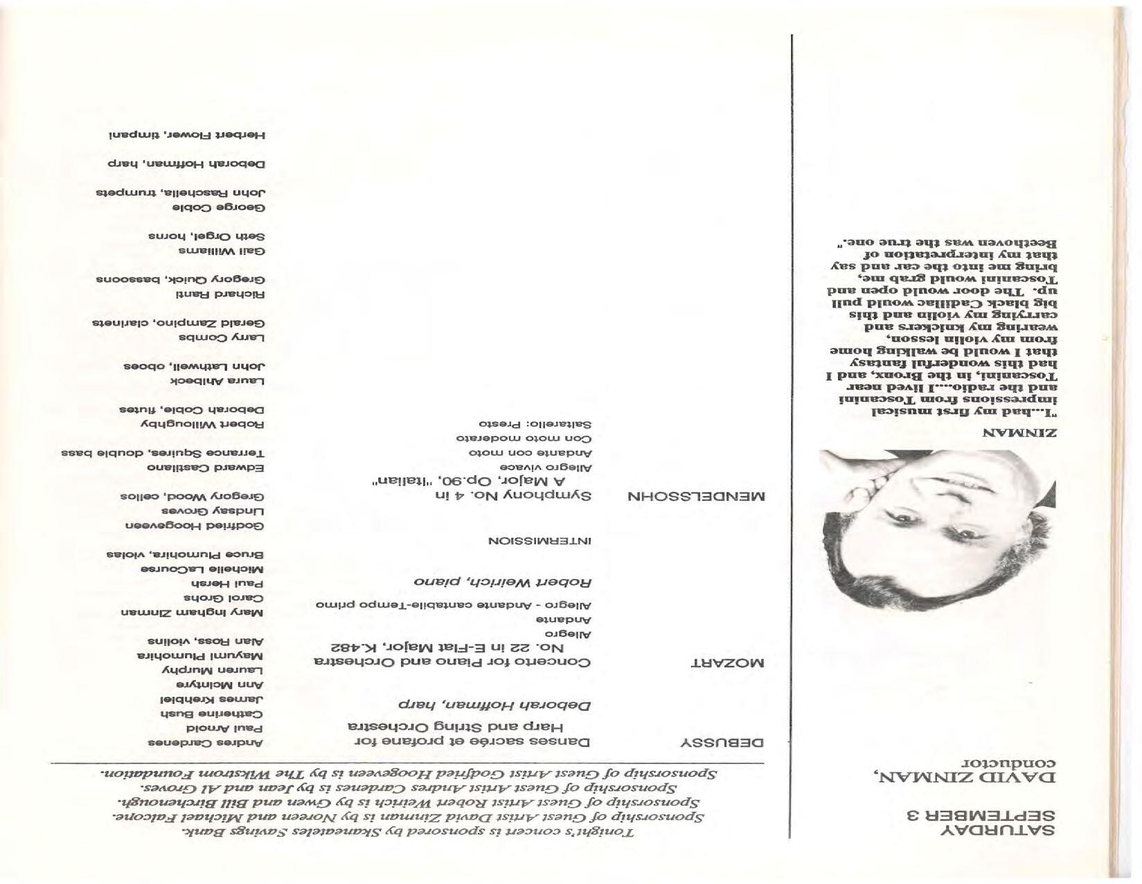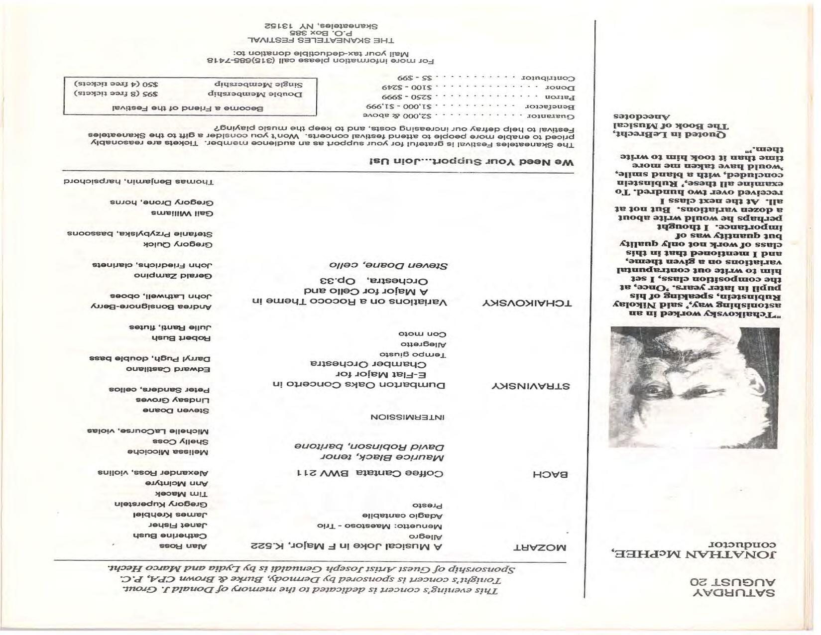 The Festival Educational Outreach Program presents Prokofiev’s Peter and the Wolf to 900 schoolchildren at Allyn Arena in June. Thomas Benjamin’s Nocturne/Aubade/Danse has its world premiere, with Andrea Bonsignore-Berry, oboe; Alan Ross, violin; Michelle LaCourse, viola; and Lindsay Groves, cello. Robert Weirich gives his first lecture-recital, on Elliott Carter’s Piano Sonata. Cellist Yuli Turovsky plays in Schubert’s Quintet for Strings, D. 956 and Tchaikovsky’s sextet Souvenir of Florence, solos in Boccherini’s Concerto for Cello and Strings, and conducts Mozart’s Symphony No. 40. Robert Weirich plays Mozart’s Piano Concerto No. 22 in the final concert, David Zinman conducting.