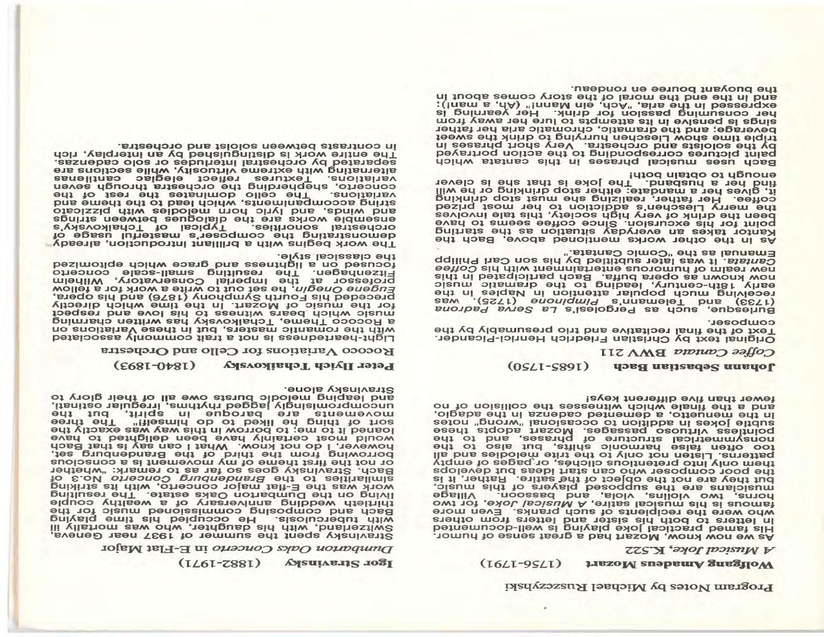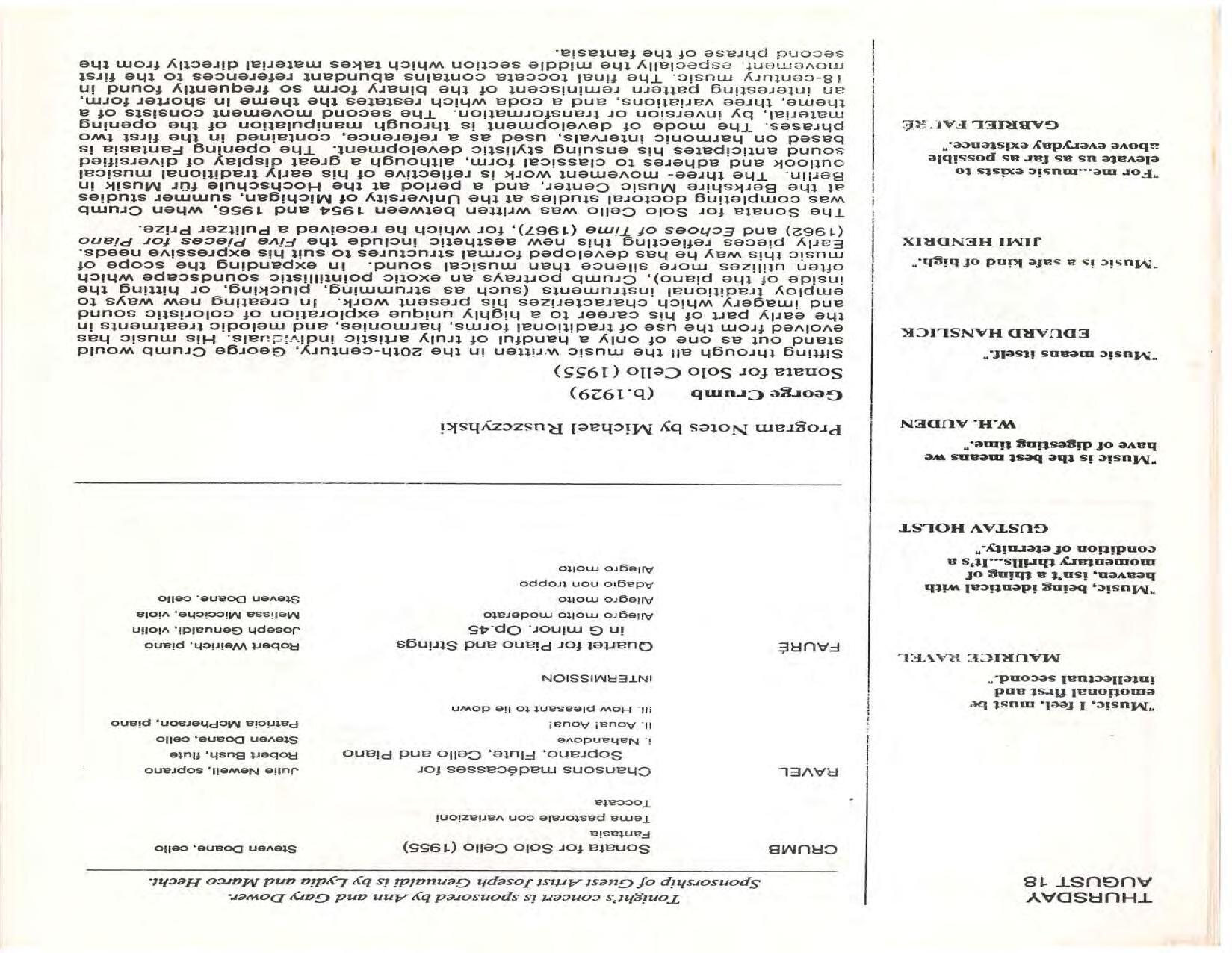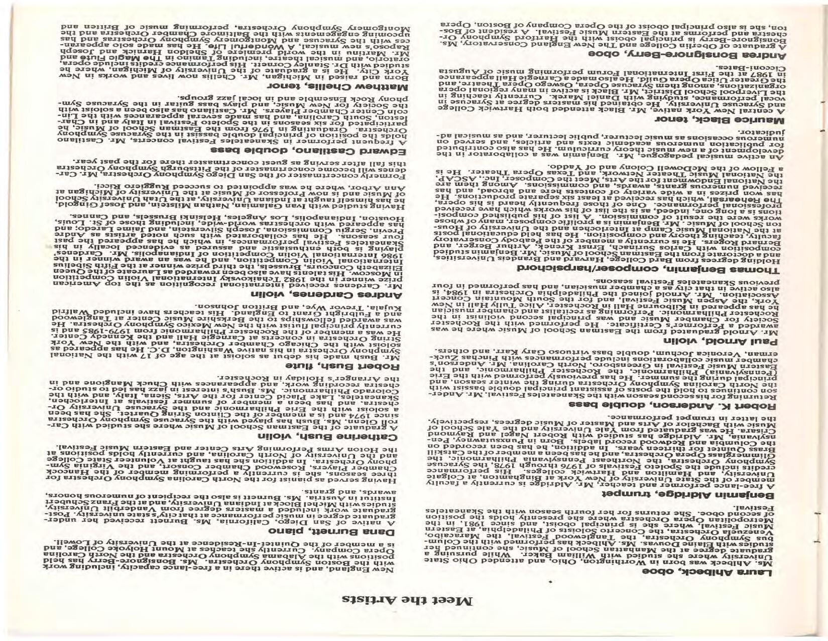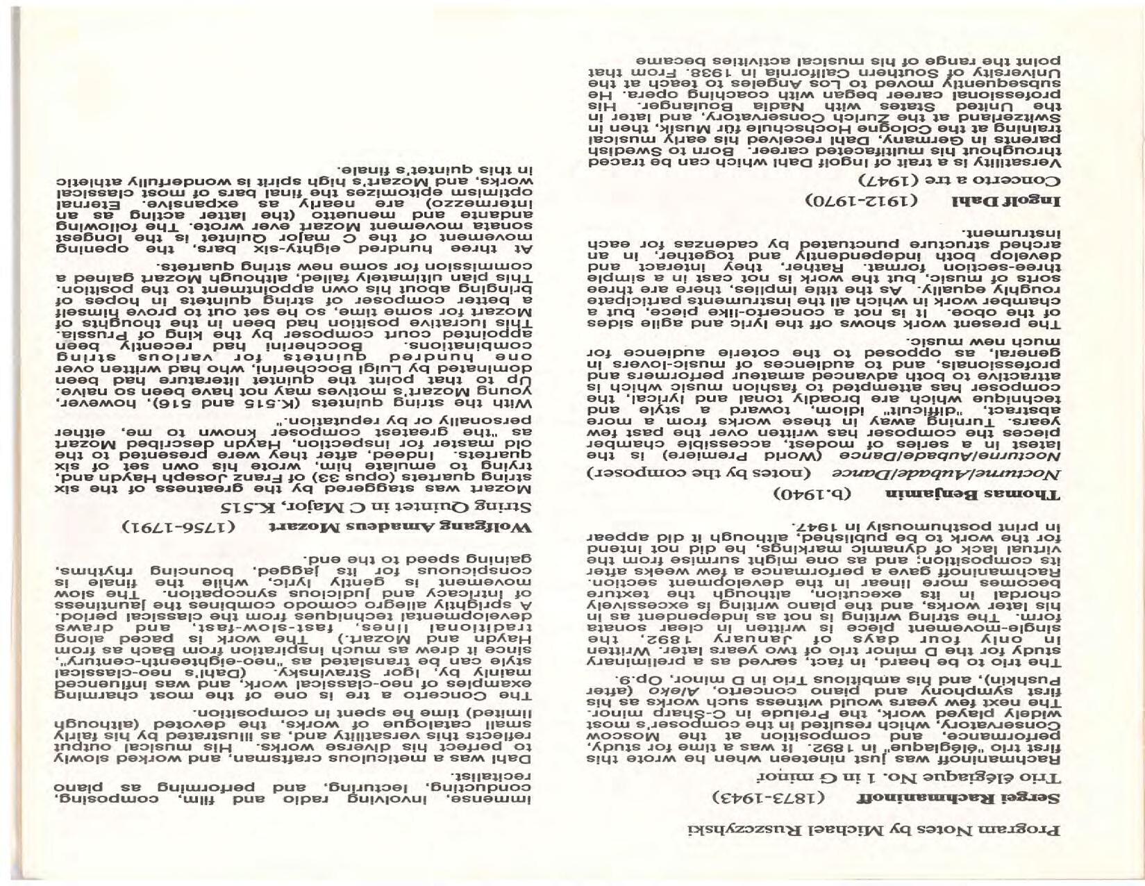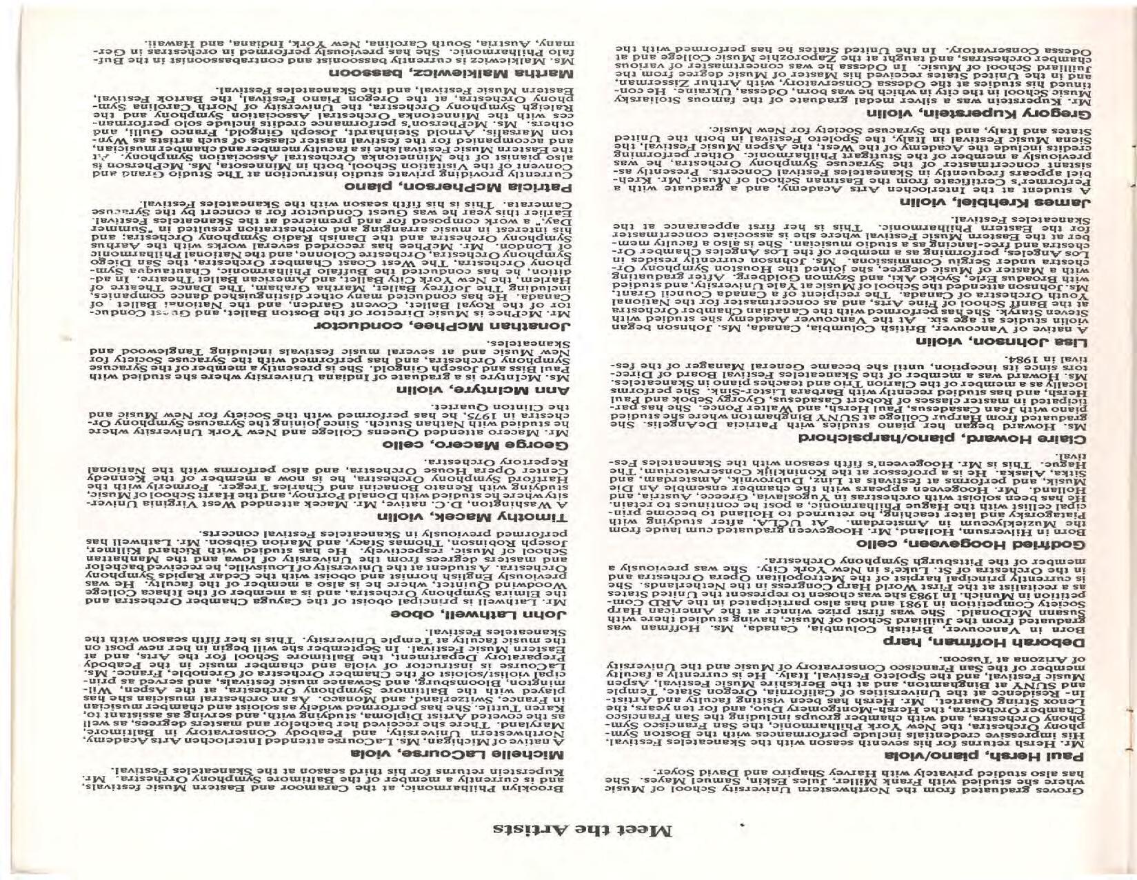The Festival Educational Outreach Program presents Prokofiev’s Peter and the Wolf to 900 schoolchildren at Allyn Arena in June. Thomas Benjamin’s Nocturne/Aubade/Danse has its world premiere, with Andrea Bonsignore-Berry, oboe; Alan Ross, violin; Michelle LaCourse, viola; and Lindsay Groves, cello. Robert Weirich gives his first lecture-recital, on Elliott Carter’s Piano Sonata. Cellist Yuli Turovsky plays in Schubert’s Quintet for Strings, D. 956 and Tchaikovsky’s sextet Souvenir of Florence, solos in Boccherini’s Concerto for Cello and Strings, and conducts Mozart’s Symphony No. 40. Robert Weirich plays Mozart’s Piano Concerto No. 22 in the final concert, David Zinman conducting.