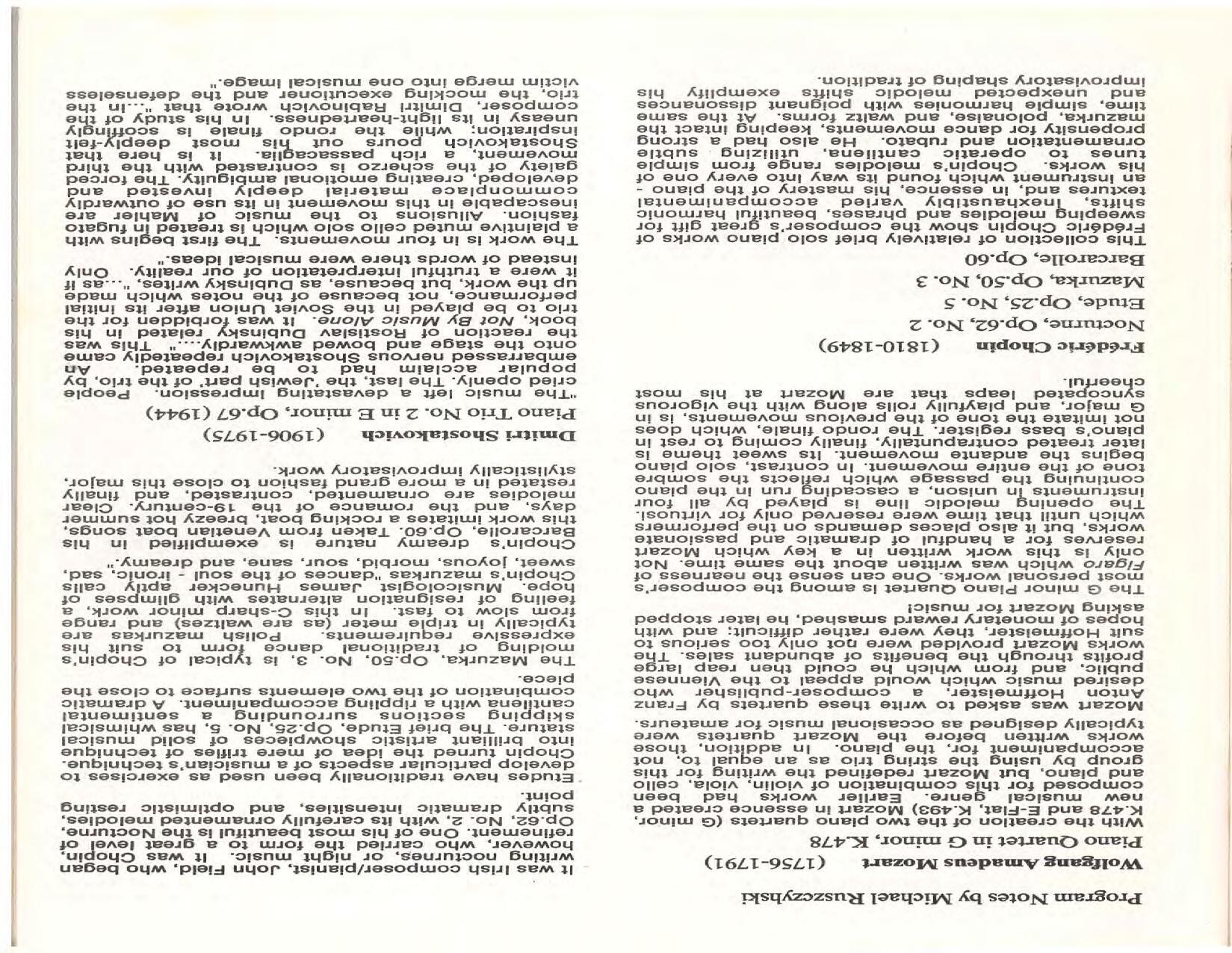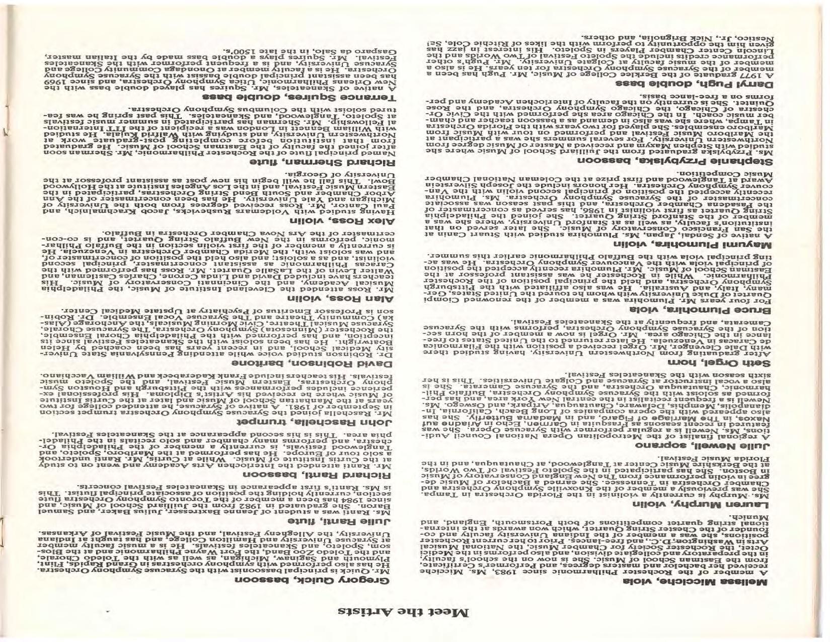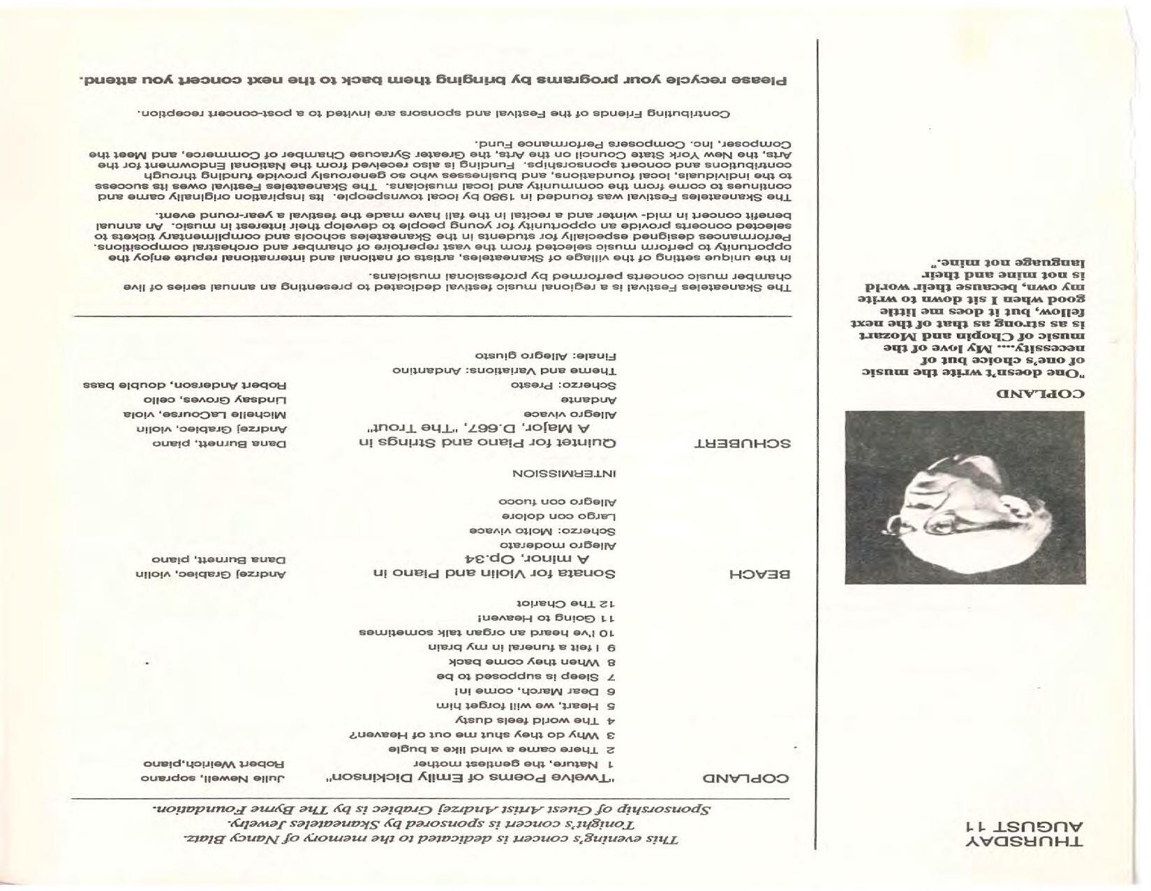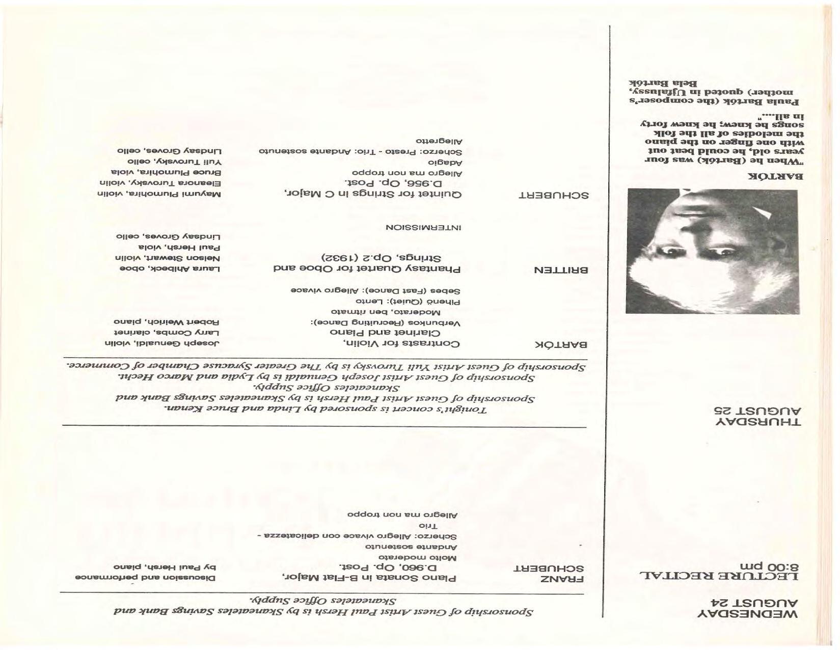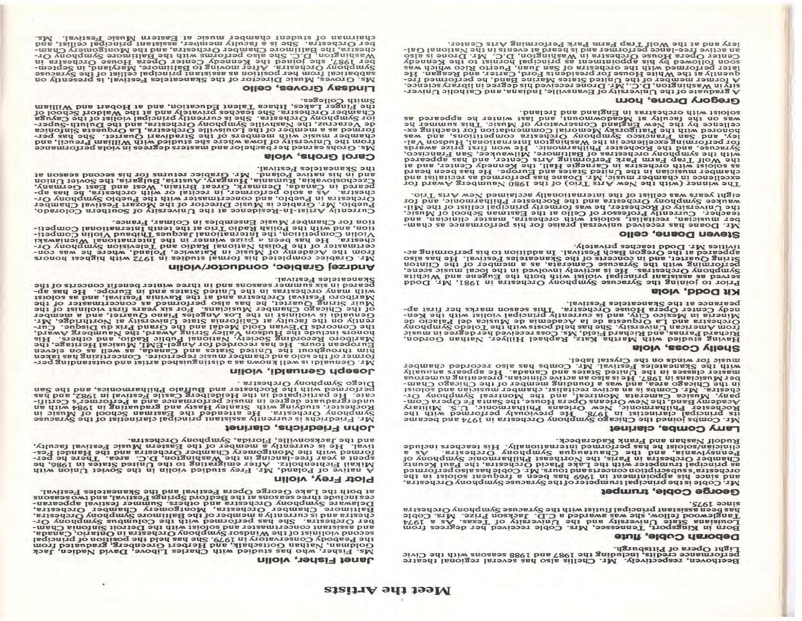 The Festival Educational Outreach Program presents Prokofiev’s Peter and the Wolf to 900 schoolchildren at Allyn Arena in June. Thomas Benjamin’s Nocturne/Aubade/Danse has its world premiere, with Andrea Bonsignore-Berry, oboe; Alan Ross, violin; Michelle LaCourse, viola; and Lindsay Groves, cello. Robert Weirich gives his first lecture-recital, on Elliott Carter’s Piano Sonata. Cellist Yuli Turovsky plays in Schubert’s Quintet for Strings, D. 956 and Tchaikovsky’s sextet Souvenir of Florence, solos in Boccherini’s Concerto for Cello and Strings, and conducts Mozart’s Symphony No. 40. Robert Weirich plays Mozart’s Piano Concerto No. 22 in the final concert, David Zinman conducting.
