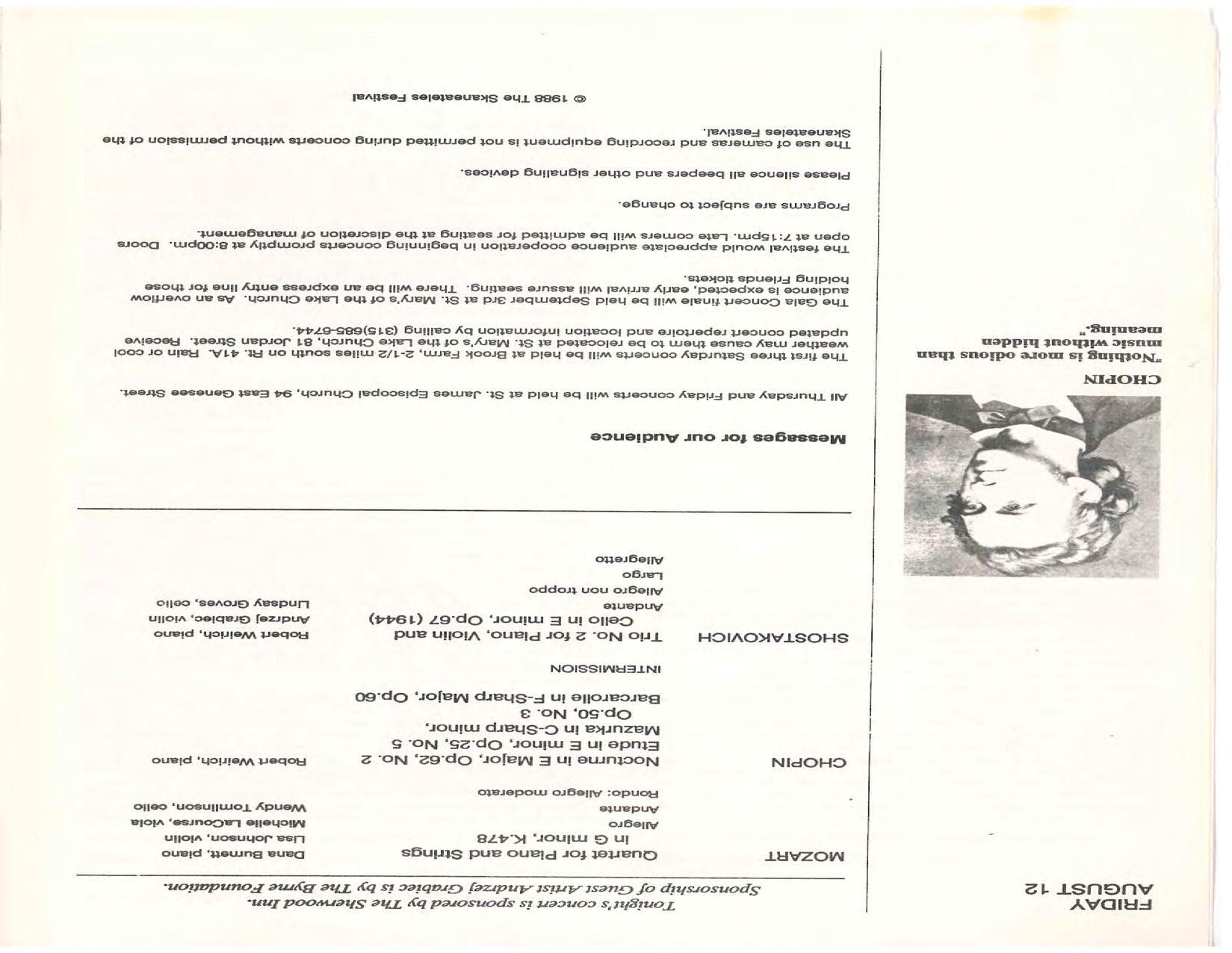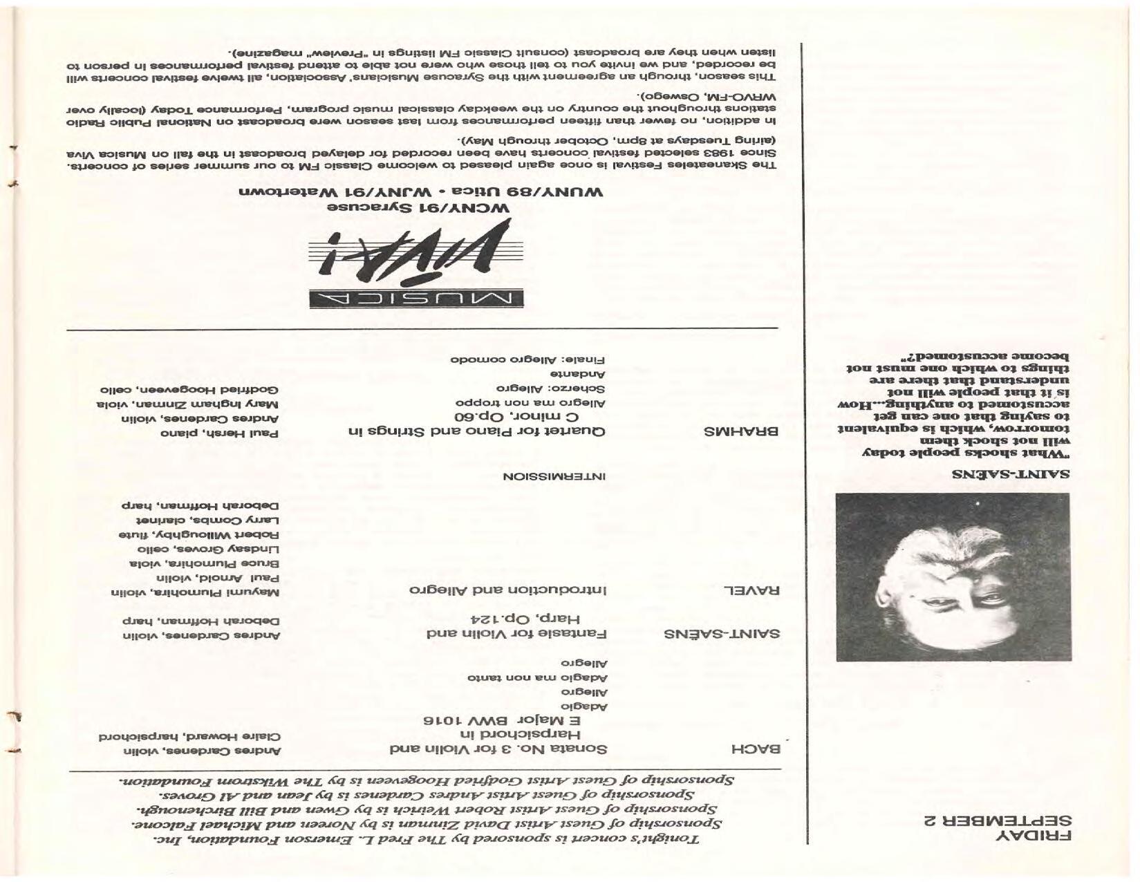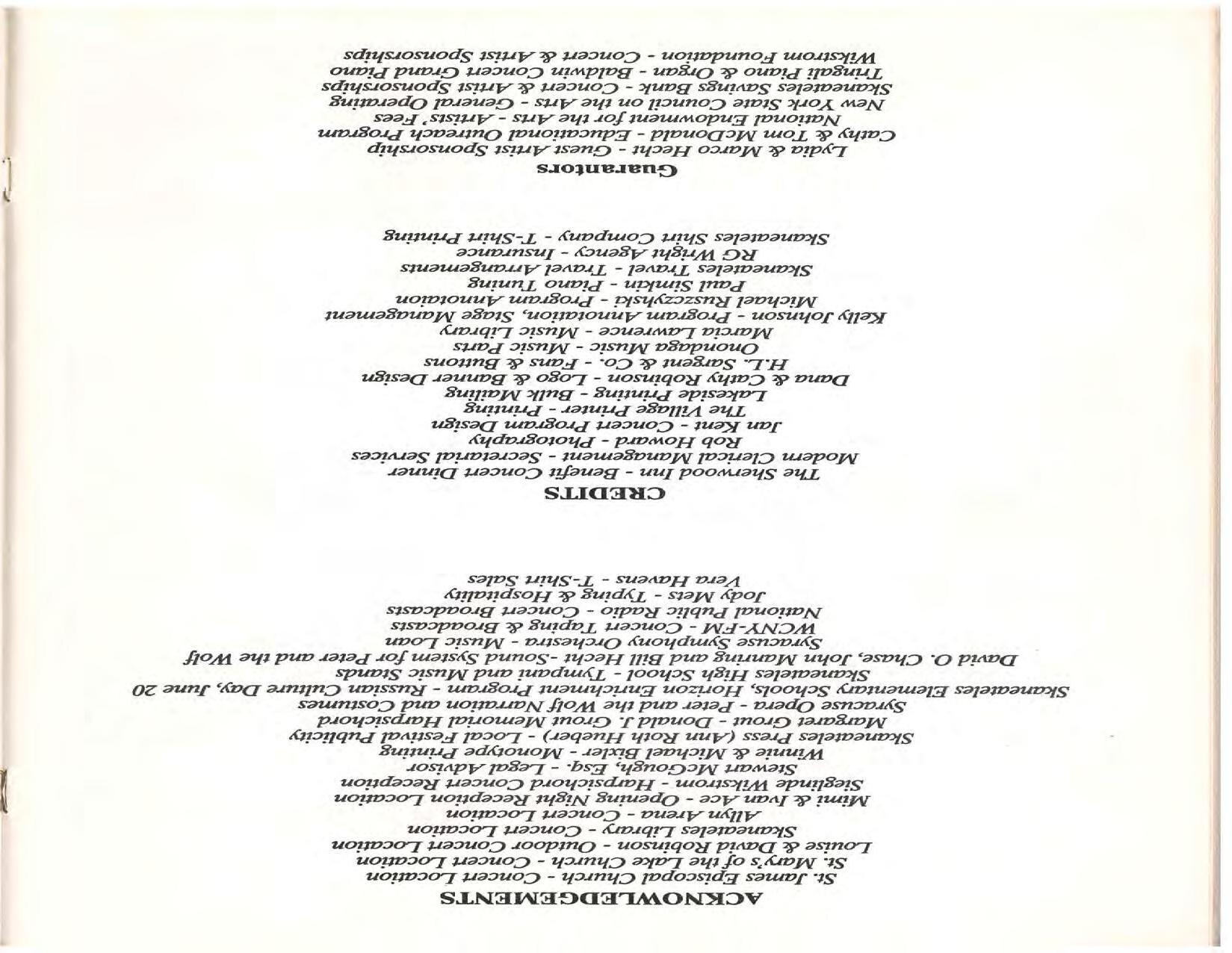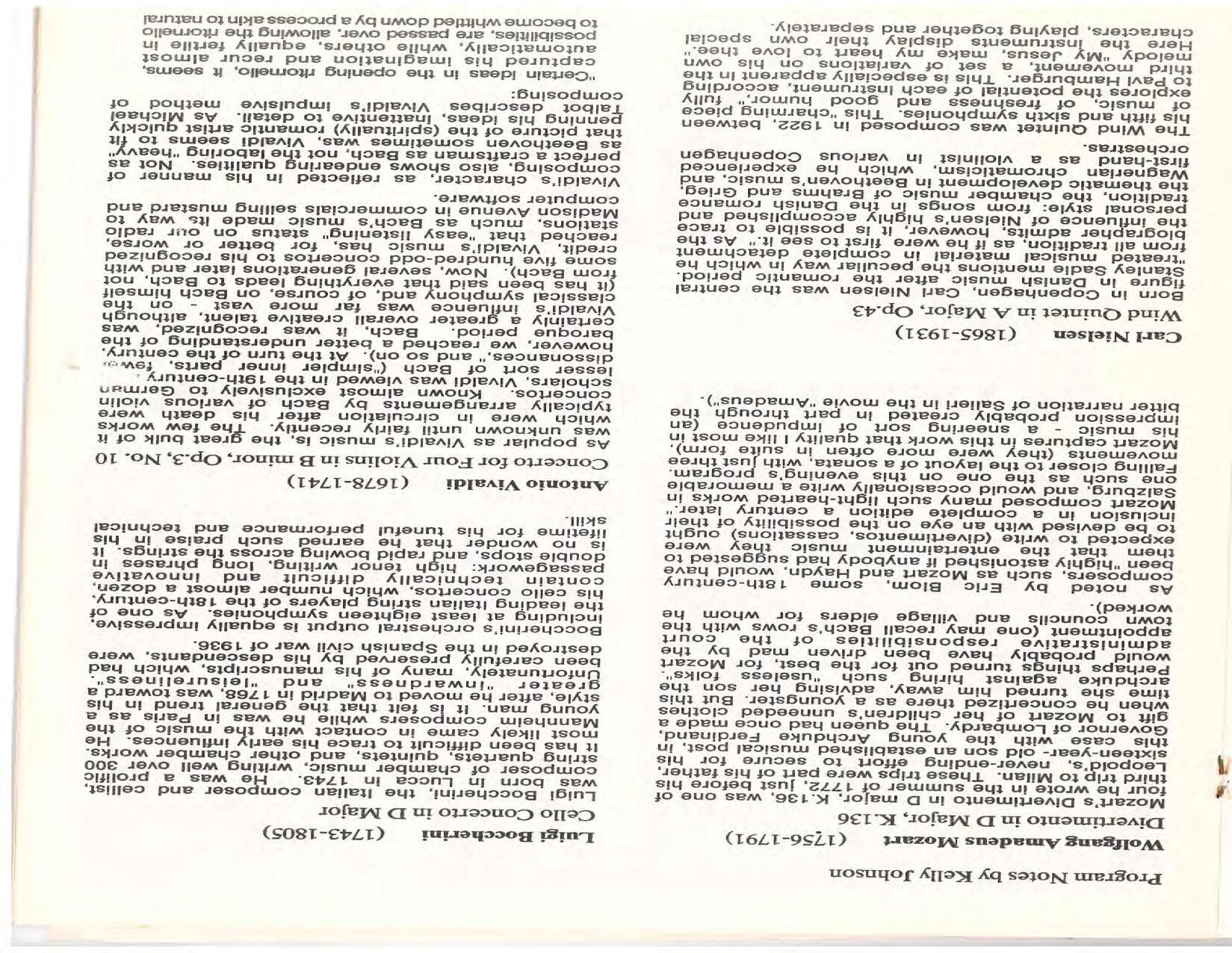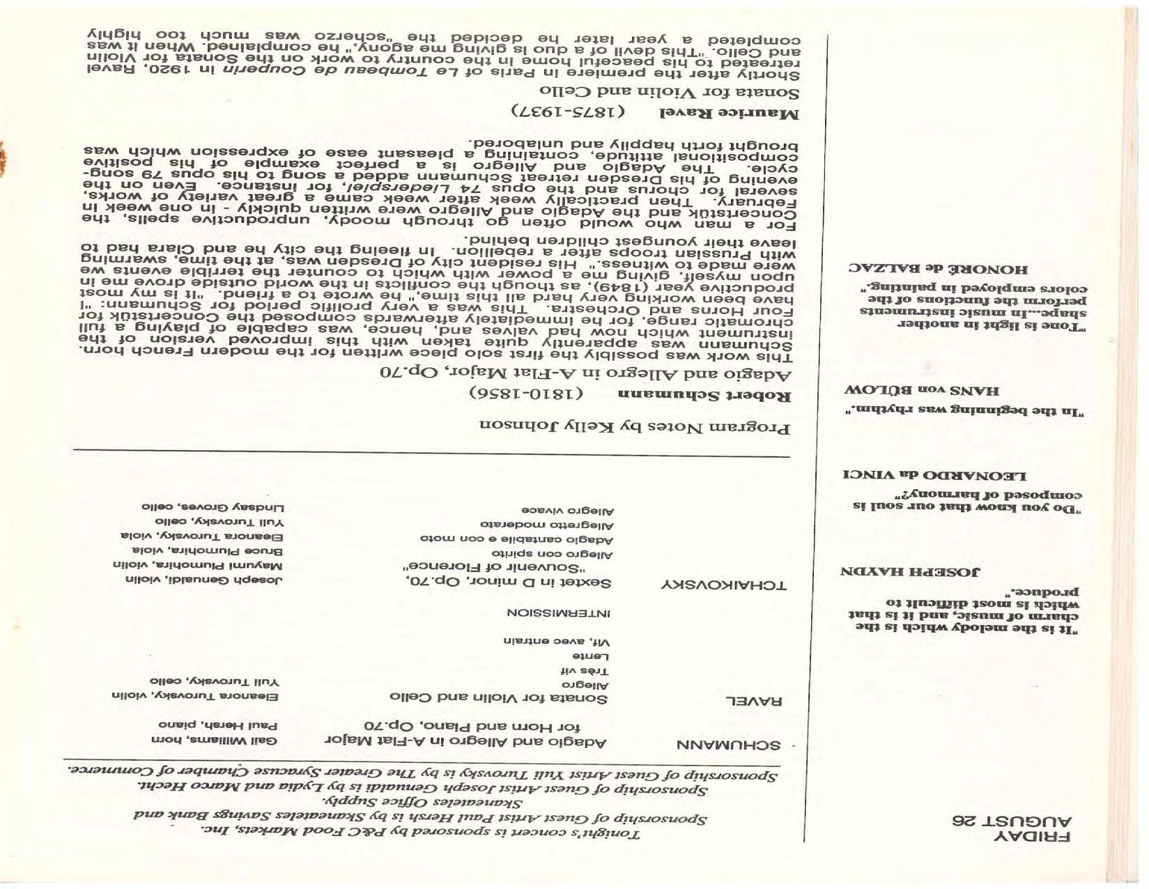 The Festival Educational Outreach Program presents Prokofiev’s Peter and the Wolf to 900 schoolchildren at Allyn Arena in June. Thomas Benjamin’s Nocturne/Aubade/Danse has its world premiere, with Andrea Bonsignore-Berry, oboe; Alan Ross, violin; Michelle LaCourse, viola; and Lindsay Groves, cello. Robert Weirich gives his first lecture-recital, on Elliott Carter’s Piano Sonata. Cellist Yuli Turovsky plays in Schubert’s Quintet for Strings, D. 956 and Tchaikovsky’s sextet Souvenir of Florence, solos in Boccherini’s Concerto for Cello and Strings, and conducts Mozart’s Symphony No. 40. Robert Weirich plays Mozart’s Piano Concerto No. 22 in the final concert, David Zinman conducting.