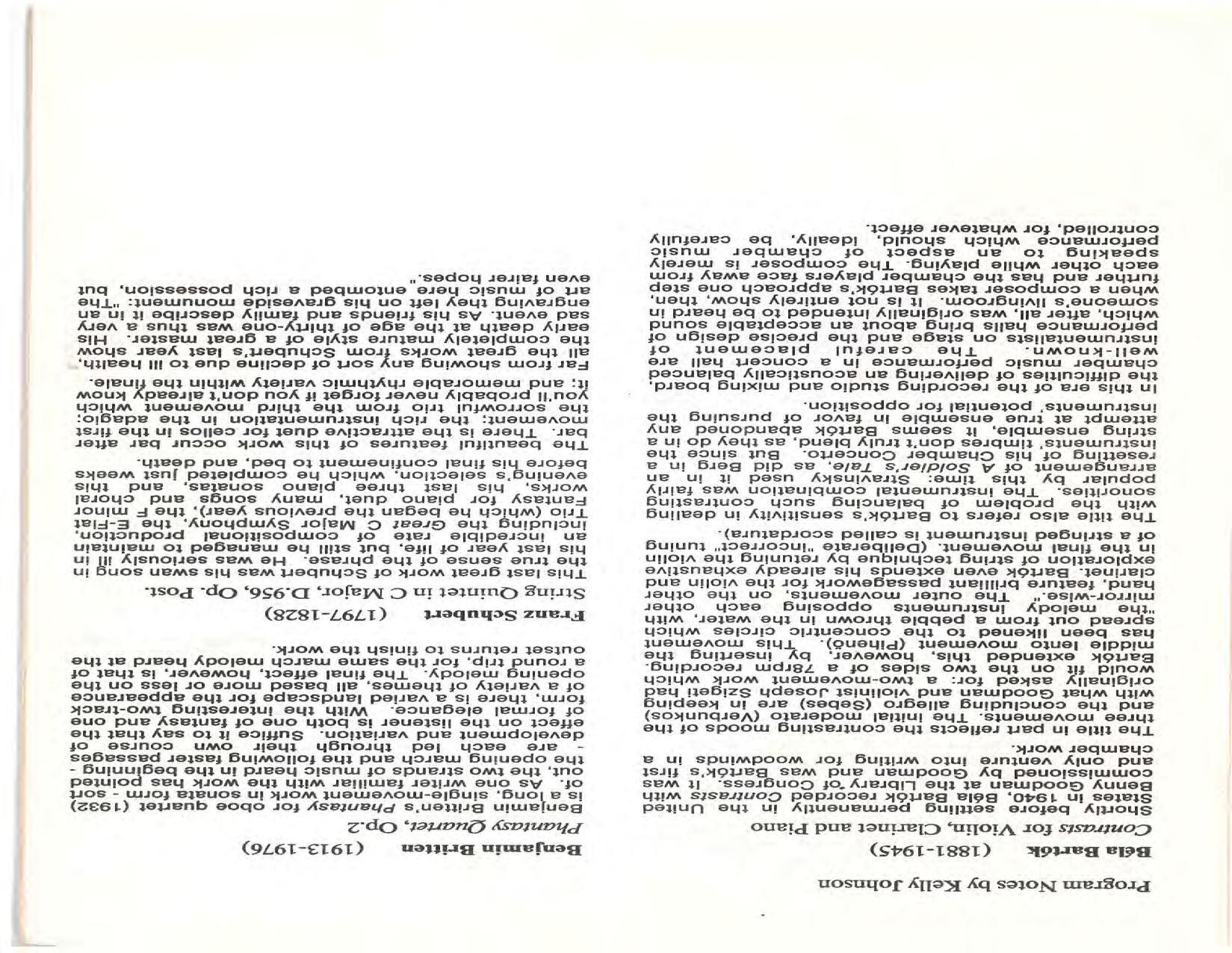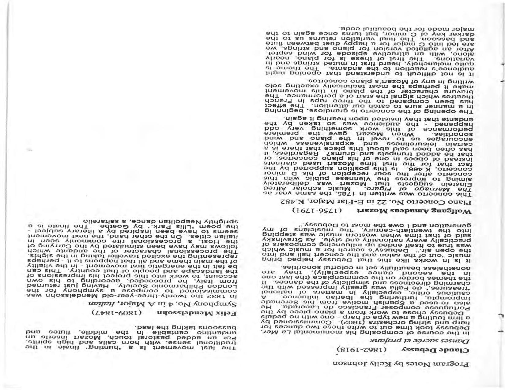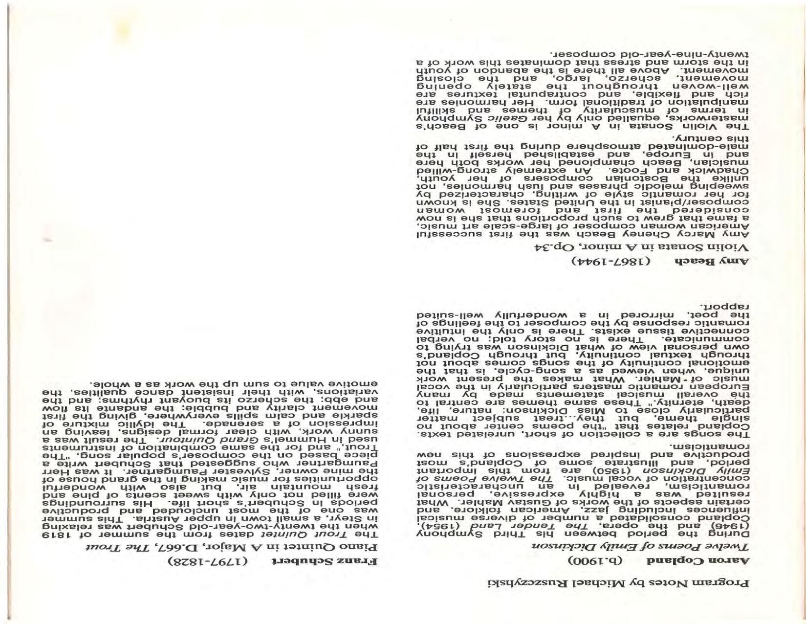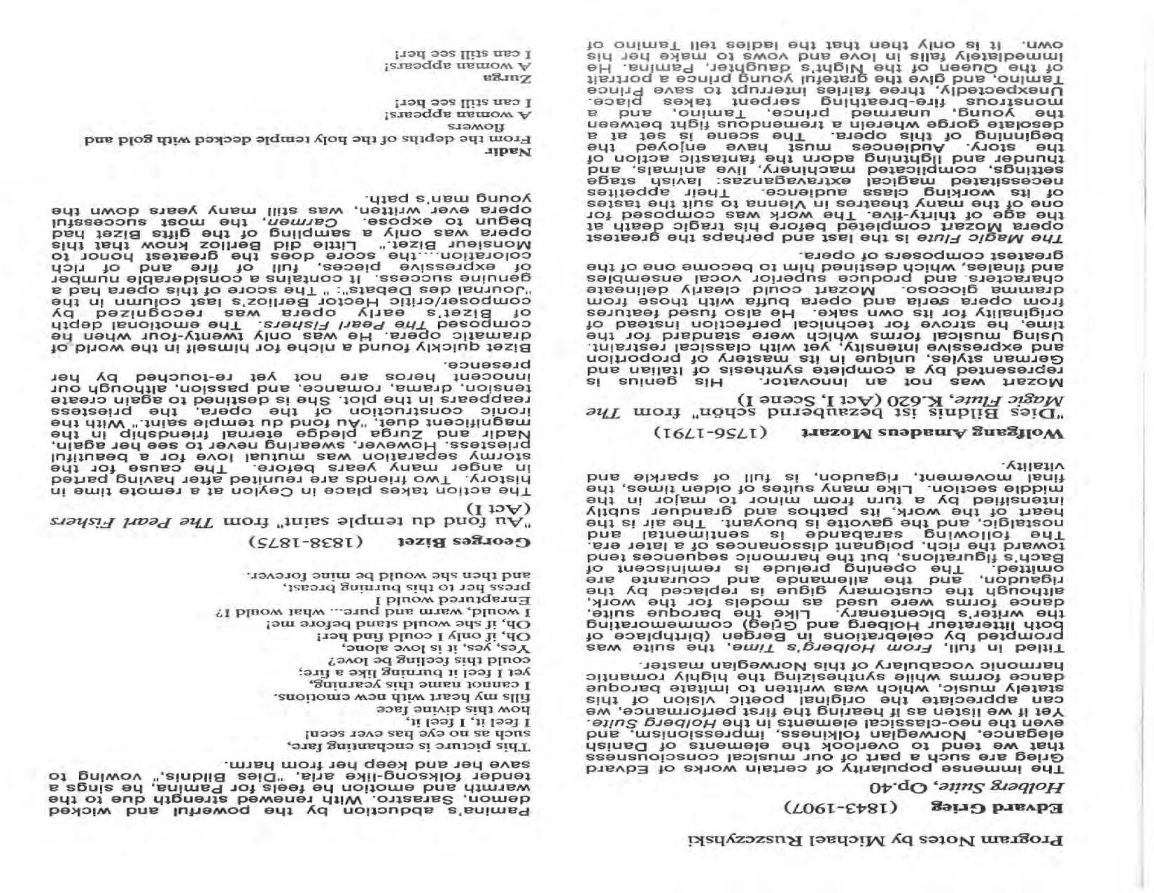 The Festival Educational Outreach Program presents Prokofiev’s Peter and the Wolf to 900 schoolchildren at Allyn Arena in June. Thomas Benjamin’s Nocturne/Aubade/Danse has its world premiere, with Andrea Bonsignore-Berry, oboe; Alan Ross, violin; Michelle LaCourse, viola; and Lindsay Groves, cello. Robert Weirich gives his first lecture-recital, on Elliott Carter’s Piano Sonata. Cellist Yuli Turovsky plays in Schubert’s Quintet for Strings, D. 956 and Tchaikovsky’s sextet Souvenir of Florence, solos in Boccherini’s Concerto for Cello and Strings, and conducts Mozart’s Symphony No. 40. Robert Weirich plays Mozart’s Piano Concerto No. 22 in the final concert, David Zinman conducting.