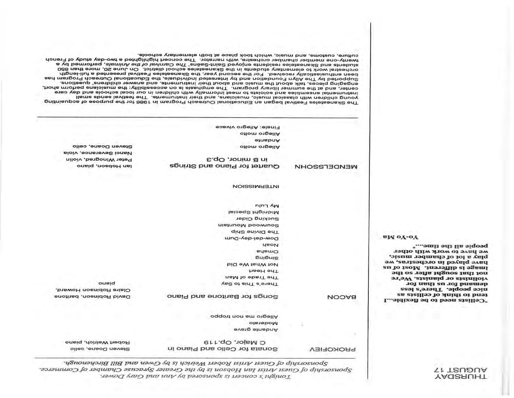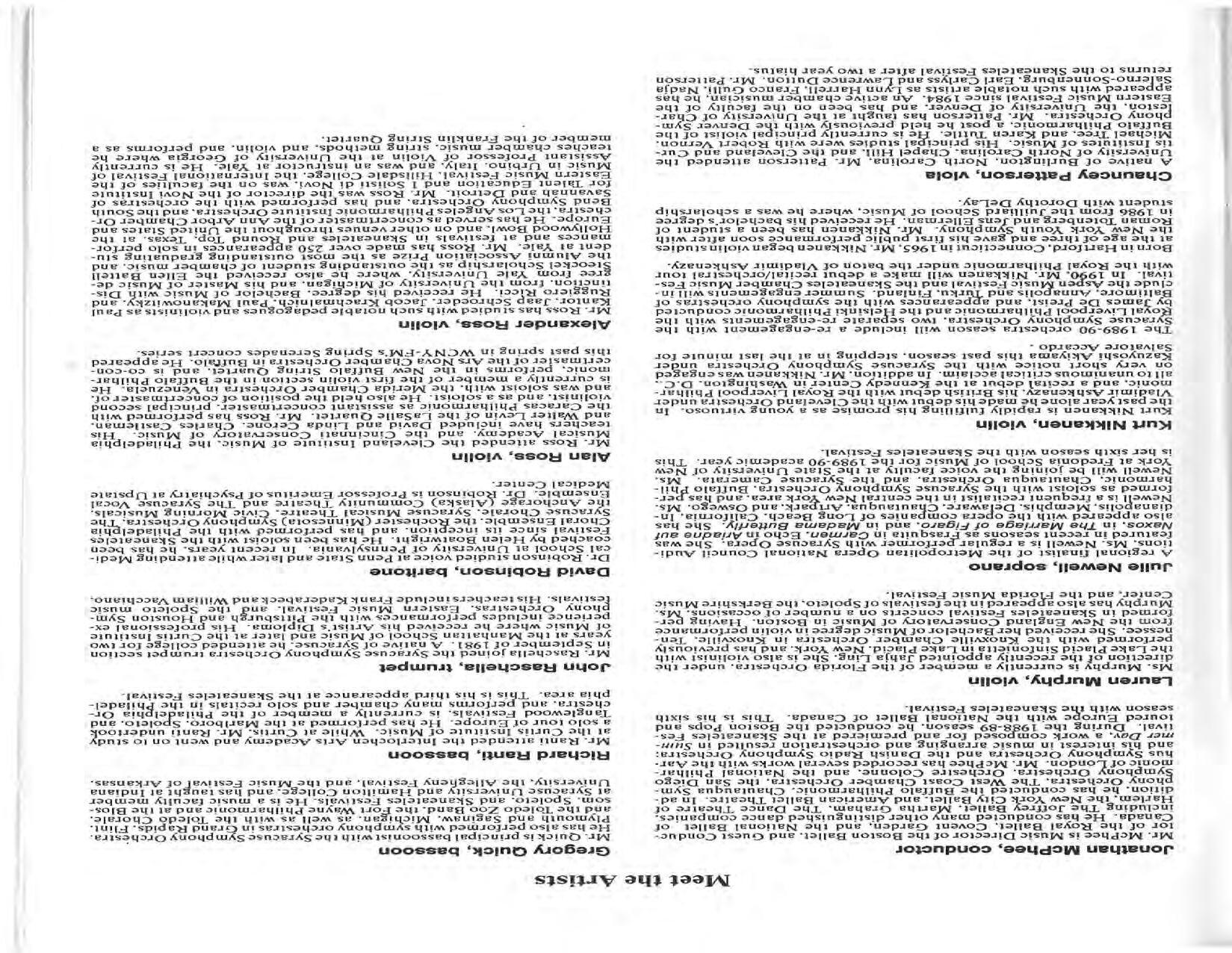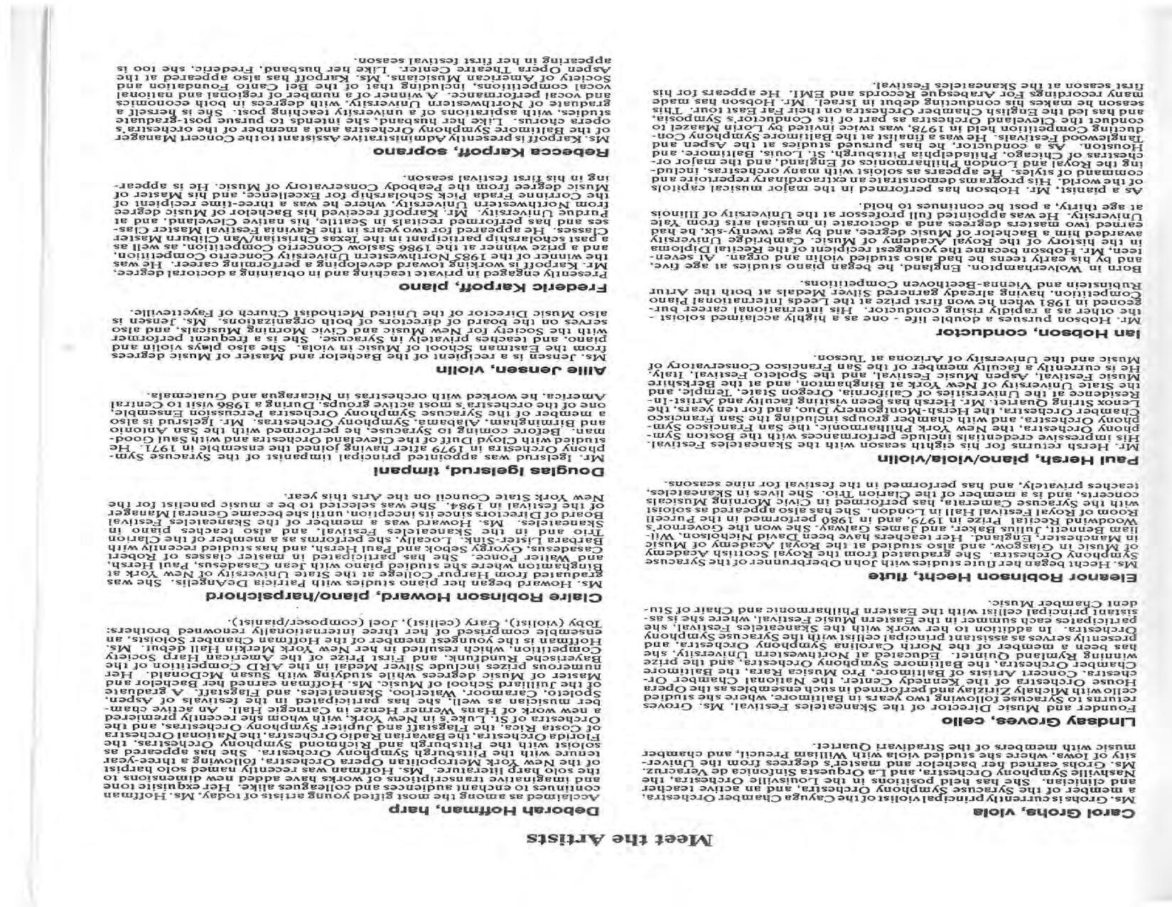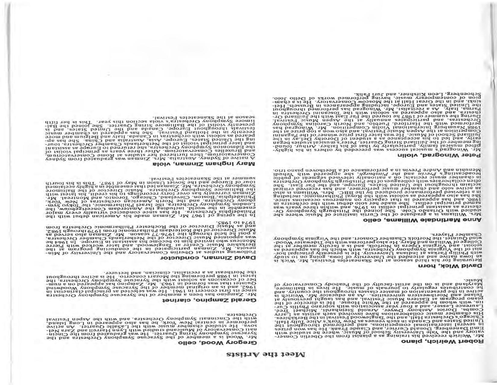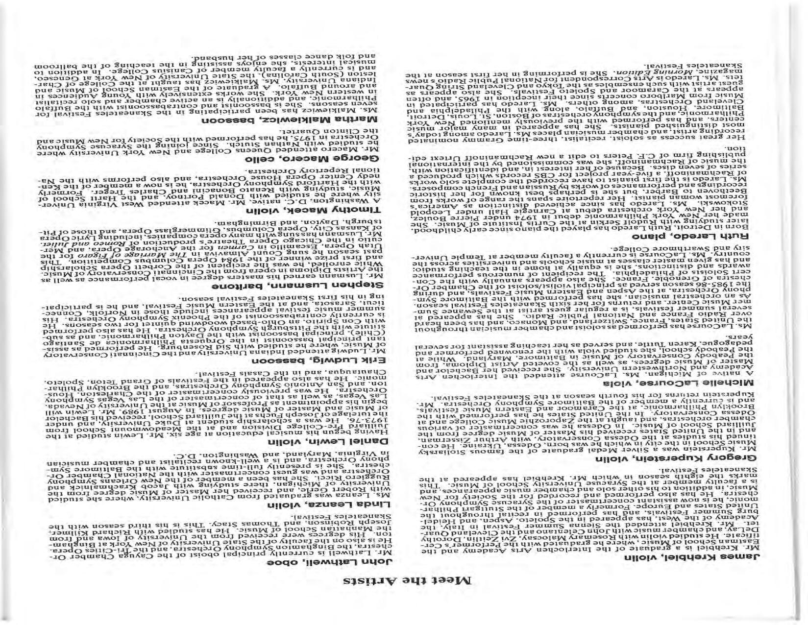 Pianist Ruth Laredo and violinist Kurt Nikkanen perform in Franck’s Sonata for Violin and Piano, Dvořák’s Dumky Trio, and Schumann’s Quintet for Piano and Strings in E-flat Major. Kurt Nikkanen plays Mozart’s Violin Concerto No. 3, Jonathan McPhee conducting. Pianist Ian Hobson performs in Mendelssohn’s Piano Quartet in B Minor and Beethoven’s Archduke Trio, and conducts a concert of two pieces by Delius and Dvořák. Eric Ruske, horn, appears in Schubert’s Auf dem Strom, Harbison’s Twilight Music for Horn, Violin and Piano, and is soloist in Dukas’ Villanelle for Horn and Orchestra, Emily Freeman Brown conducting. Andres Cardenes and Deborah Hoffman perform the world premiere of Ricardo Lopez’ Jaromiluna for Violin and Harp, commissioned by Cardenes. In the final concert, Andres Cardenes solos in the Barber Violin Concerto, David Zinman conducting.