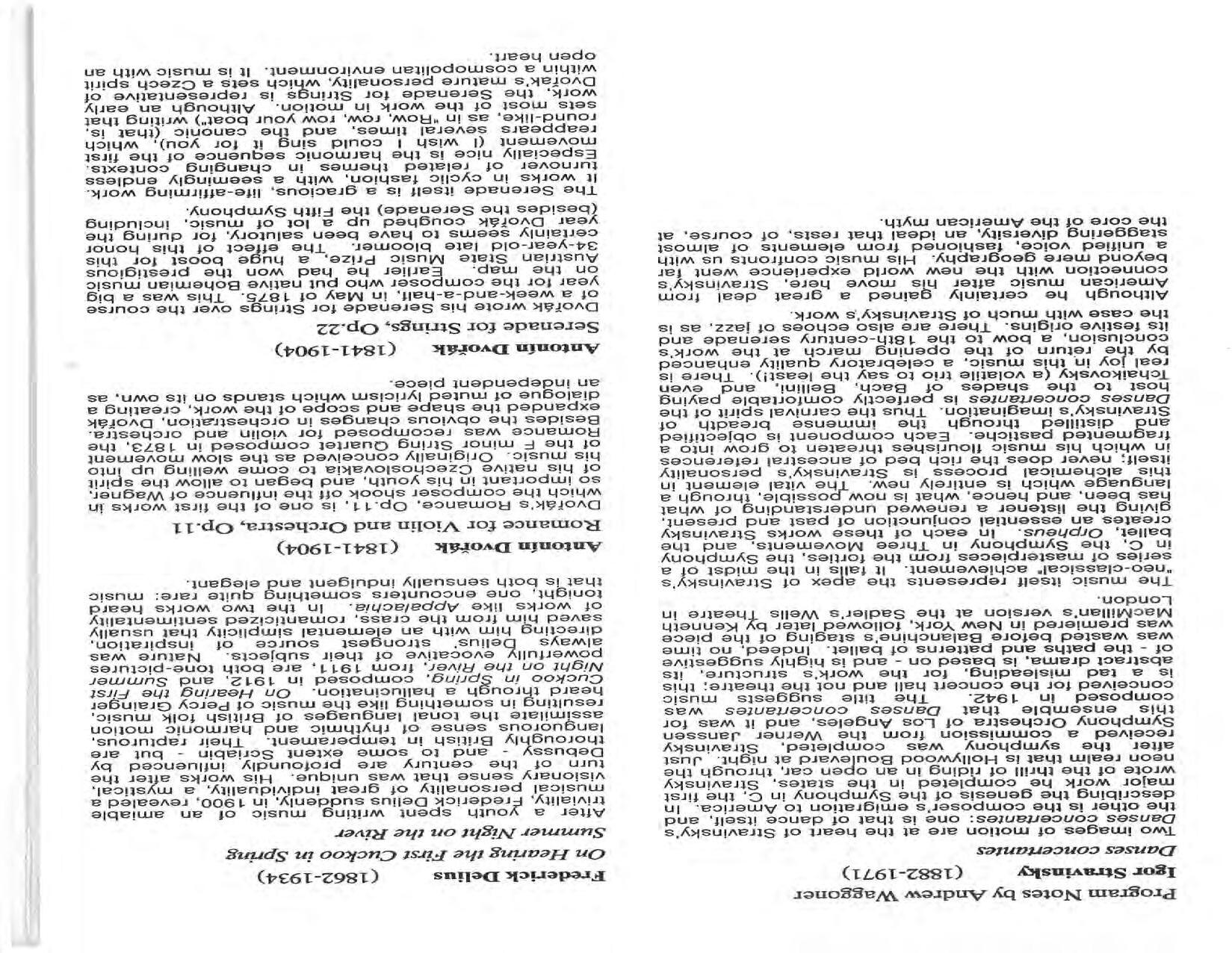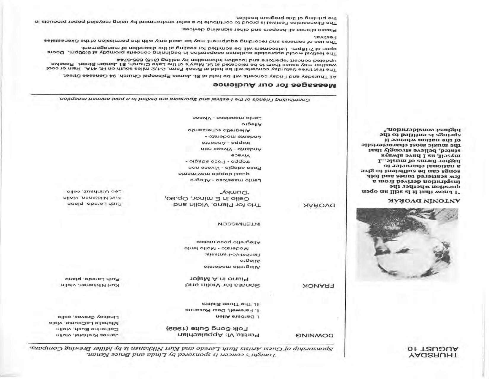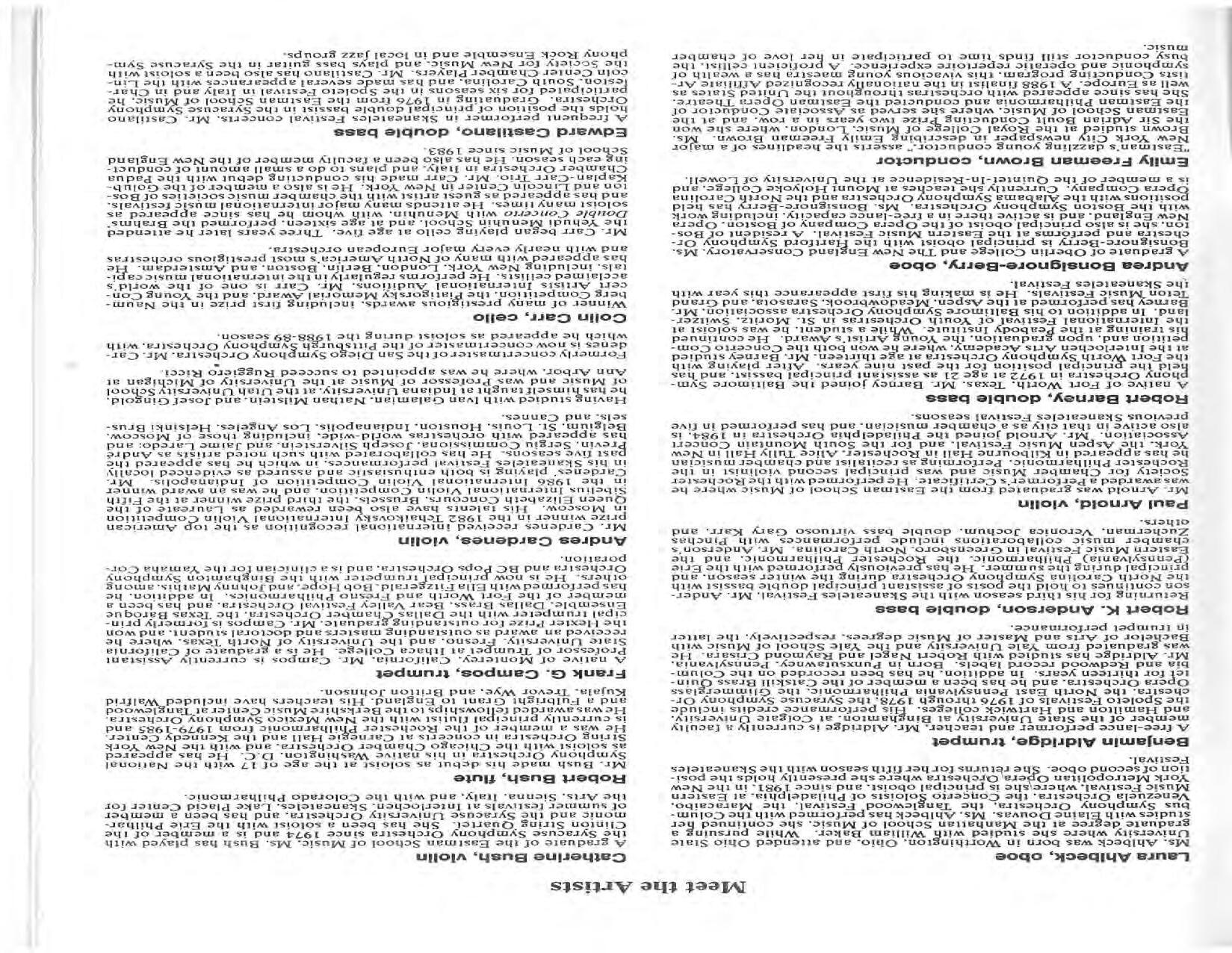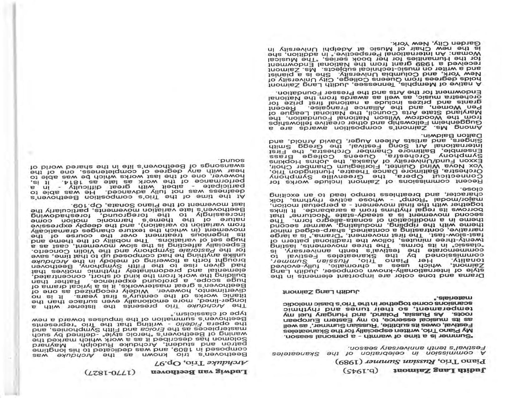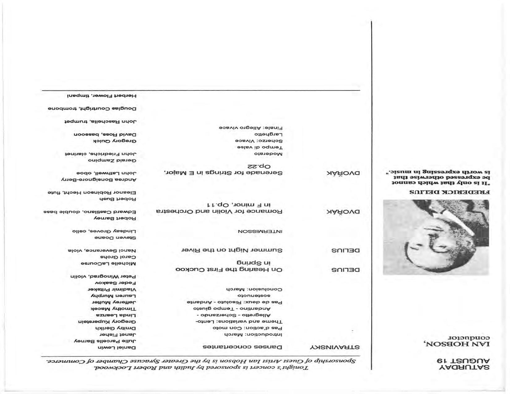 Pianist Ruth Laredo and violinist Kurt Nikkanen perform in Franck’s Sonata for Violin and Piano, Dvořák’s Dumky Trio, and Schumann’s Quintet for Piano and Strings in E-flat Major. Kurt Nikkanen plays Mozart’s Violin Concerto No. 3, Jonathan McPhee conducting. Pianist Ian Hobson performs in Mendelssohn’s Piano Quartet in B Minor and Beethoven’s Archduke Trio, and conducts a concert of two pieces by Delius and Dvořák. Eric Ruske, horn, appears in Schubert’s Auf dem Strom, Harbison’s Twilight Music for Horn, Violin and Piano, and is soloist in Dukas’ Villanelle for Horn and Orchestra, Emily Freeman Brown conducting. Andres Cardenes and Deborah Hoffman perform the world premiere of Ricardo Lopez’ Jaromiluna for Violin and Harp, commissioned by Cardenes. In the final concert, Andres Cardenes solos in the Barber Violin Concerto, David Zinman conducting.
