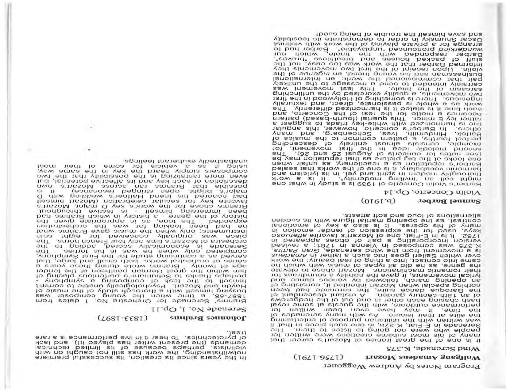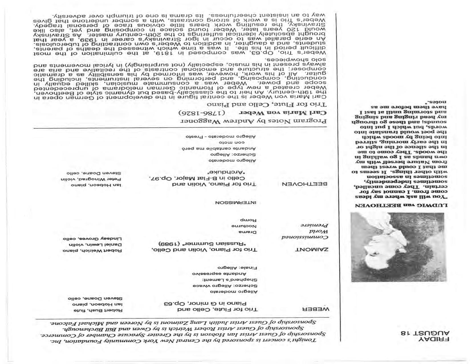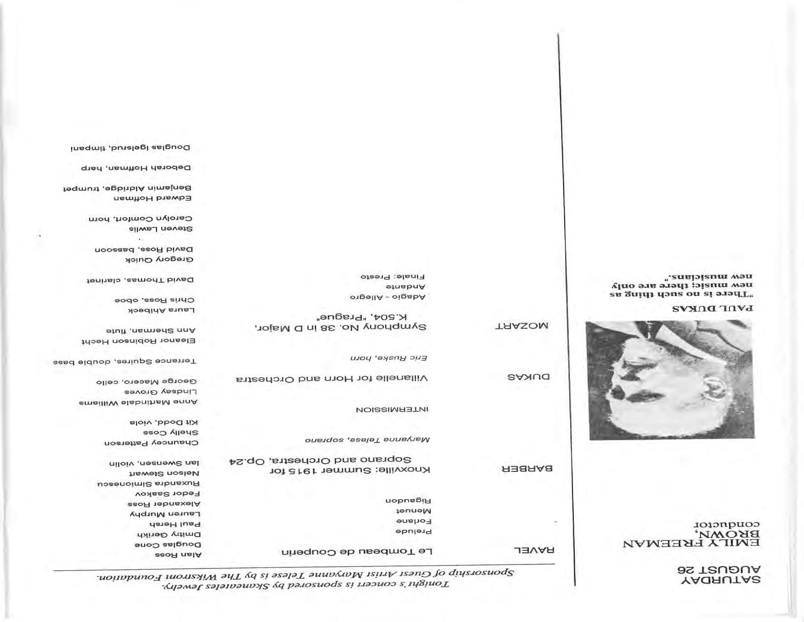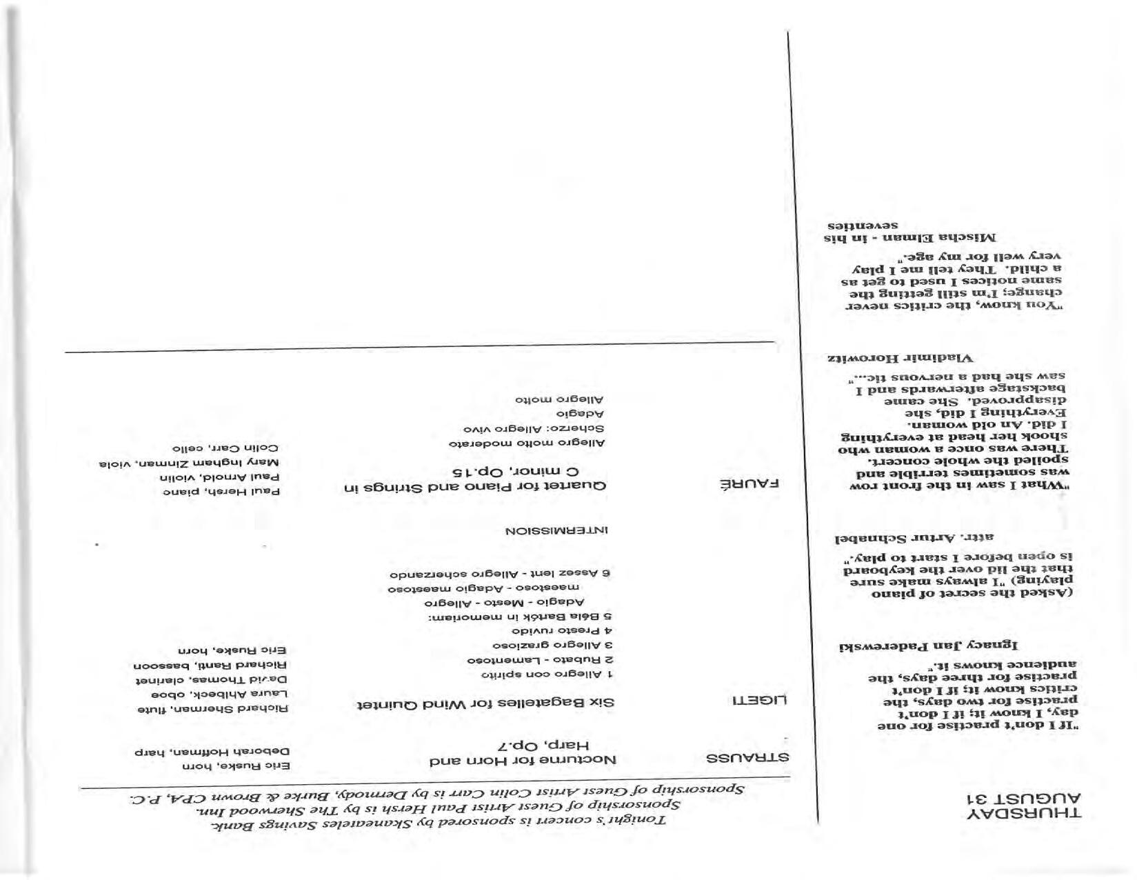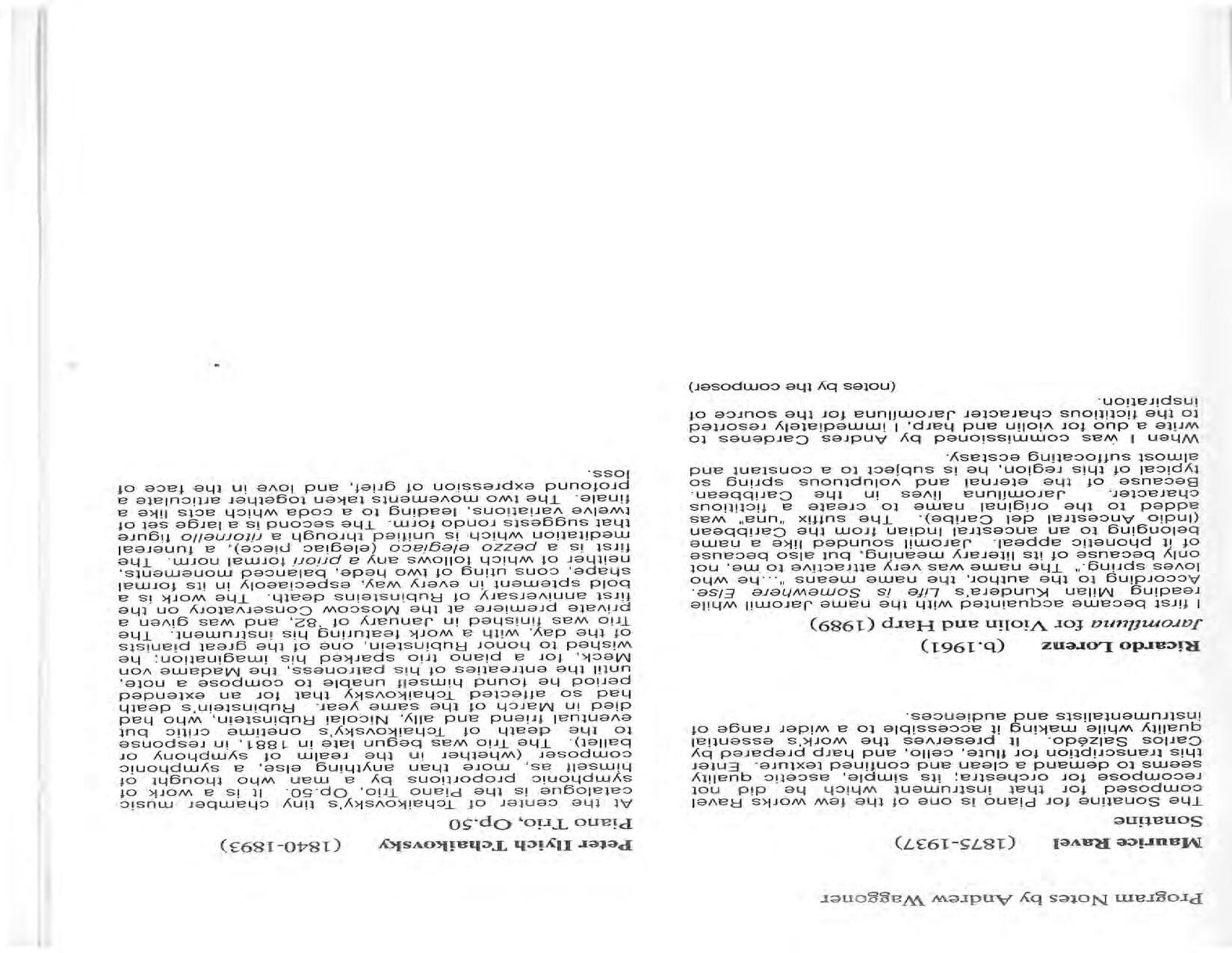 Pianist Ruth Laredo and violinist Kurt Nikkanen perform in Franck’s Sonata for Violin and Piano, Dvořák’s Dumky Trio, and Schumann’s Quintet for Piano and Strings in E-flat Major. Kurt Nikkanen plays Mozart’s Violin Concerto No. 3, Jonathan McPhee conducting. Pianist Ian Hobson performs in Mendelssohn’s Piano Quartet in B Minor and Beethoven’s Archduke Trio, and conducts a concert of two pieces by Delius and Dvořák. Eric Ruske, horn, appears in Schubert’s Auf dem Strom, Harbison’s Twilight Music for Horn, Violin and Piano, and is soloist in Dukas’ Villanelle for Horn and Orchestra, Emily Freeman Brown conducting. Andres Cardenes and Deborah Hoffman perform the world premiere of Ricardo Lopez’ Jaromiluna for Violin and Harp, commissioned by Cardenes. In the final concert, Andres Cardenes solos in the Barber Violin Concerto, David Zinman conducting.