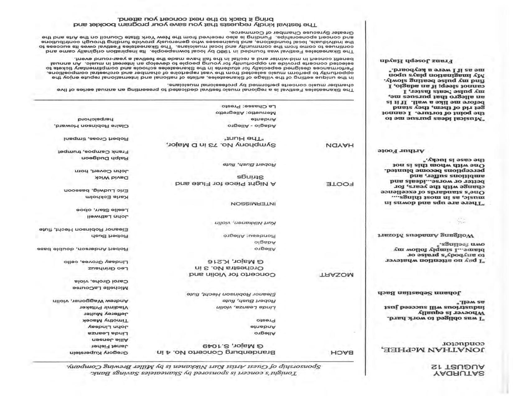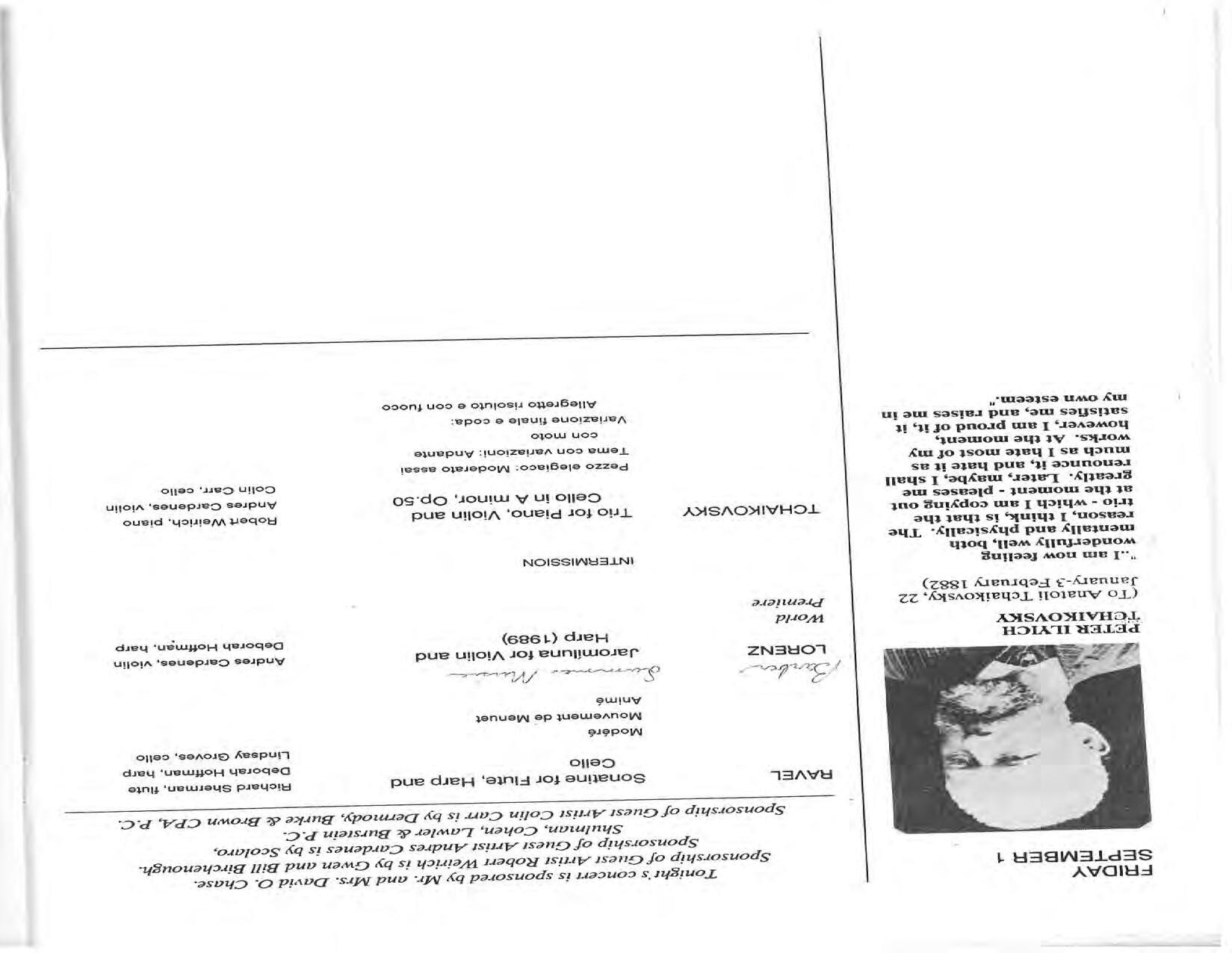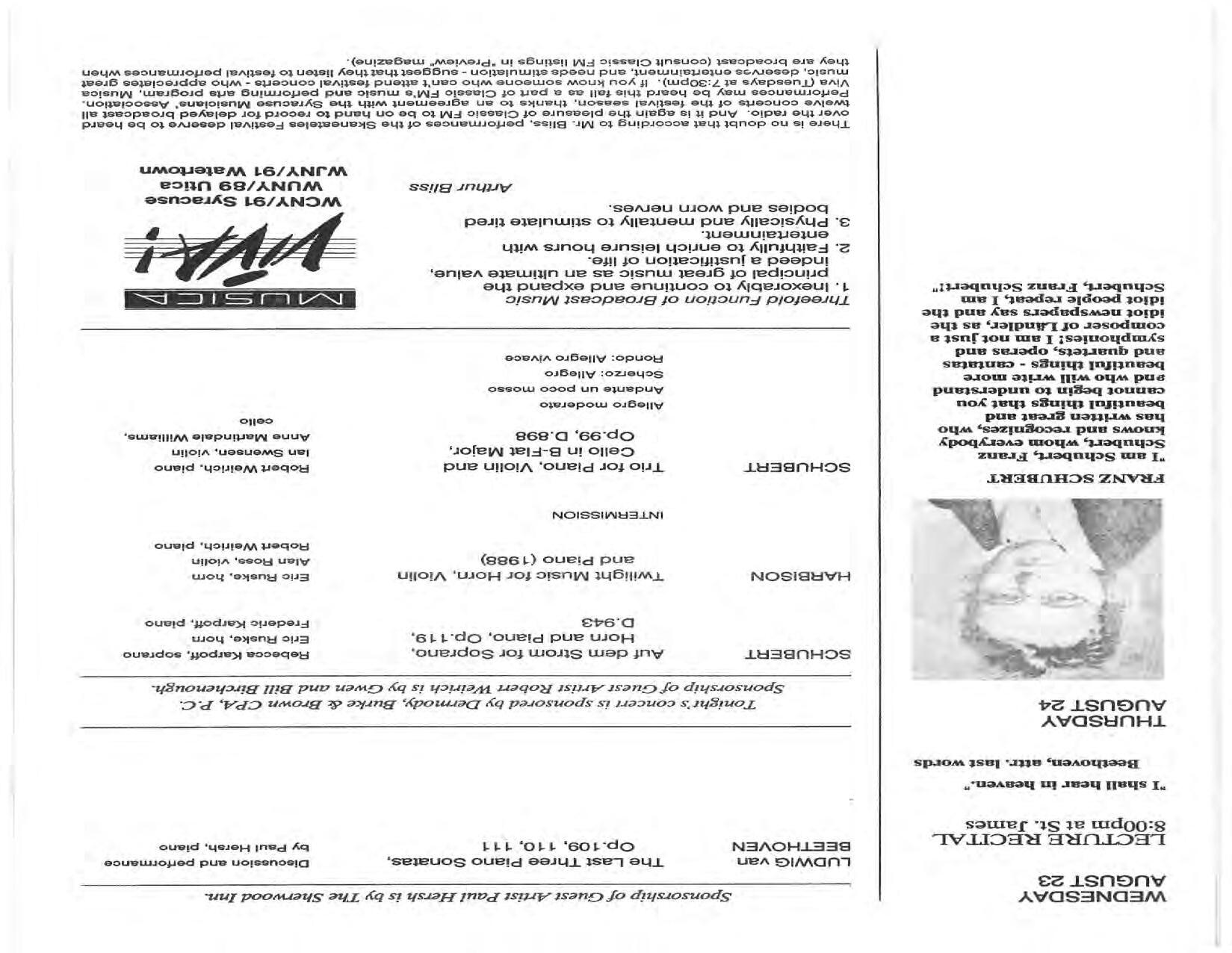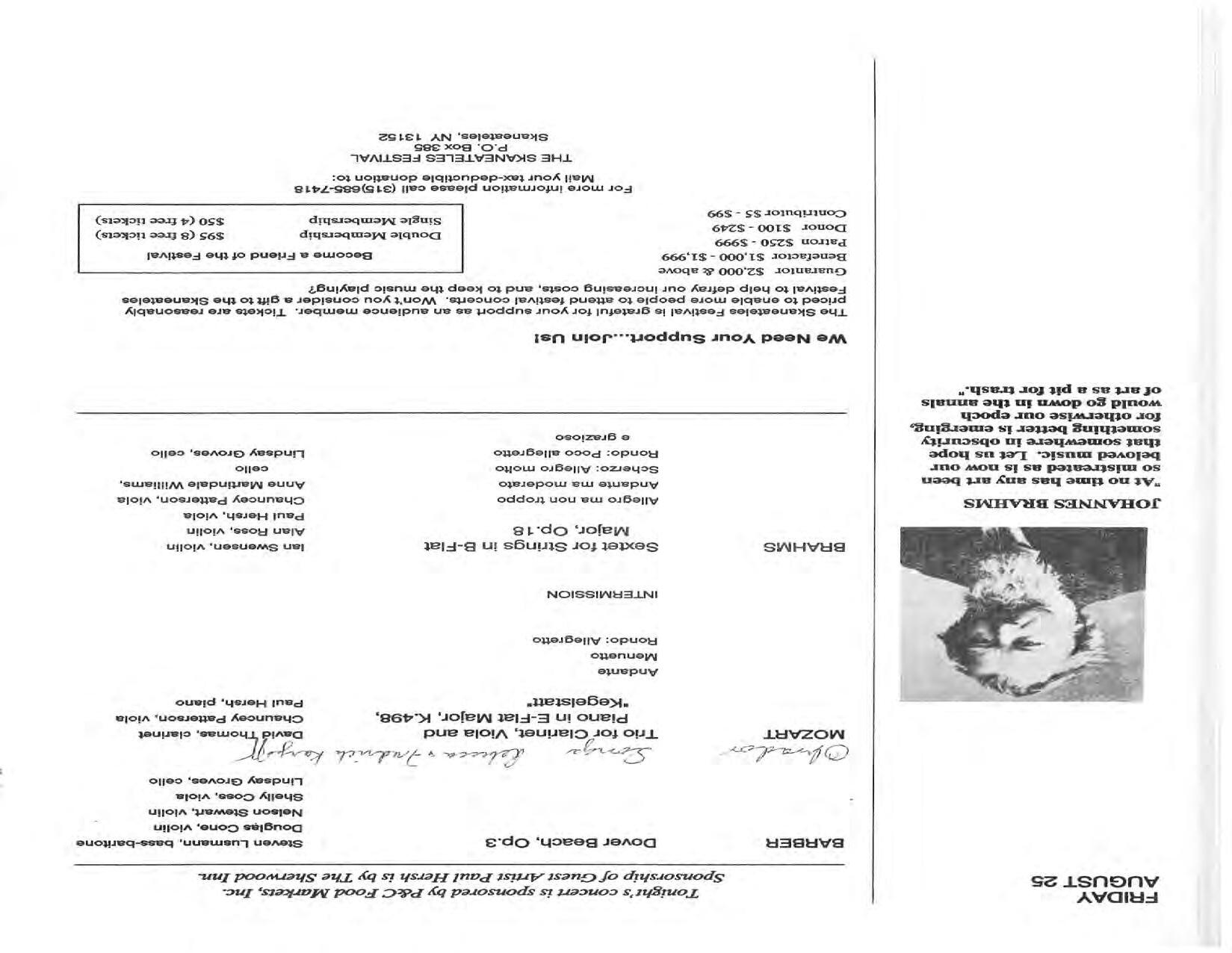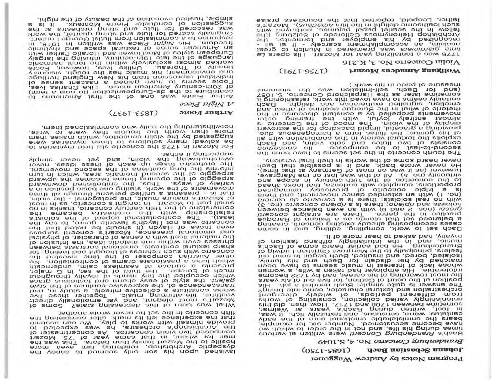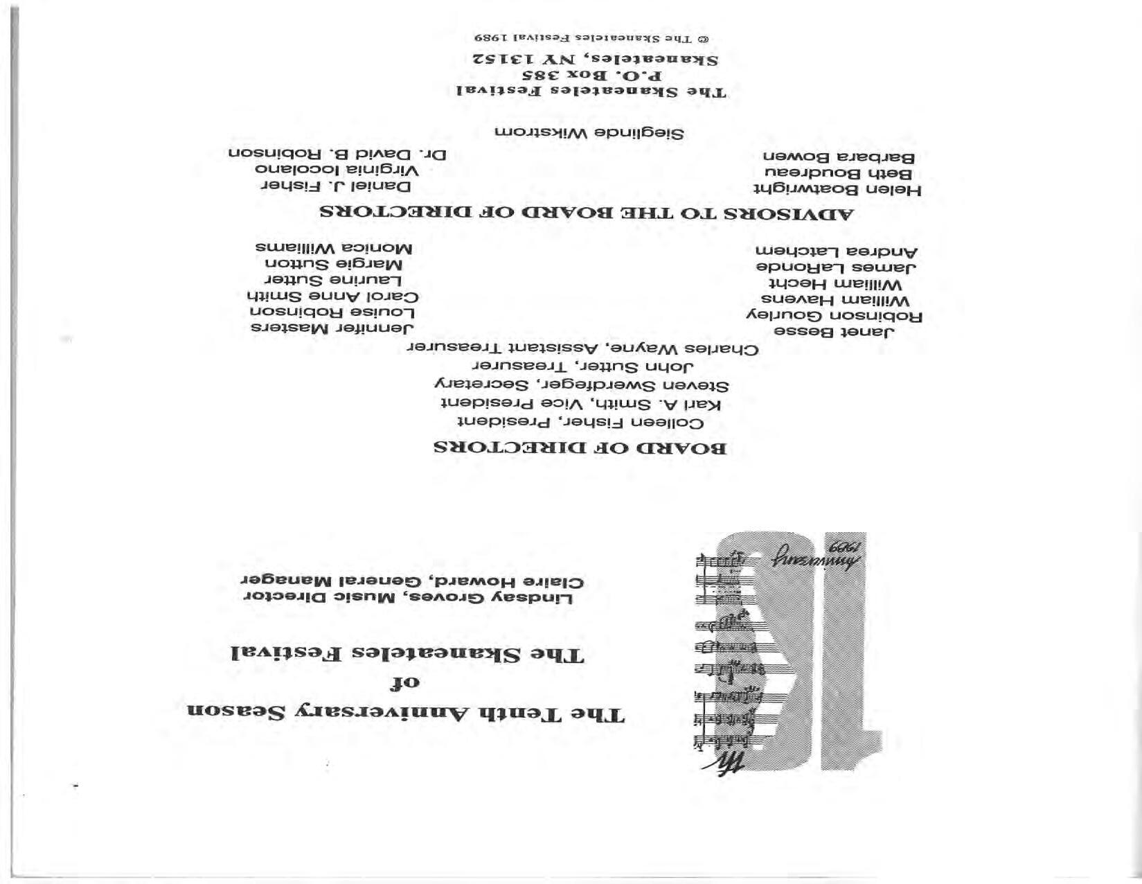 Pianist Ruth Laredo and violinist Kurt Nikkanen perform in Franck’s Sonata for Violin and Piano, Dvořák’s Dumky Trio, and Schumann’s Quintet for Piano and Strings in E-flat Major. Kurt Nikkanen plays Mozart’s Violin Concerto No. 3, Jonathan McPhee conducting. Pianist Ian Hobson performs in Mendelssohn’s Piano Quartet in B Minor and Beethoven’s Archduke Trio, and conducts a concert of two pieces by Delius and Dvořák. Eric Ruske, horn, appears in Schubert’s Auf dem Strom, Harbison’s Twilight Music for Horn, Violin and Piano, and is soloist in Dukas’ Villanelle for Horn and Orchestra, Emily Freeman Brown conducting. Andres Cardenes and Deborah Hoffman perform the world premiere of Ricardo Lopez’ Jaromiluna for Violin and Harp, commissioned by Cardenes. In the final concert, Andres Cardenes solos in the Barber Violin Concerto, David Zinman conducting.