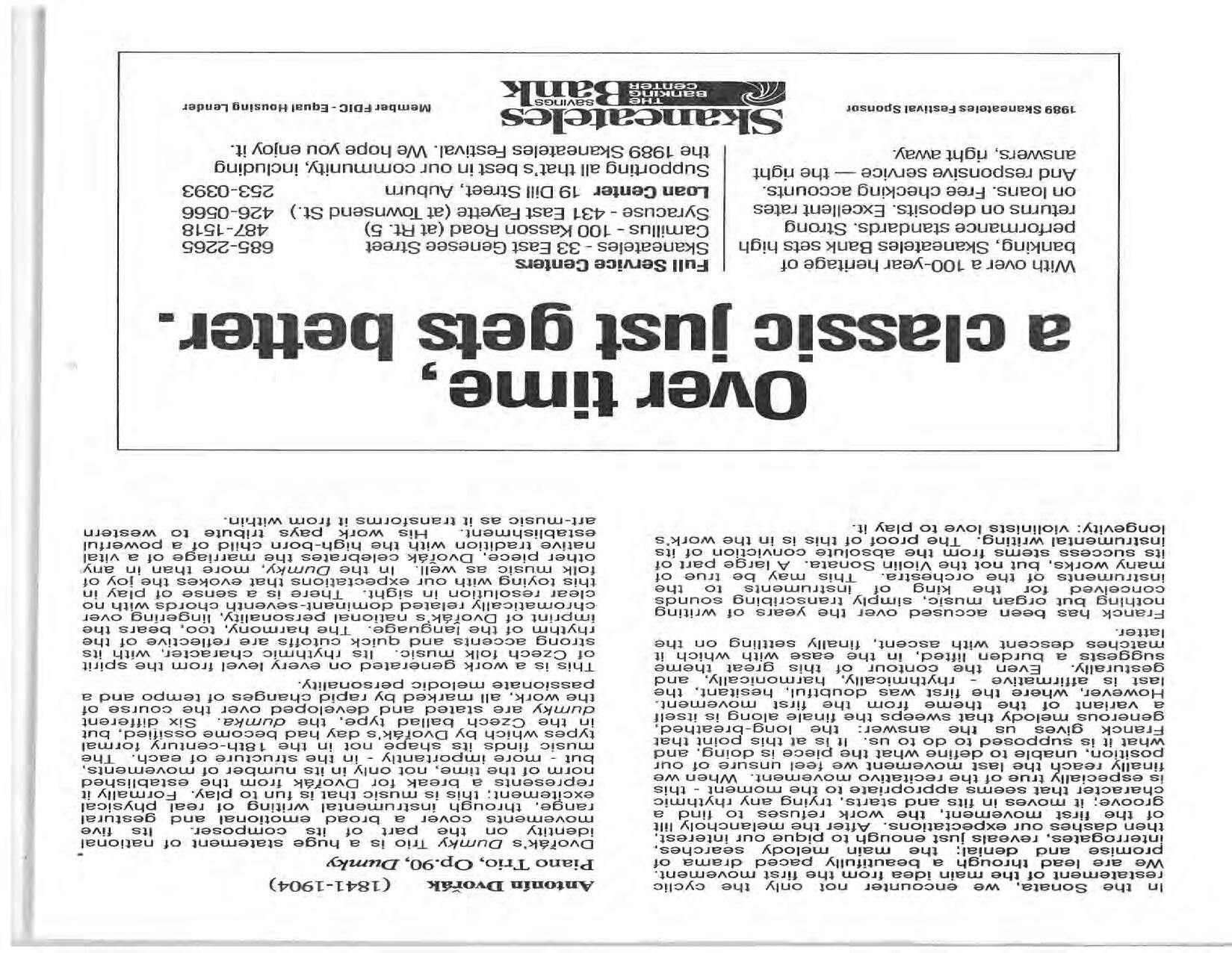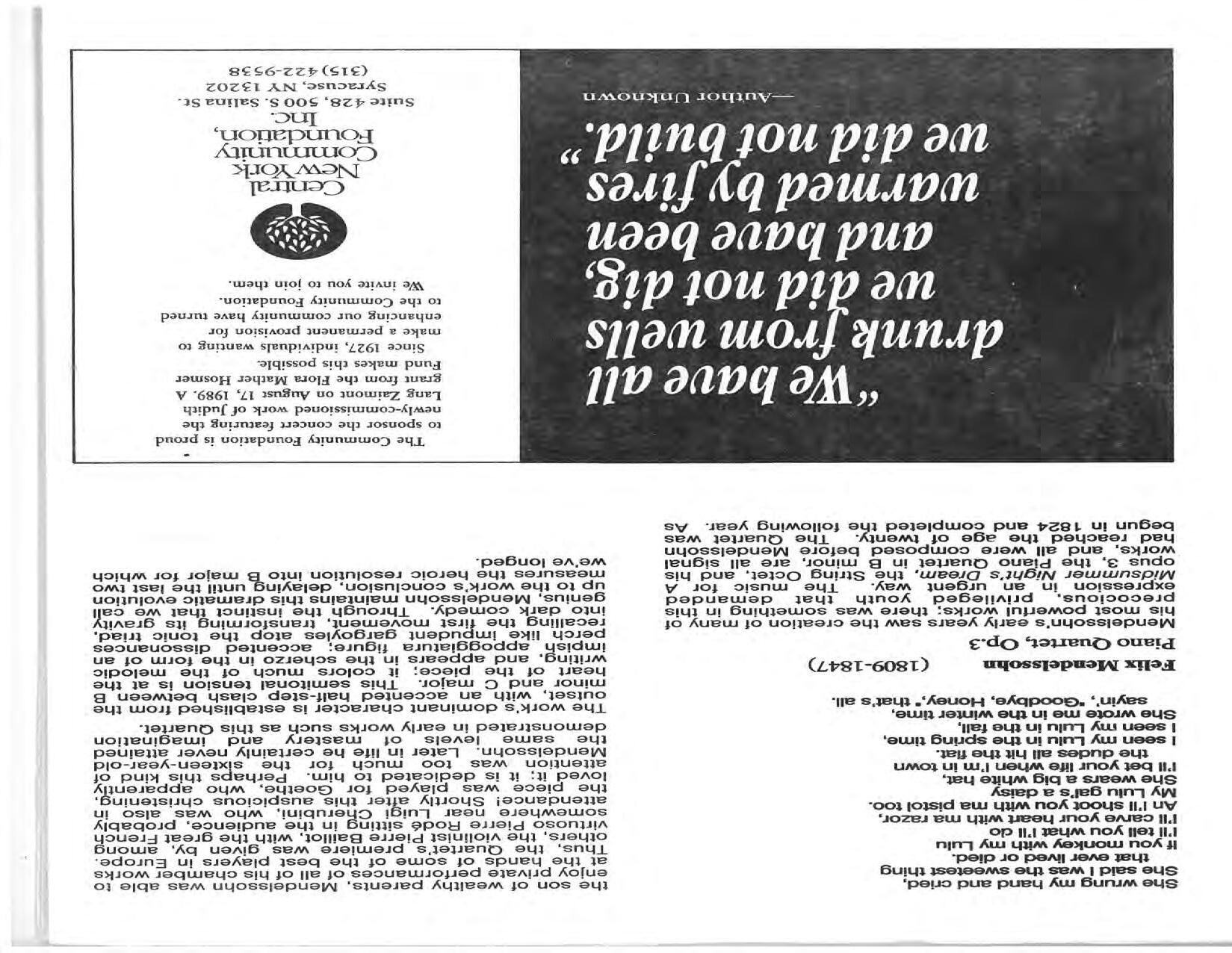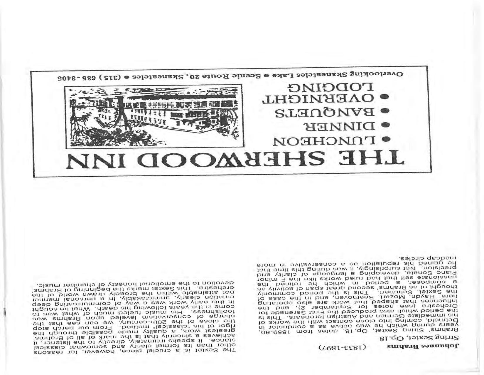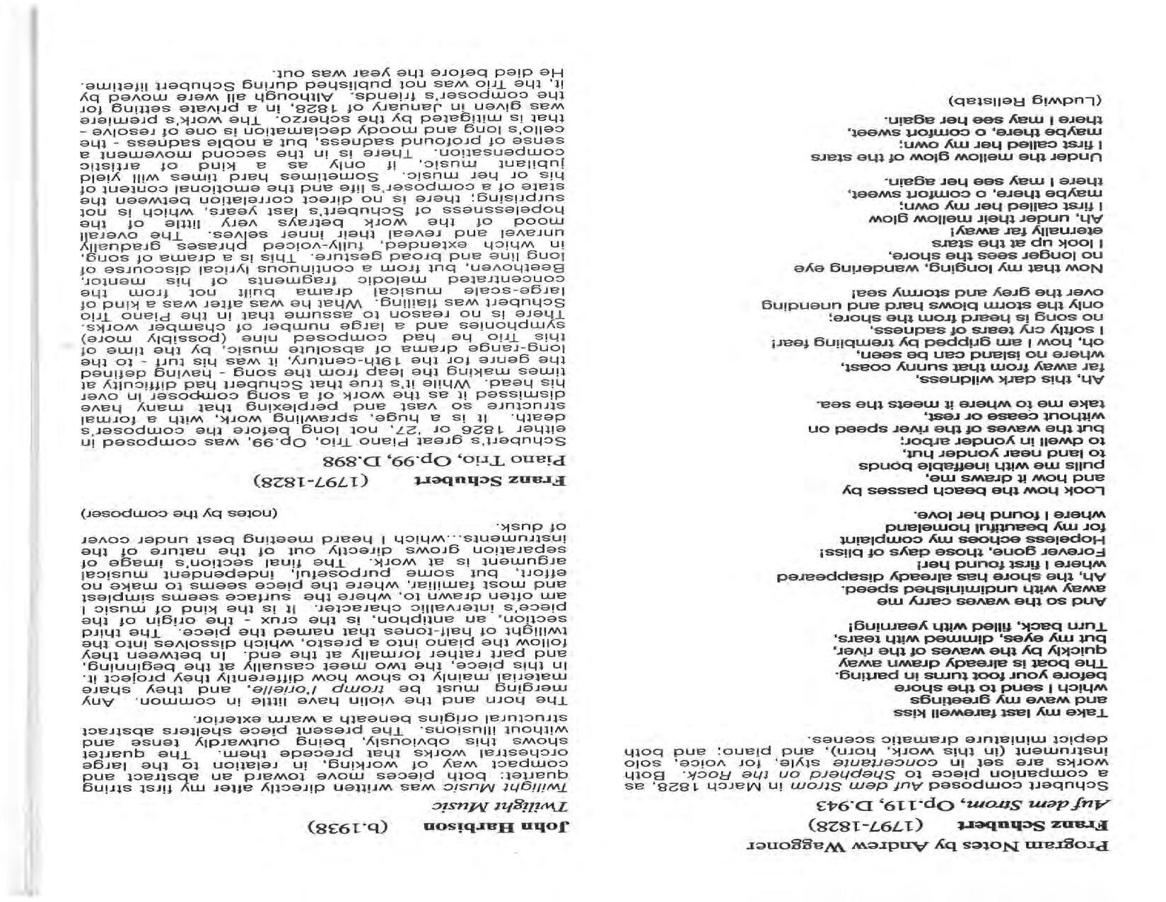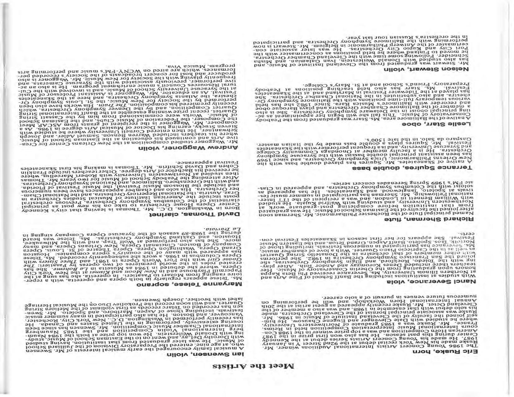 Pianist Ruth Laredo and violinist Kurt Nikkanen perform in Franck’s Sonata for Violin and Piano, Dvořák’s Dumky Trio, and Schumann’s Quintet for Piano and Strings in E-flat Major. Kurt Nikkanen plays Mozart’s Violin Concerto No. 3, Jonathan McPhee conducting. Pianist Ian Hobson performs in Mendelssohn’s Piano Quartet in B Minor and Beethoven’s Archduke Trio, and conducts a concert of two pieces by Delius and Dvořák. Eric Ruske, horn, appears in Schubert’s Auf dem Strom, Harbison’s Twilight Music for Horn, Violin and Piano, and is soloist in Dukas’ Villanelle for Horn and Orchestra, Emily Freeman Brown conducting. Andres Cardenes and Deborah Hoffman perform the world premiere of Ricardo Lopez’ Jaromiluna for Violin and Harp, commissioned by Cardenes. In the final concert, Andres Cardenes solos in the Barber Violin Concerto, David Zinman conducting.