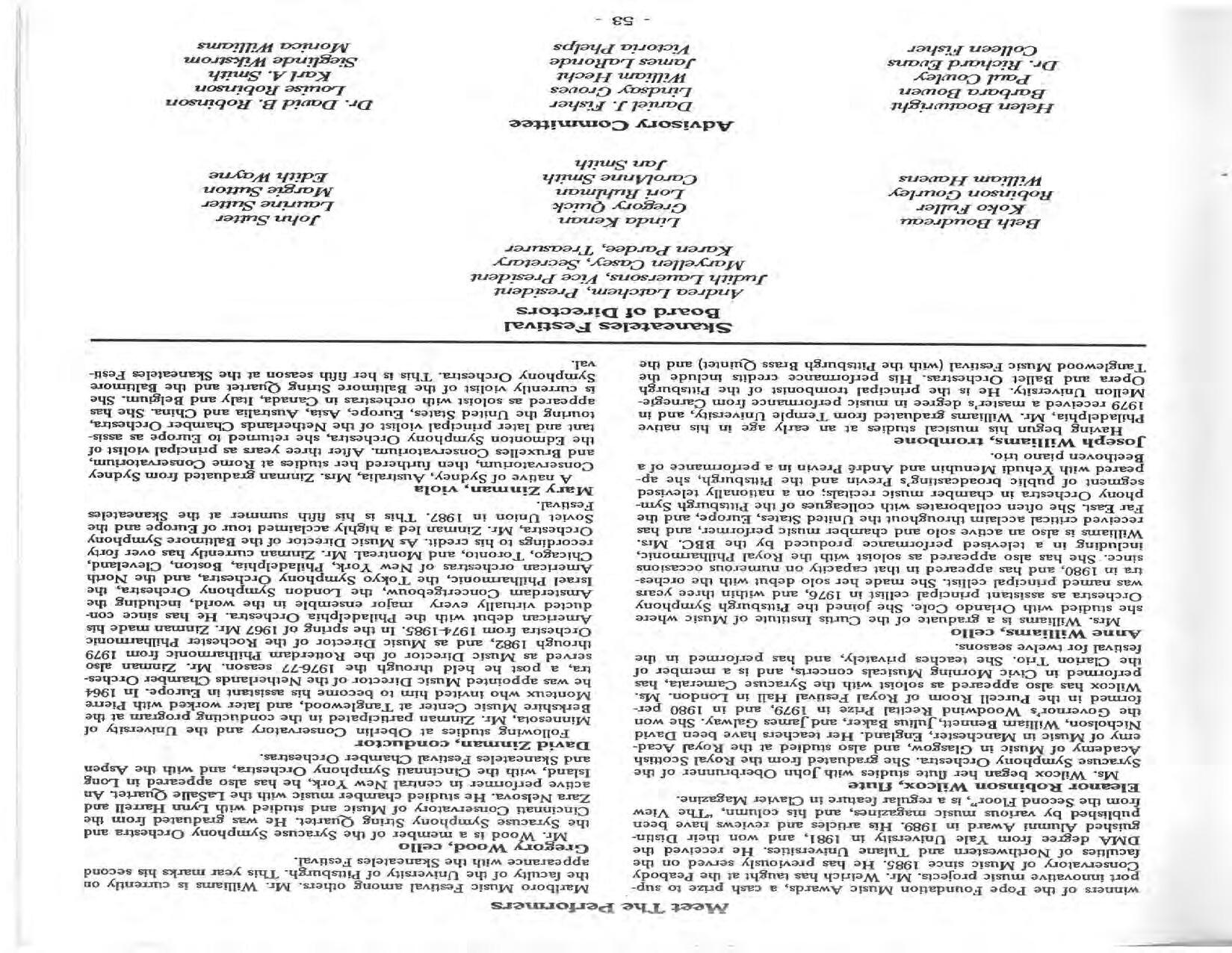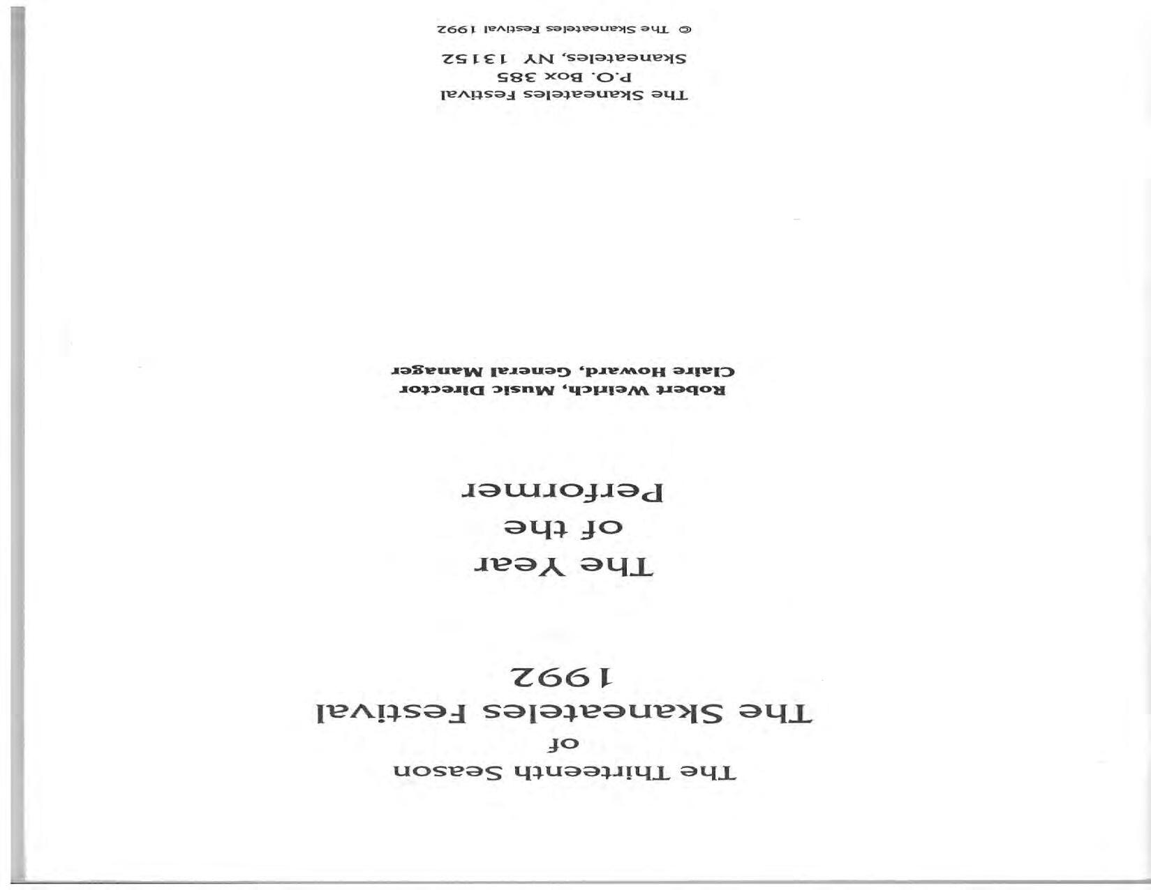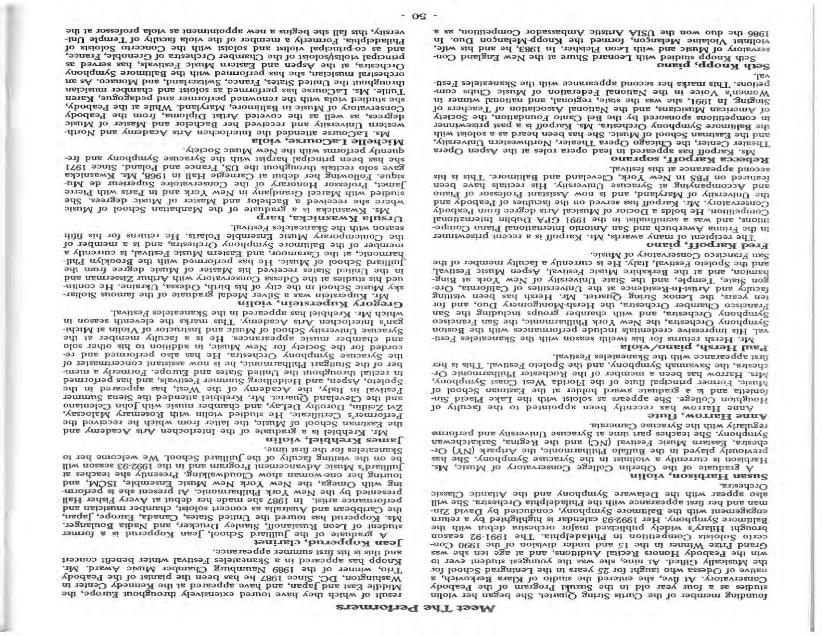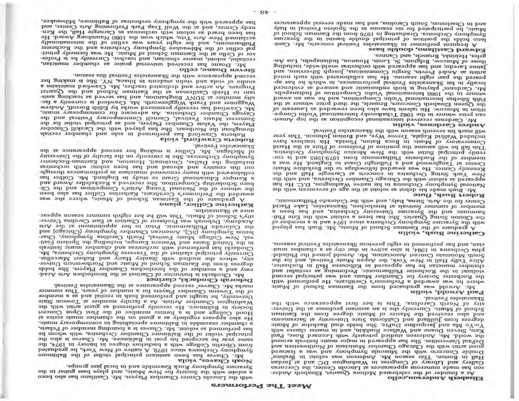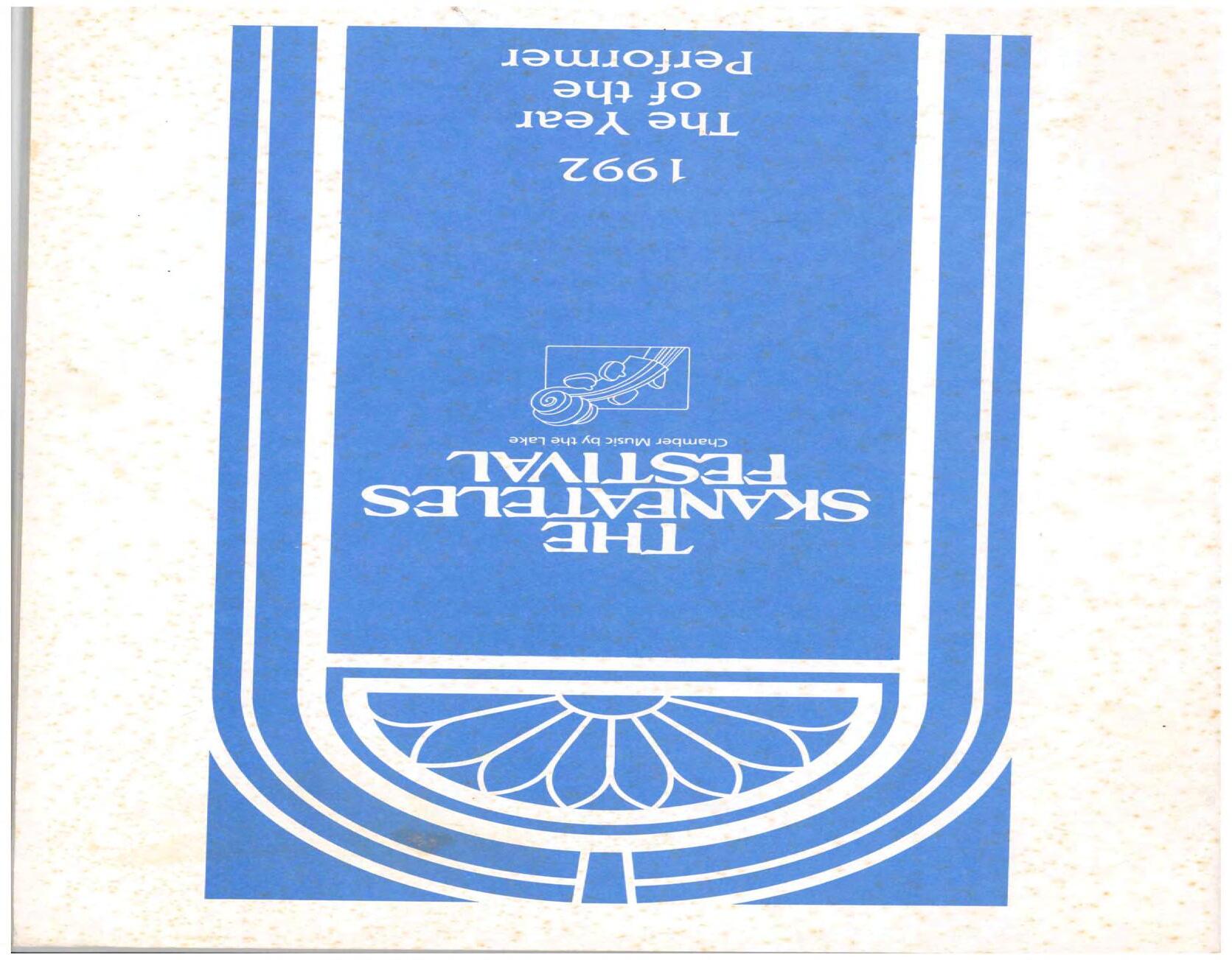 In February, the Festival and WCNY-FM win the Lucien Wulsin Award from National Public Radio’s Performance Today for the Aug. 19, 1989 recording of Delius’ On Hearing the First Cuckoo in Spring, Ian Hobson conducting. Joseph Genualdi is the violin soloist in Vivaldi’s The Four Seasons. The Peabody Trio performs Dvořák’s Piano Trio in F Minor. Aug. 16 is the American premiere of Joseph Thalken’s Introduction and Jazz Waltz for violin, soprano, saxophone, and piano, with Thalken on piano. Paul Hersh, piano; Andres Cardenes, violin; and Anne Williams, cello, perform Brahms’ Piano Trio in C Minor. In the final concert, Kenneth Kiesler conducts Beethoven’s Triple Concerto with Andres Cardenes (violin), Anne Williams (cello), and Robert Weirich (piano).