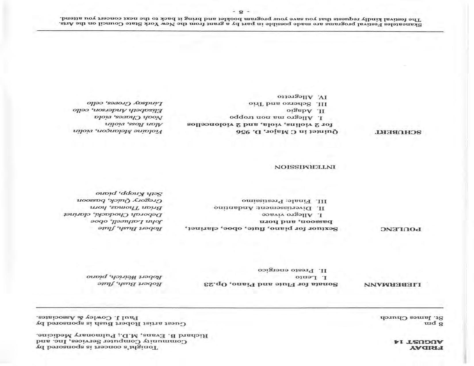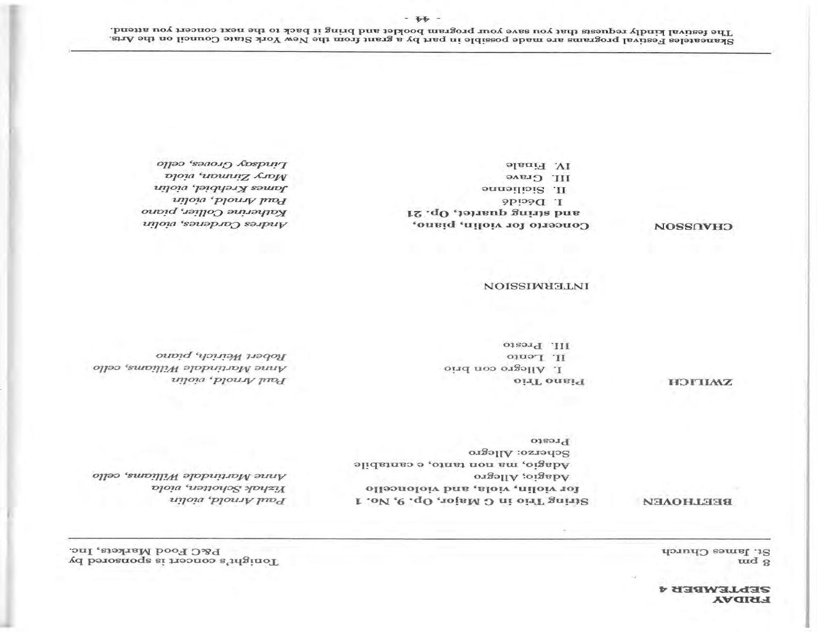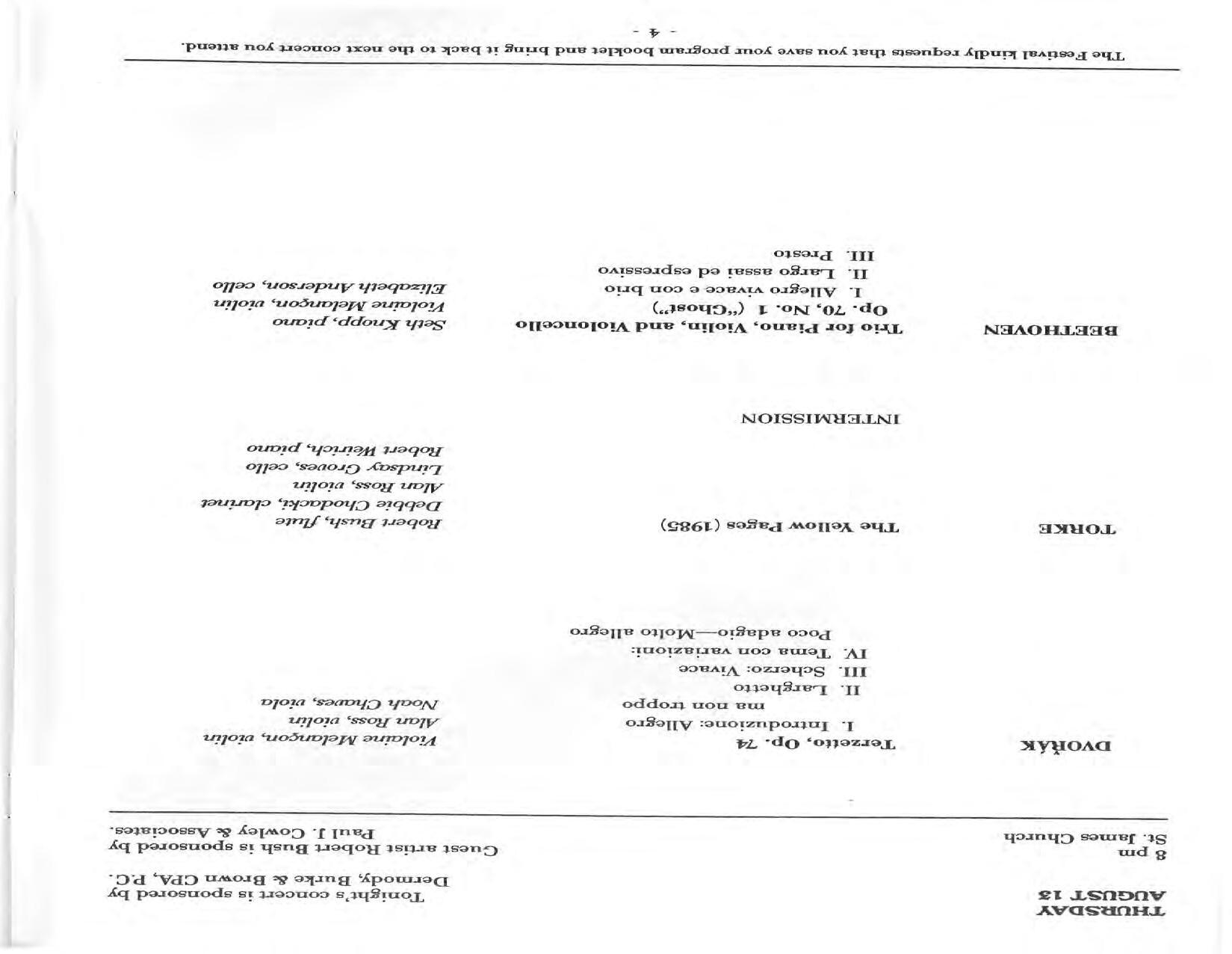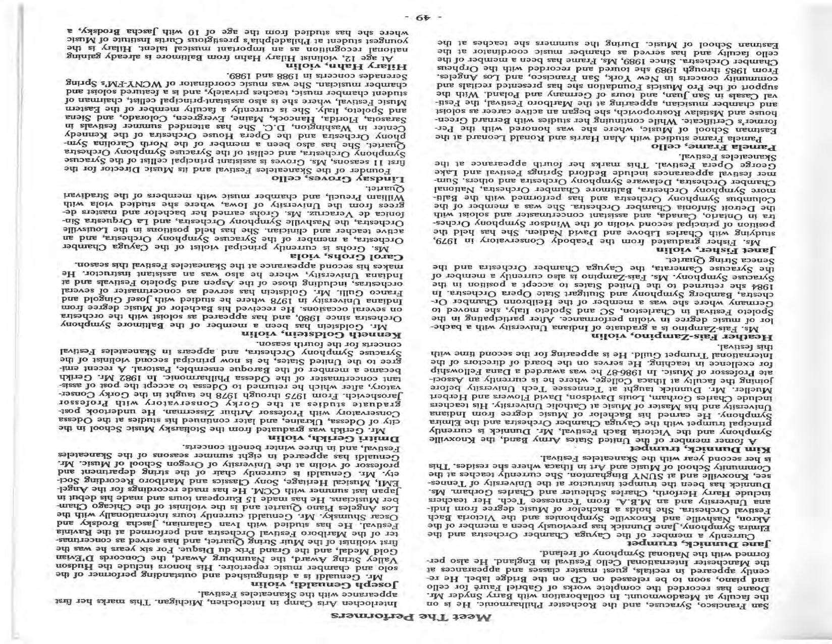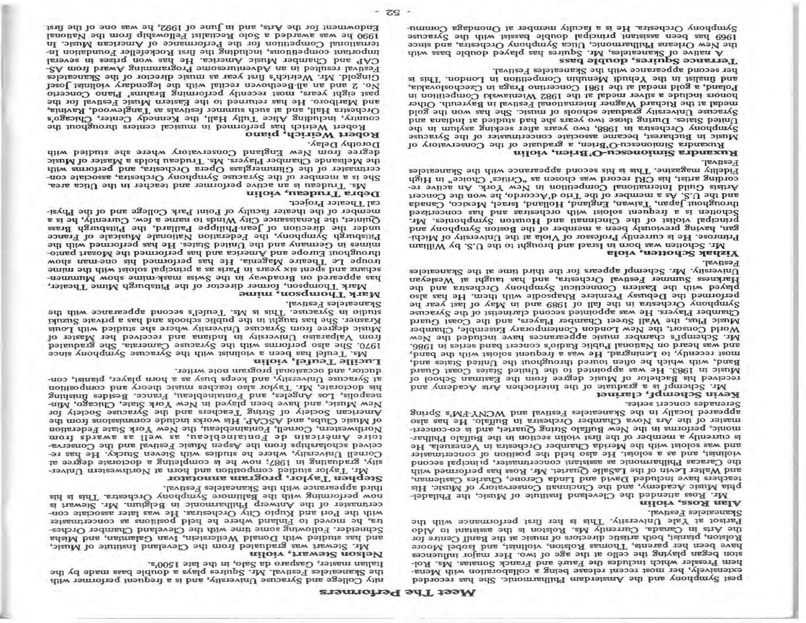 In February, the Festival and WCNY-FM win the Lucien Wulsin Award from National Public Radio’s Performance Today for the Aug. 19, 1989 recording of Delius’ On Hearing the First Cuckoo in Spring, Ian Hobson conducting. Joseph Genualdi is the violin soloist in Vivaldi’s The Four Seasons. The Peabody Trio performs Dvořák’s Piano Trio in F Minor. Aug. 16 is the American premiere of Joseph Thalken’s Introduction and Jazz Waltz for violin, soprano, saxophone, and piano, with Thalken on piano. Paul Hersh, piano; Andres Cardenes, violin; and Anne Williams, cello, perform Brahms’ Piano Trio in C Minor. In the final concert, Kenneth Kiesler conducts Beethoven’s Triple Concerto with Andres Cardenes (violin), Anne Williams (cello), and Robert Weirich (piano).