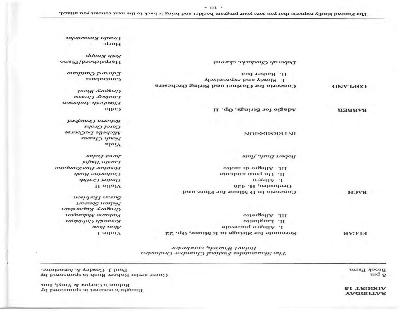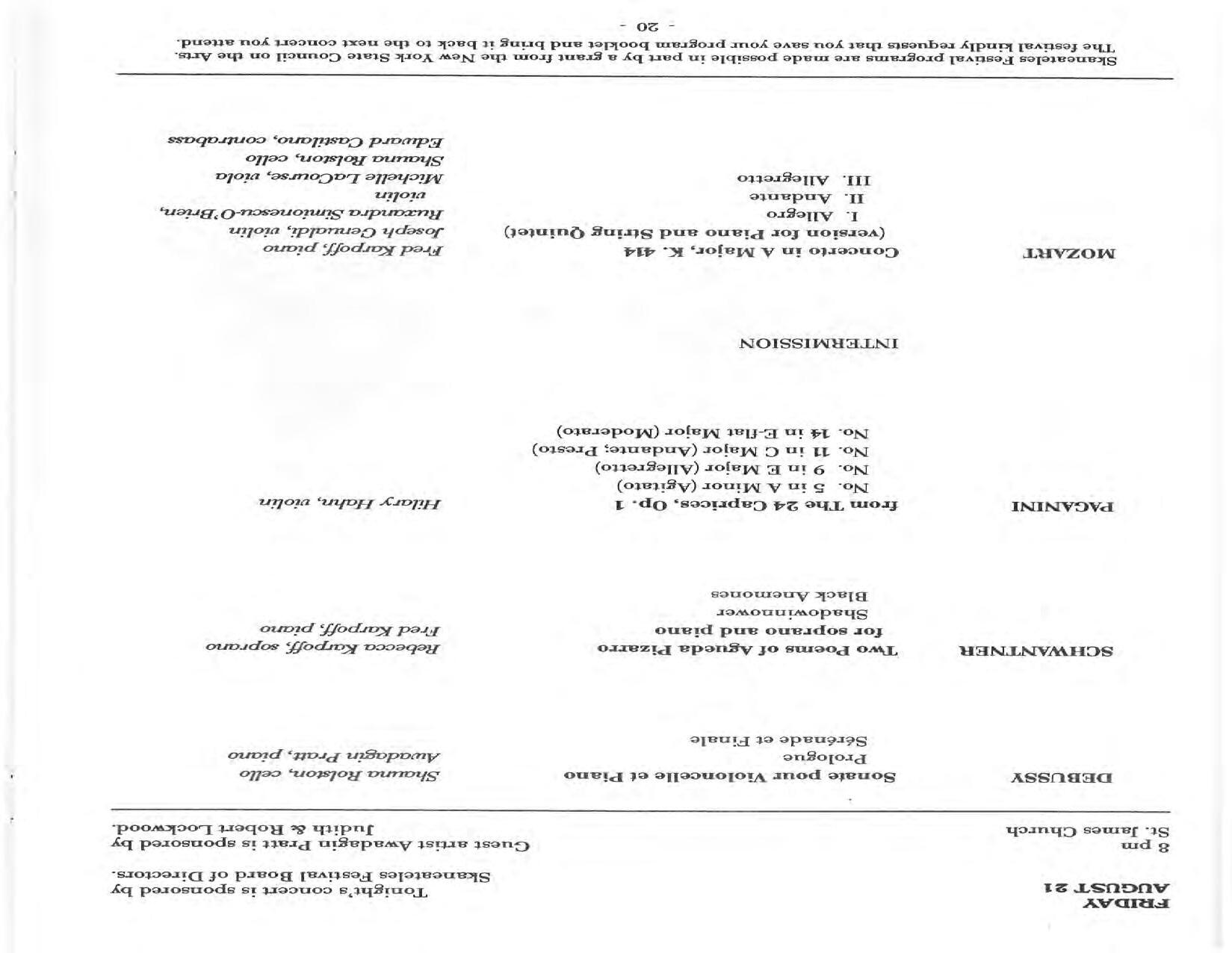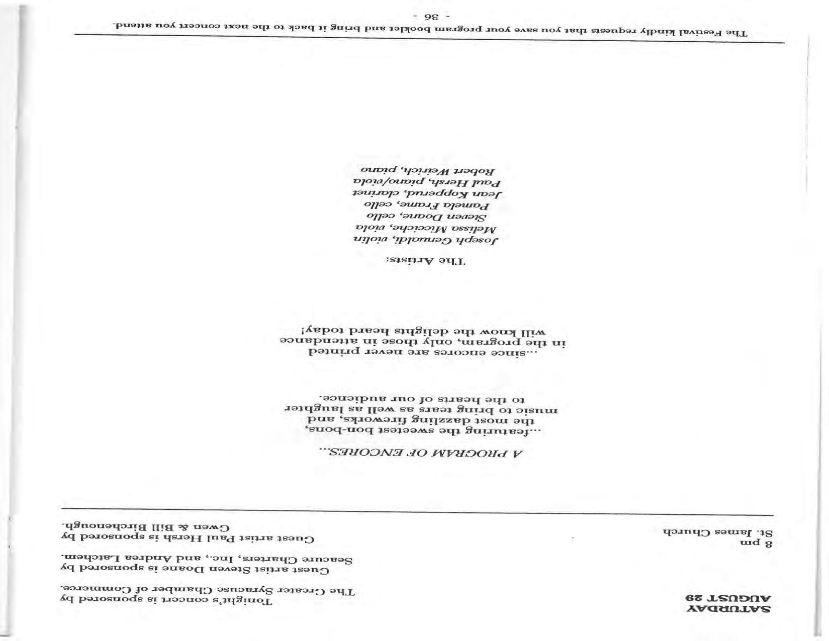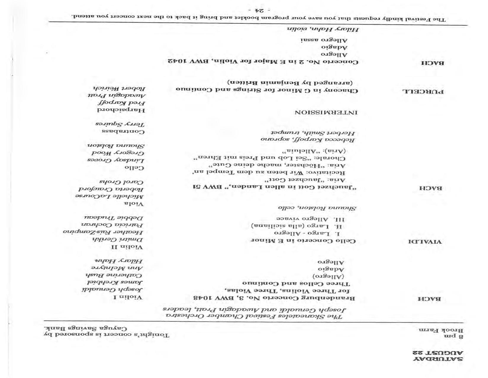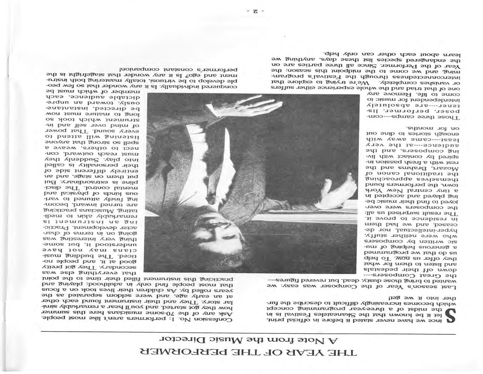 In February, the Festival and WCNY-FM win the Lucien Wulsin Award from National Public Radio’s Performance Today for the Aug. 19, 1989 recording of Delius’ On Hearing the First Cuckoo in Spring, Ian Hobson conducting. Joseph Genualdi is the violin soloist in Vivaldi’s The Four Seasons. The Peabody Trio performs Dvořák’s Piano Trio in F Minor. Aug. 16 is the American premiere of Joseph Thalken’s Introduction and Jazz Waltz for violin, soprano, saxophone, and piano, with Thalken on piano. Paul Hersh, piano; Andres Cardenes, violin; and Anne Williams, cello, perform Brahms’ Piano Trio in C Minor. In the final concert, Kenneth Kiesler conducts Beethoven’s Triple Concerto with Andres Cardenes (violin), Anne Williams (cello), and Robert Weirich (piano).