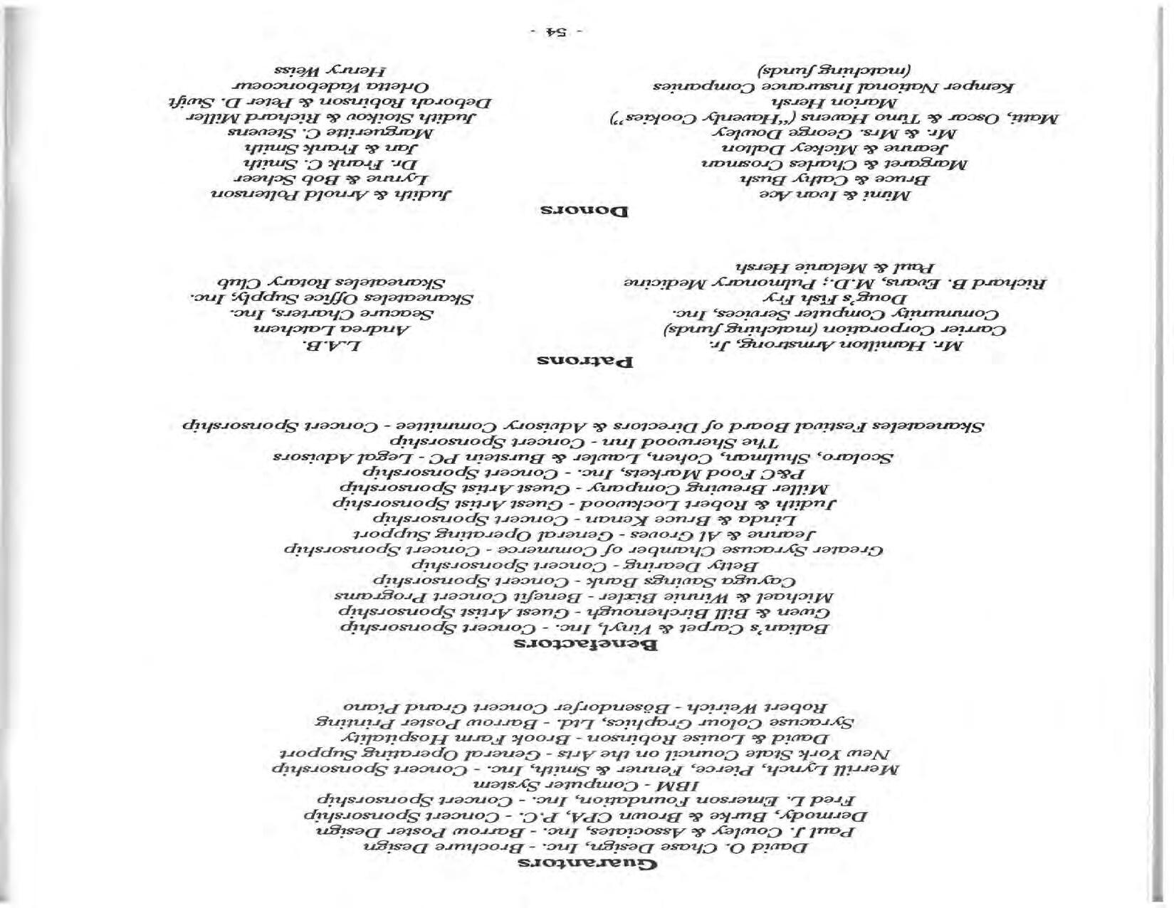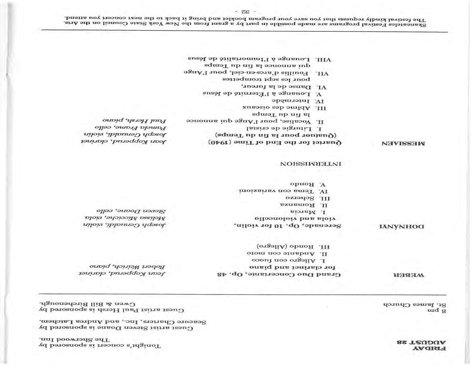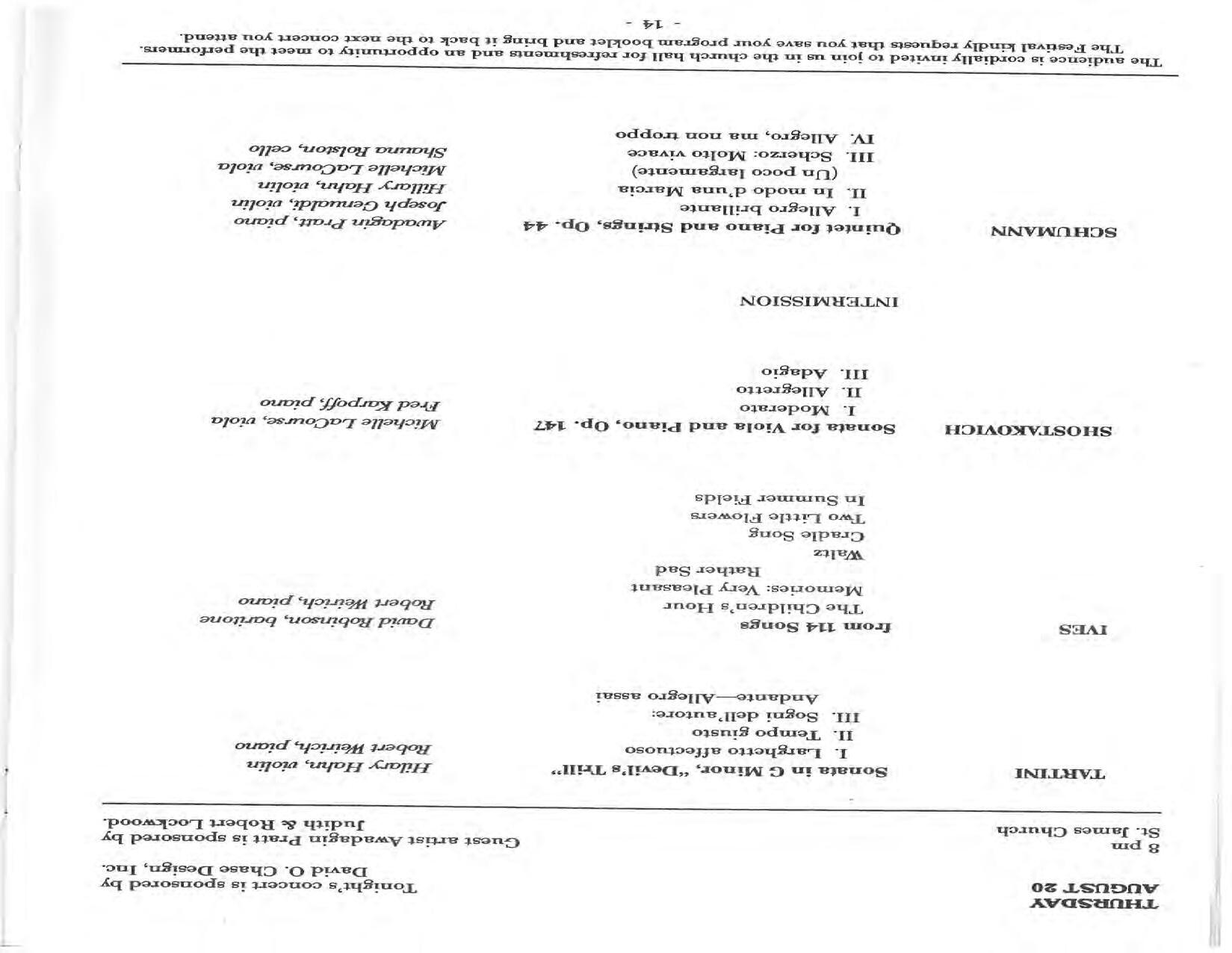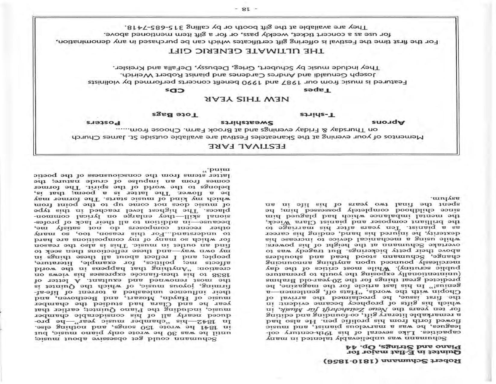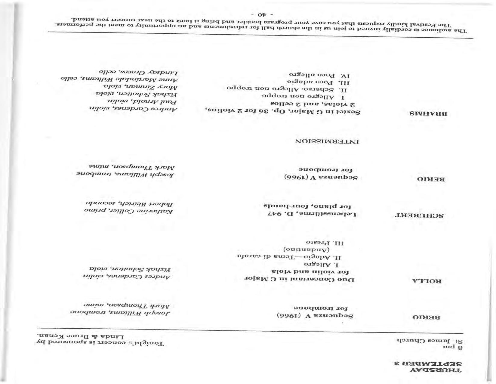 In February, the Festival and WCNY-FM win the Lucien Wulsin Award from National Public Radio’s Performance Today for the Aug. 19, 1989 recording of Delius’ On Hearing the First Cuckoo in Spring, Ian Hobson conducting. Joseph Genualdi is the violin soloist in Vivaldi’s The Four Seasons. The Peabody Trio performs Dvořák’s Piano Trio in F Minor. Aug. 16 is the American premiere of Joseph Thalken’s Introduction and Jazz Waltz for violin, soprano, saxophone, and piano, with Thalken on piano. Paul Hersh, piano; Andres Cardenes, violin; and Anne Williams, cello, perform Brahms’ Piano Trio in C Minor. In the final concert, Kenneth Kiesler conducts Beethoven’s Triple Concerto with Andres Cardenes (violin), Anne Williams (cello), and Robert Weirich (piano).