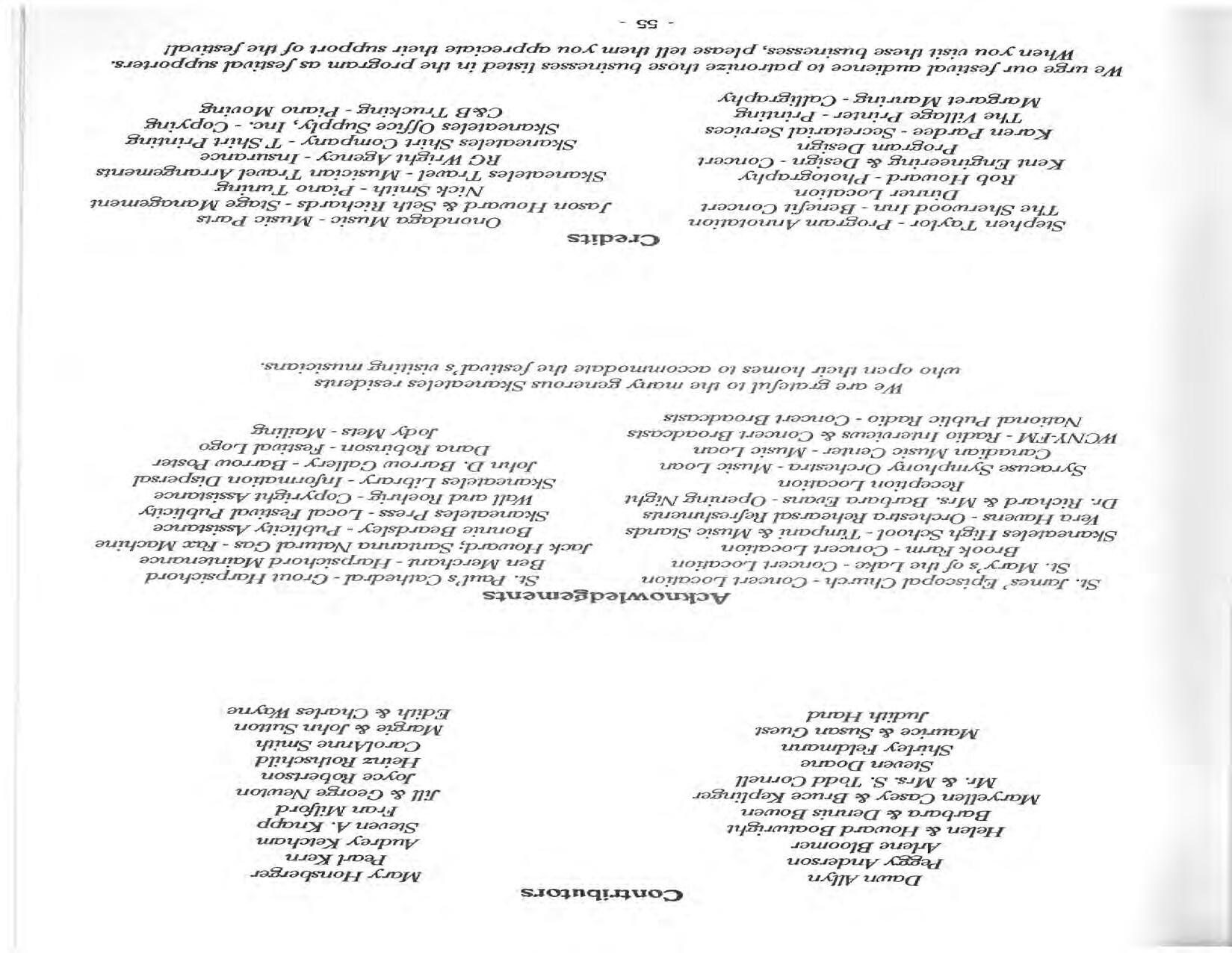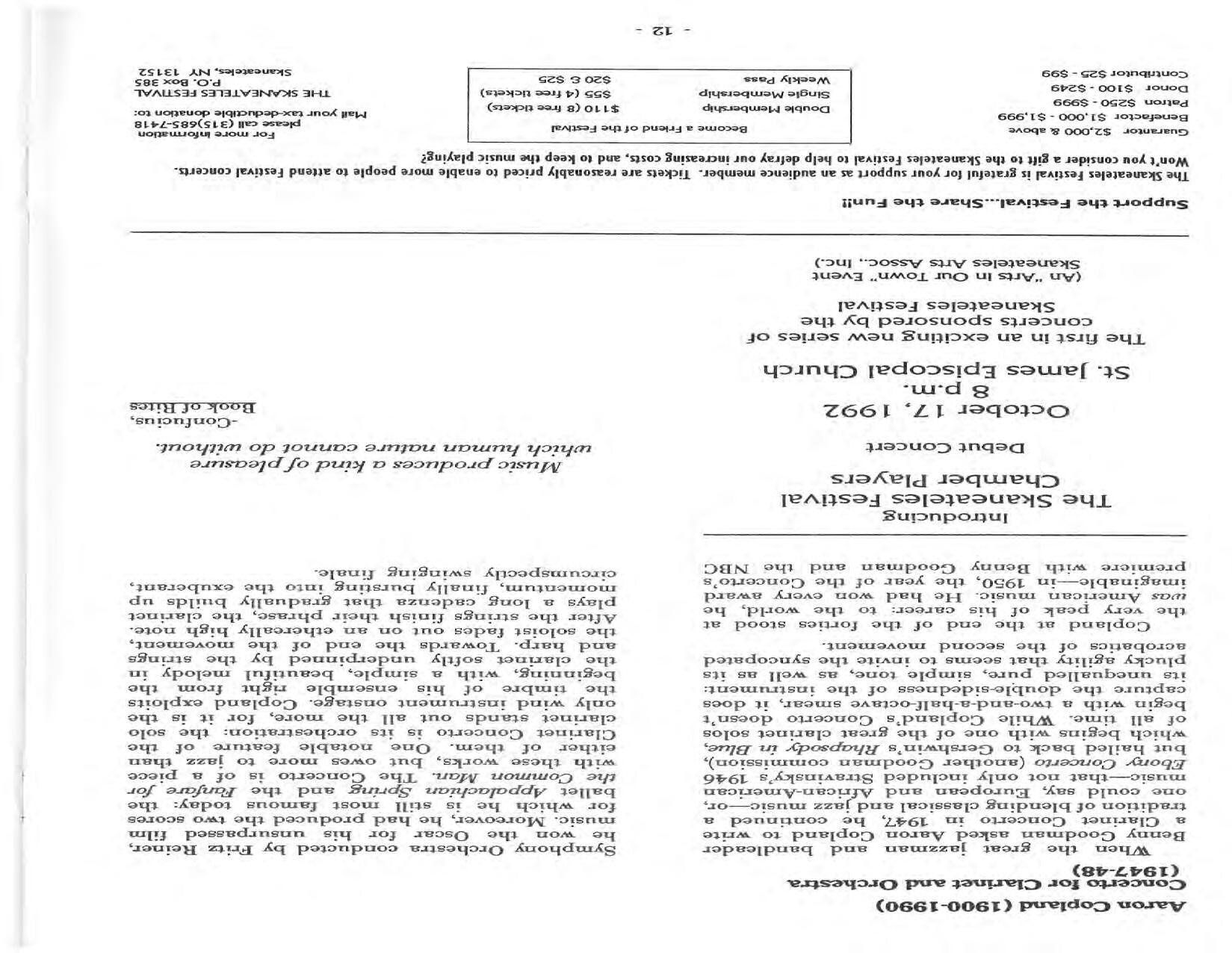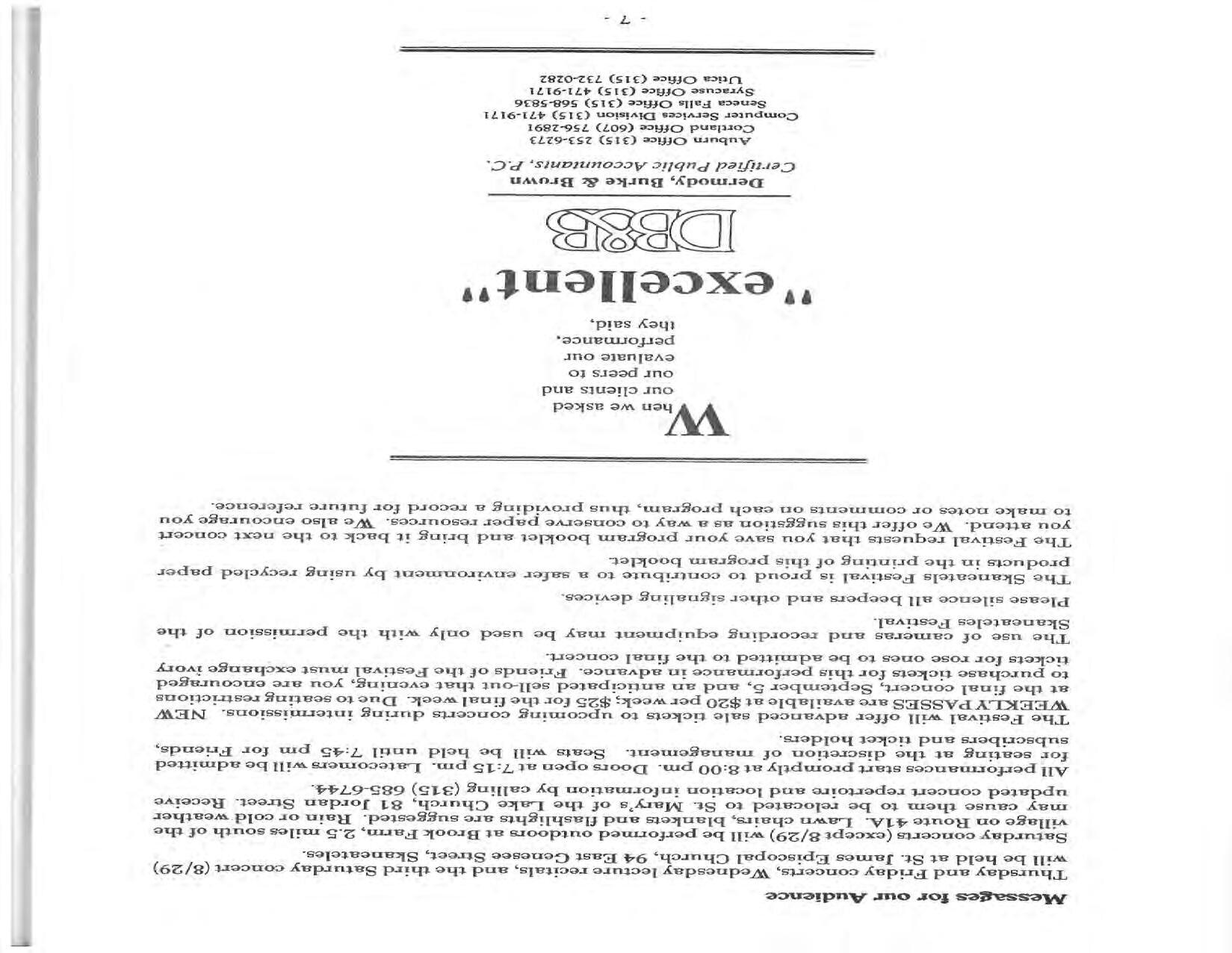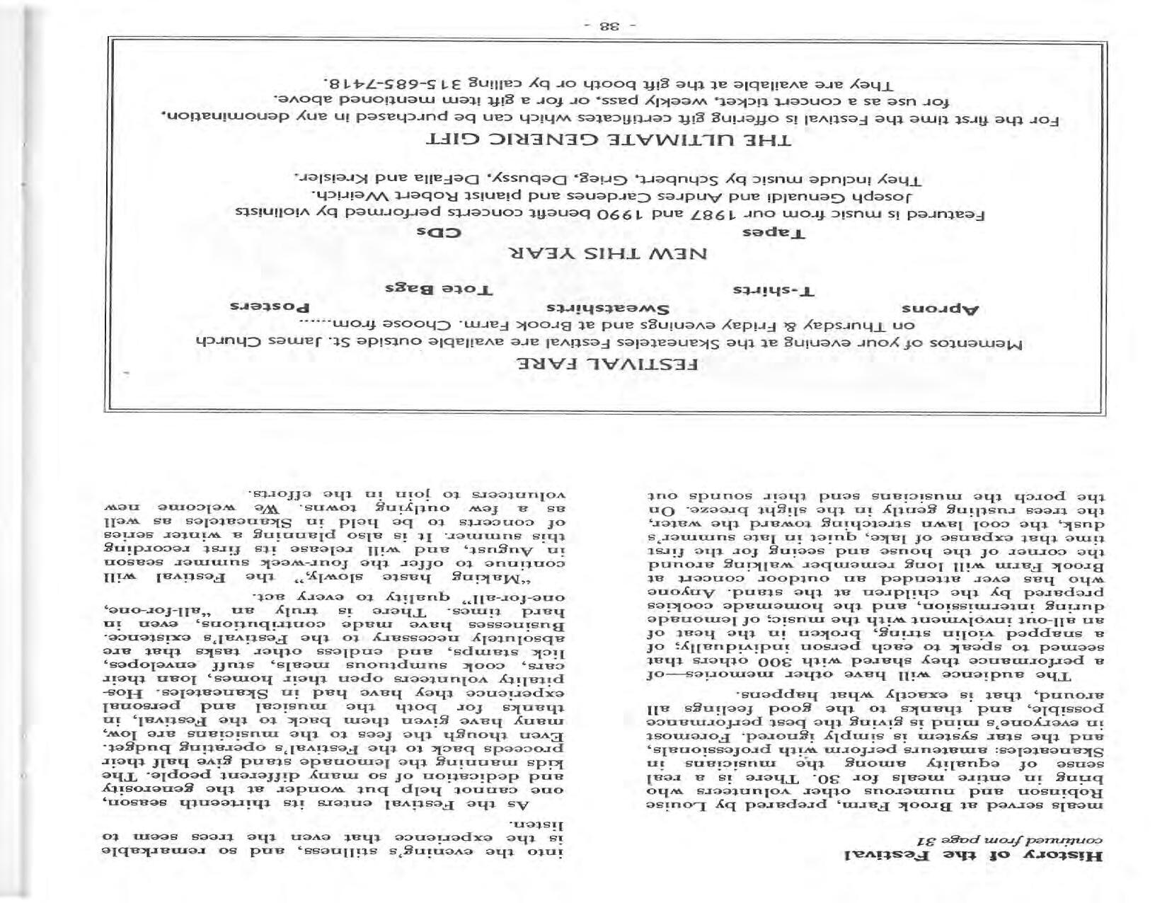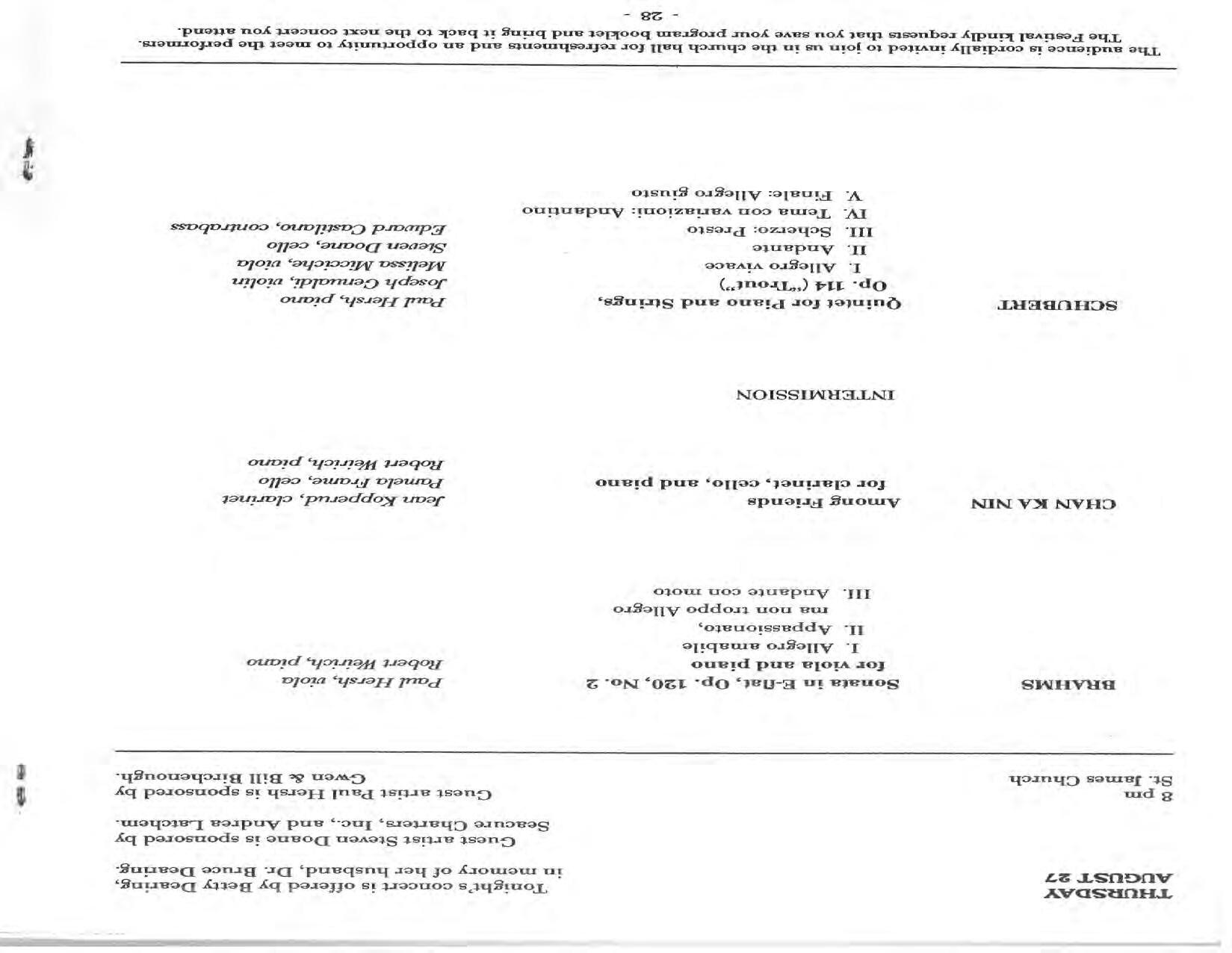 In February, the Festival and WCNY-FM win the Lucien Wulsin Award from National Public Radio’s Performance Today for the Aug. 19, 1989 recording of Delius’ On Hearing the First Cuckoo in Spring, Ian Hobson conducting. Joseph Genualdi is the violin soloist in Vivaldi’s The Four Seasons. The Peabody Trio performs Dvořák’s Piano Trio in F Minor. Aug. 16 is the American premiere of Joseph Thalken’s Introduction and Jazz Waltz for violin, soprano, saxophone, and piano, with Thalken on piano. Paul Hersh, piano; Andres Cardenes, violin; and Anne Williams, cello, perform Brahms’ Piano Trio in C Minor. In the final concert, Kenneth Kiesler conducts Beethoven’s Triple Concerto with Andres Cardenes (violin), Anne Williams (cello), and Robert Weirich (piano).