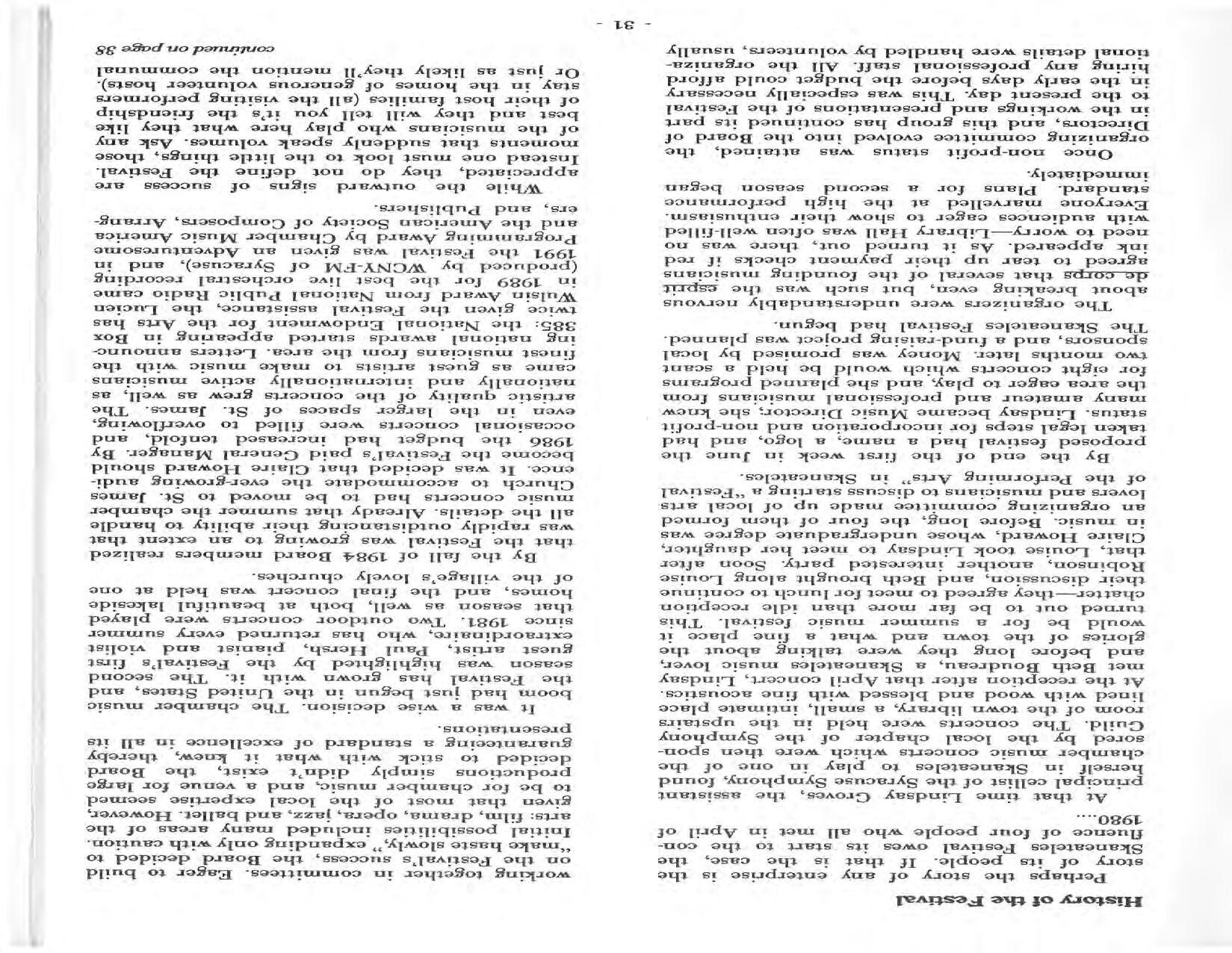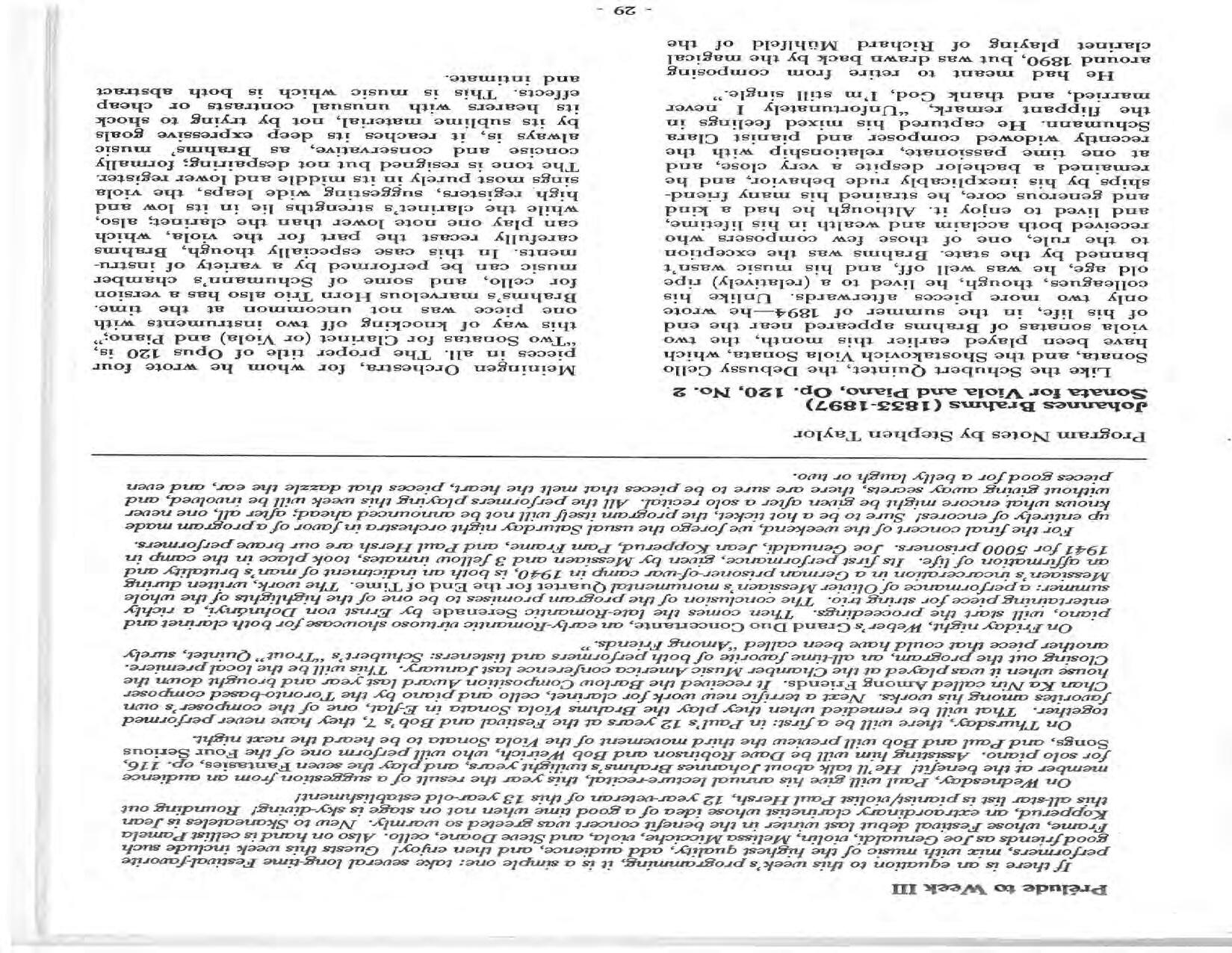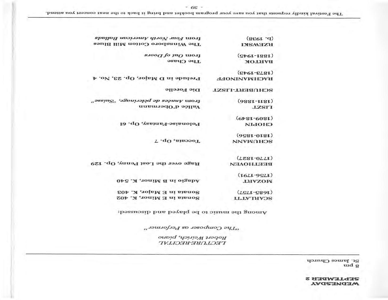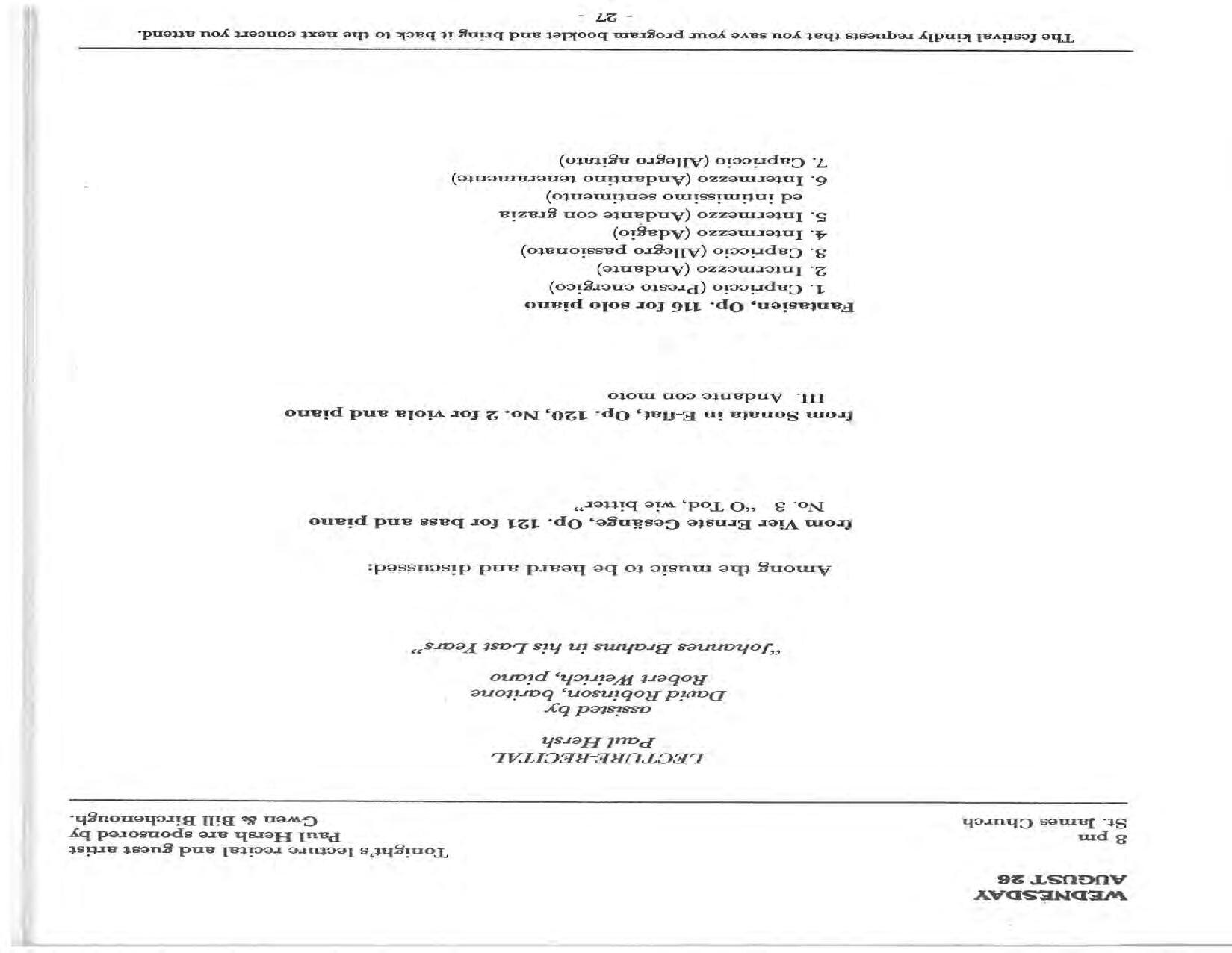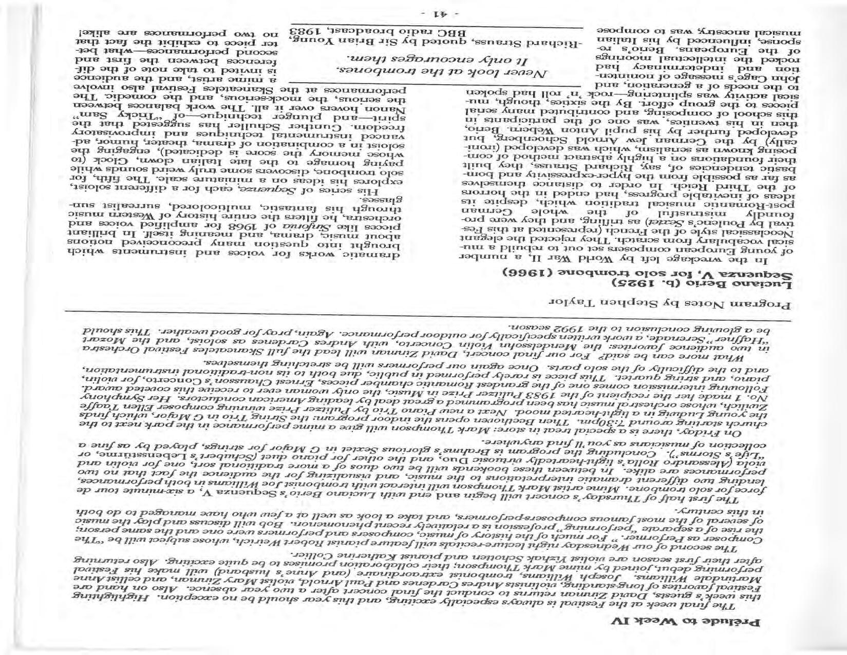 In February, the Festival and WCNY-FM win the Lucien Wulsin Award from National Public Radio’s Performance Today for the Aug. 19, 1989 recording of Delius’ On Hearing the First Cuckoo in Spring, Ian Hobson conducting. Joseph Genualdi is the violin soloist in Vivaldi’s The Four Seasons. The Peabody Trio performs Dvořák’s Piano Trio in F Minor. Aug. 16 is the American premiere of Joseph Thalken’s Introduction and Jazz Waltz for violin, soprano, saxophone, and piano, with Thalken on piano. Paul Hersh, piano; Andres Cardenes, violin; and Anne Williams, cello, perform Brahms’ Piano Trio in C Minor. In the final concert, Kenneth Kiesler conducts Beethoven’s Triple Concerto with Andres Cardenes (violin), Anne Williams (cello), and Robert Weirich (piano).