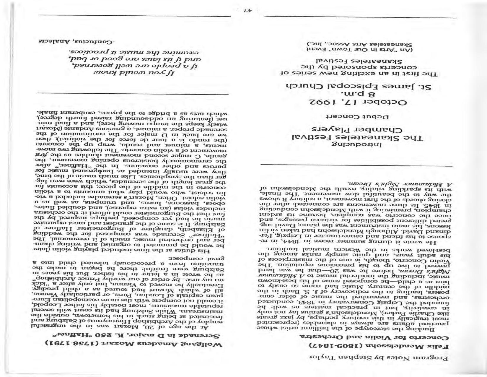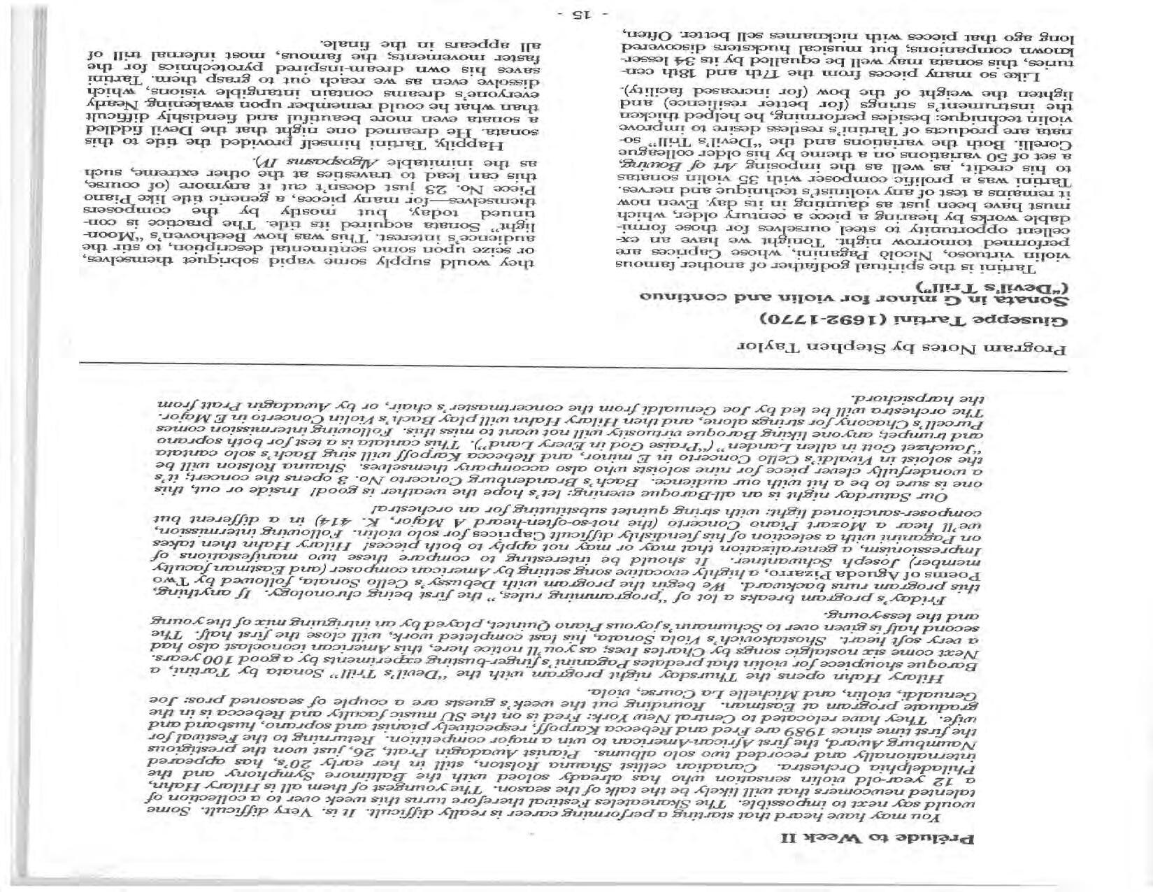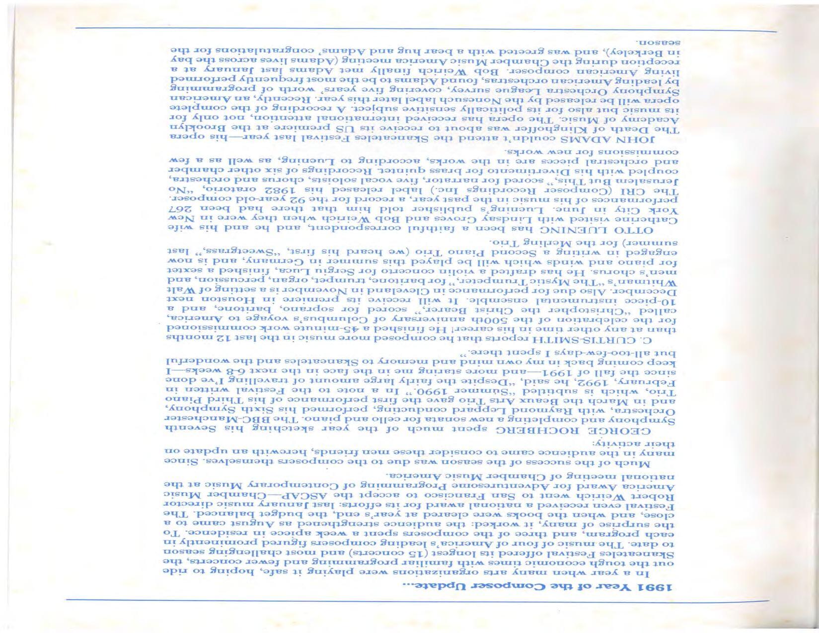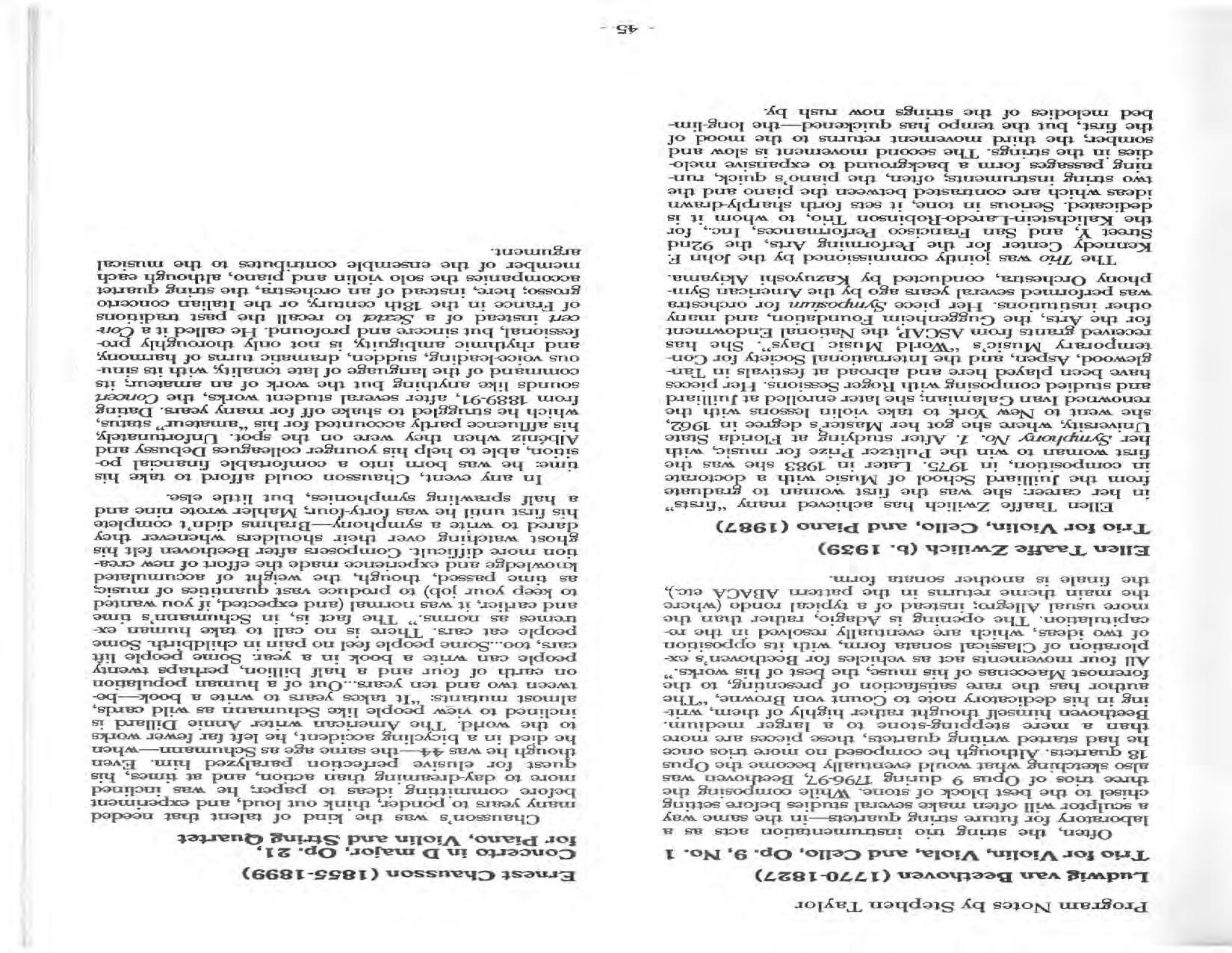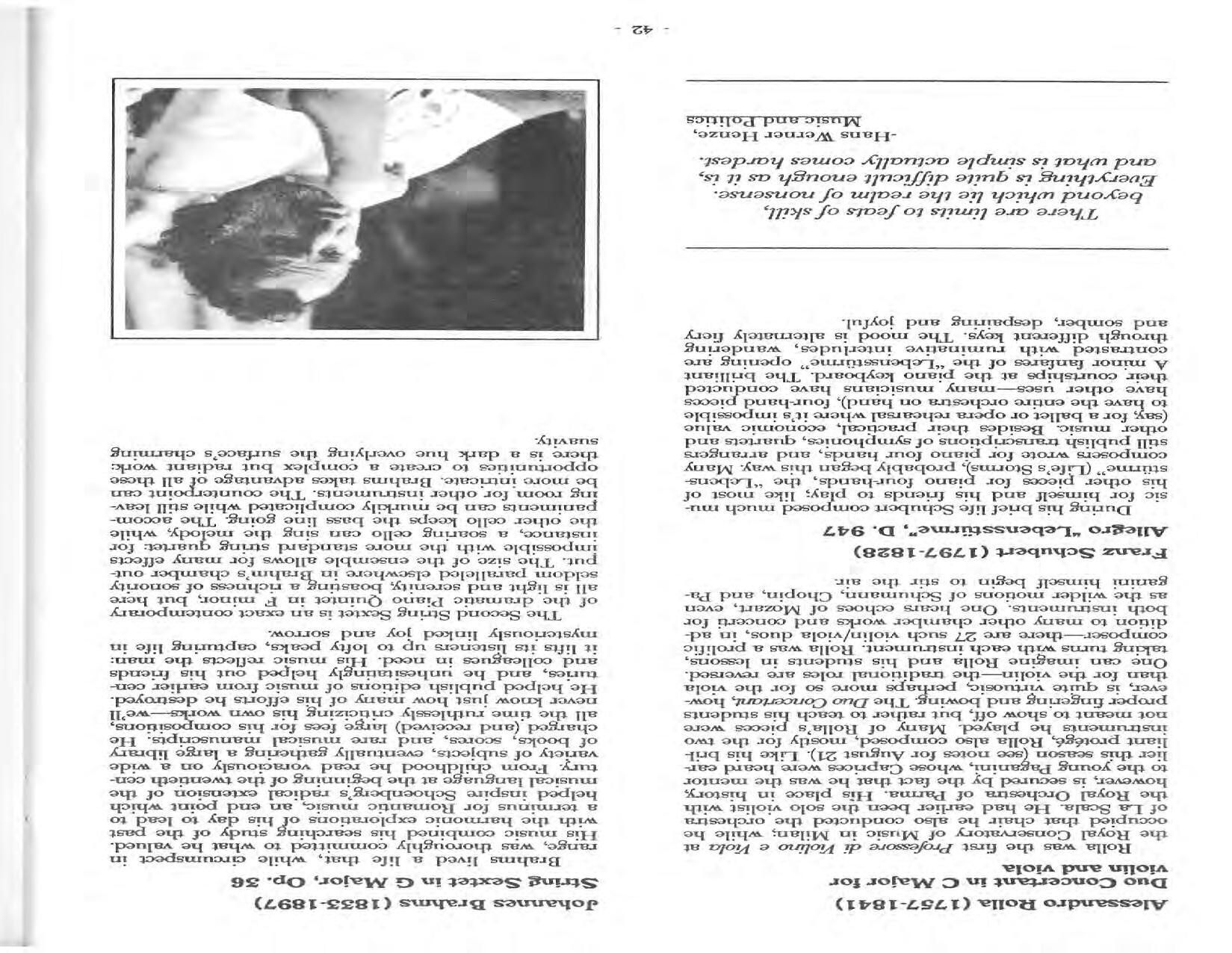 In February, the Festival and WCNY-FM win the Lucien Wulsin Award from National Public Radio’s Performance Today for the Aug. 19, 1989 recording of Delius’ On Hearing the First Cuckoo in Spring, Ian Hobson conducting. Joseph Genualdi is the violin soloist in Vivaldi’s The Four Seasons. The Peabody Trio performs Dvořák’s Piano Trio in F Minor. Aug. 16 is the American premiere of Joseph Thalken’s Introduction and Jazz Waltz for violin, soprano, saxophone, and piano, with Thalken on piano. Paul Hersh, piano; Andres Cardenes, violin; and Anne Williams, cello, perform Brahms’ Piano Trio in C Minor. In the final concert, Kenneth Kiesler conducts Beethoven’s Triple Concerto with Andres Cardenes (violin), Anne Williams (cello), and Robert Weirich (piano).