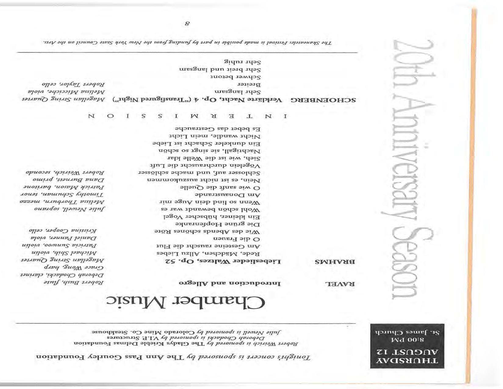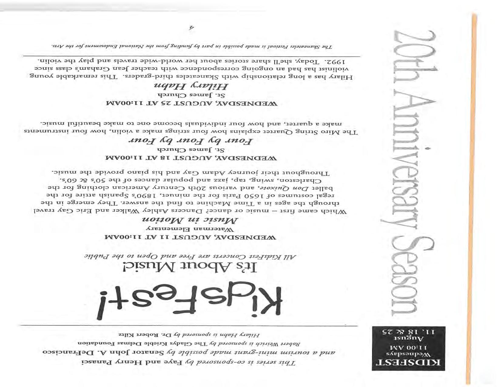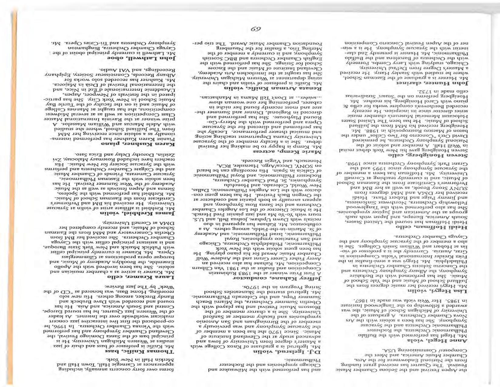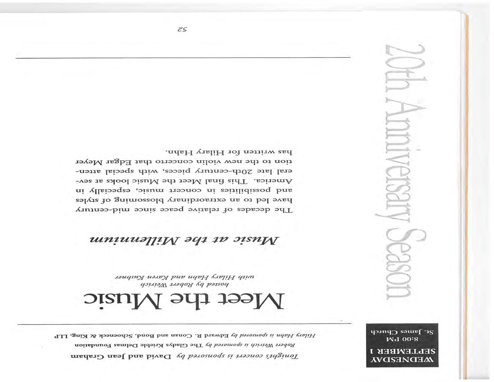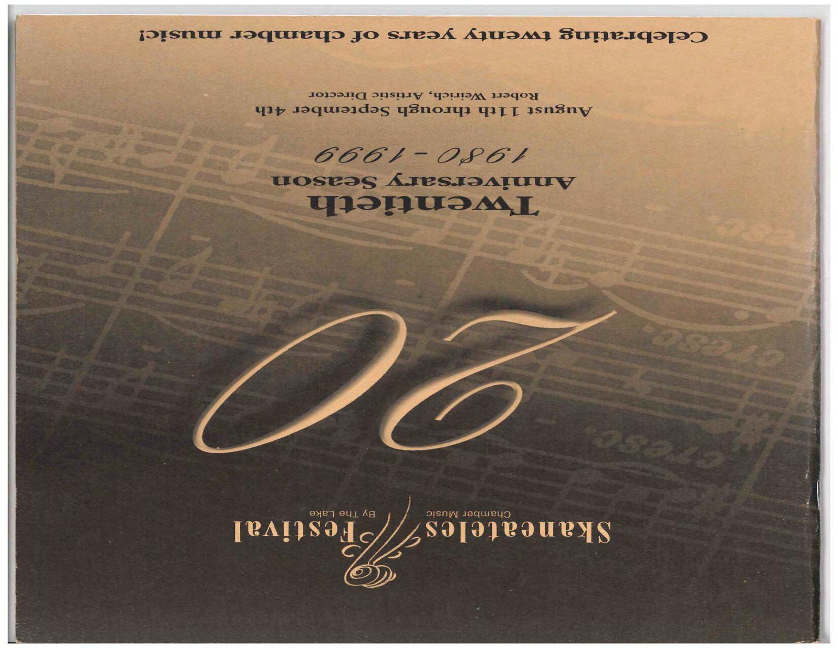 The Festival presents its first opera, Britten’s Noye’s Fludde, conducted by Grant Cooper. The Magellan String Quartet performs Ravel, Schoenberg’s Transfigured Night, and Strauss. Awadagin Pratt joins the Miro String Quartet for Dvořák’s Quintet; the Miro also plays Haydn and Bartók. Pratt solos in Mozart’s Piano Concerto No. 23 and conducts Beethoven’s Symphony No. 3. Hilary Hahn performs Beethoven’s Piano Trio, Brahms’ String Sextet, and Brahms’ Violin Sonata No. 2. In the final concert, with the composer present, Jeffrey Kahane conducts Hahn in the second-ever performance of Edgar Meyer’s Violin Concerto, shortly before she records the work.