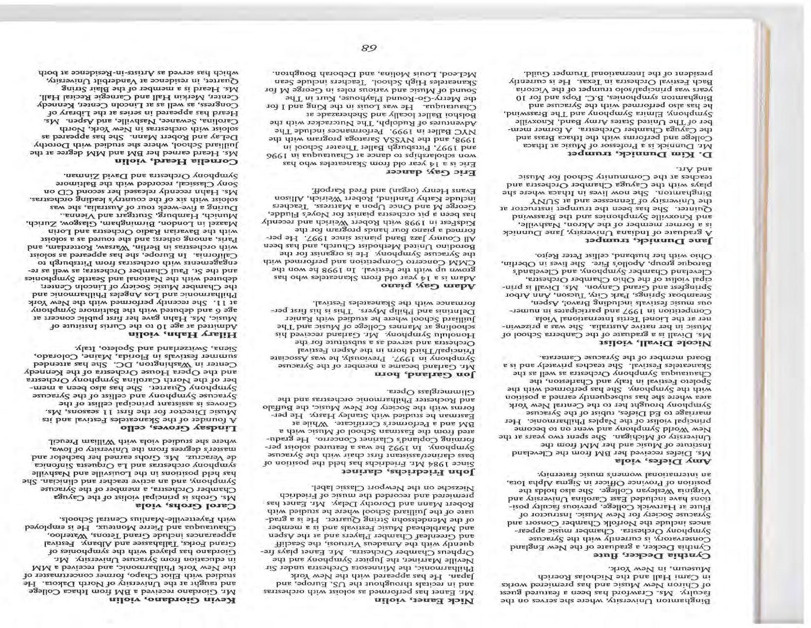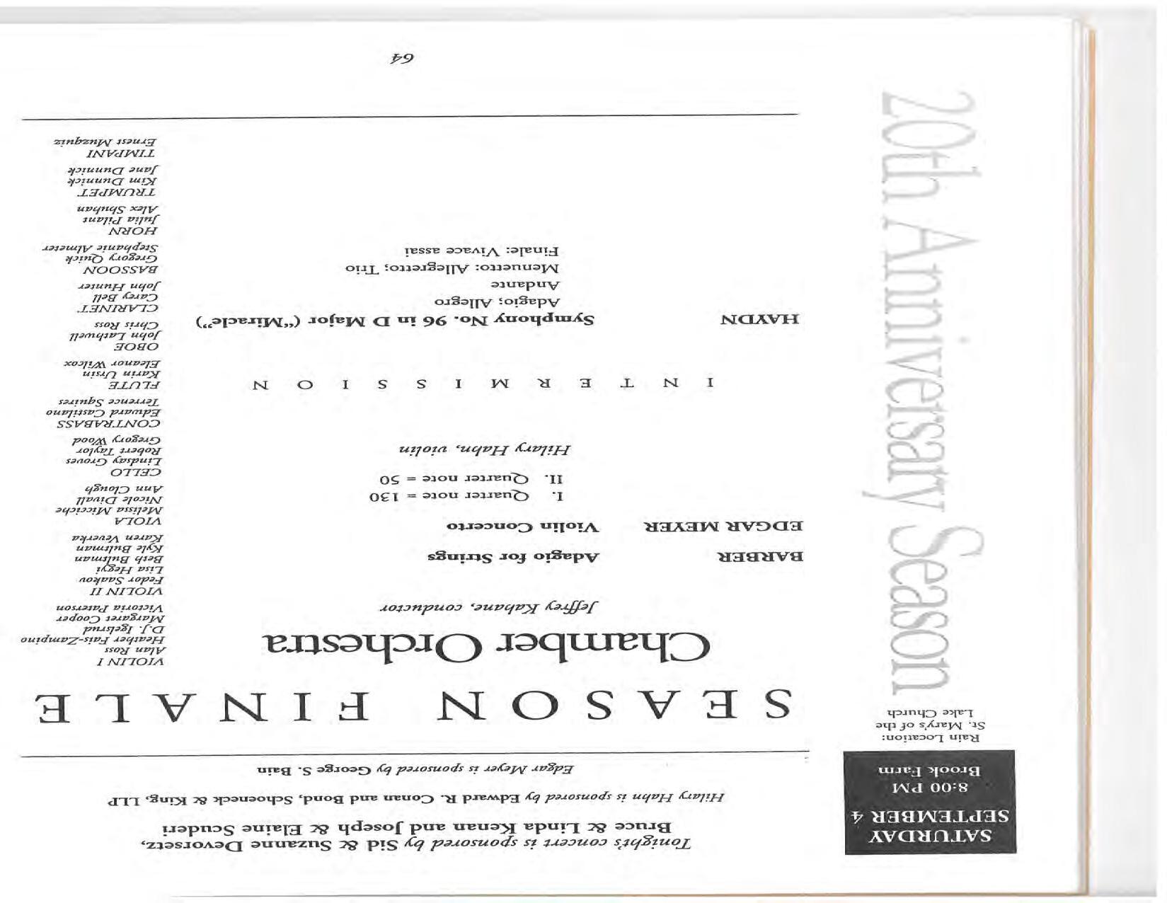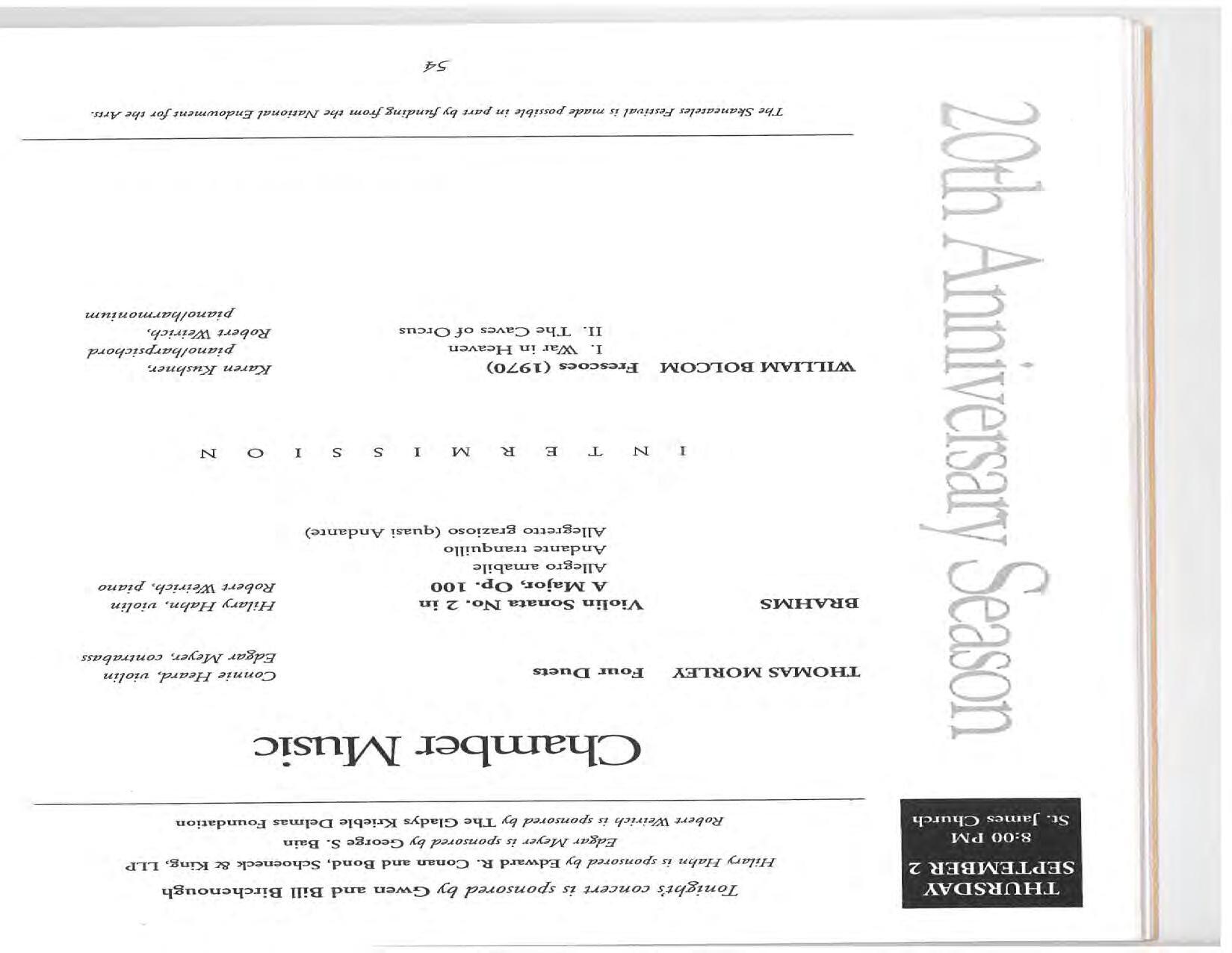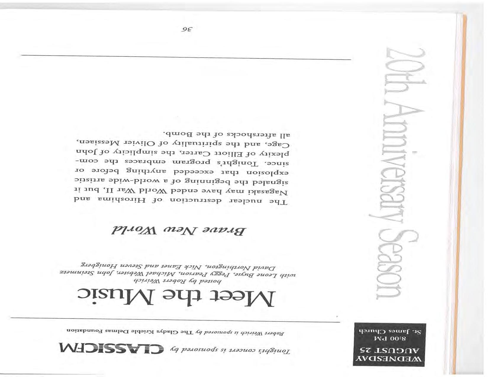 The Festival presents its first opera, Britten’s Noye’s Fludde, conducted by Grant Cooper. The Magellan String Quartet performs Ravel, Schoenberg’s Transfigured Night, and Strauss. Awadagin Pratt joins the Miro String Quartet for Dvořák’s Quintet; the Miro also plays Haydn and Bartók. Pratt solos in Mozart’s Piano Concerto No. 23 and conducts Beethoven’s Symphony No. 3. Hilary Hahn performs Beethoven’s Piano Trio, Brahms’ String Sextet, and Brahms’ Violin Sonata No. 2. In the final concert, with the composer present, Jeffrey Kahane conducts Hahn in the second-ever performance of Edgar Meyer’s Violin Concerto, shortly before she records the work.