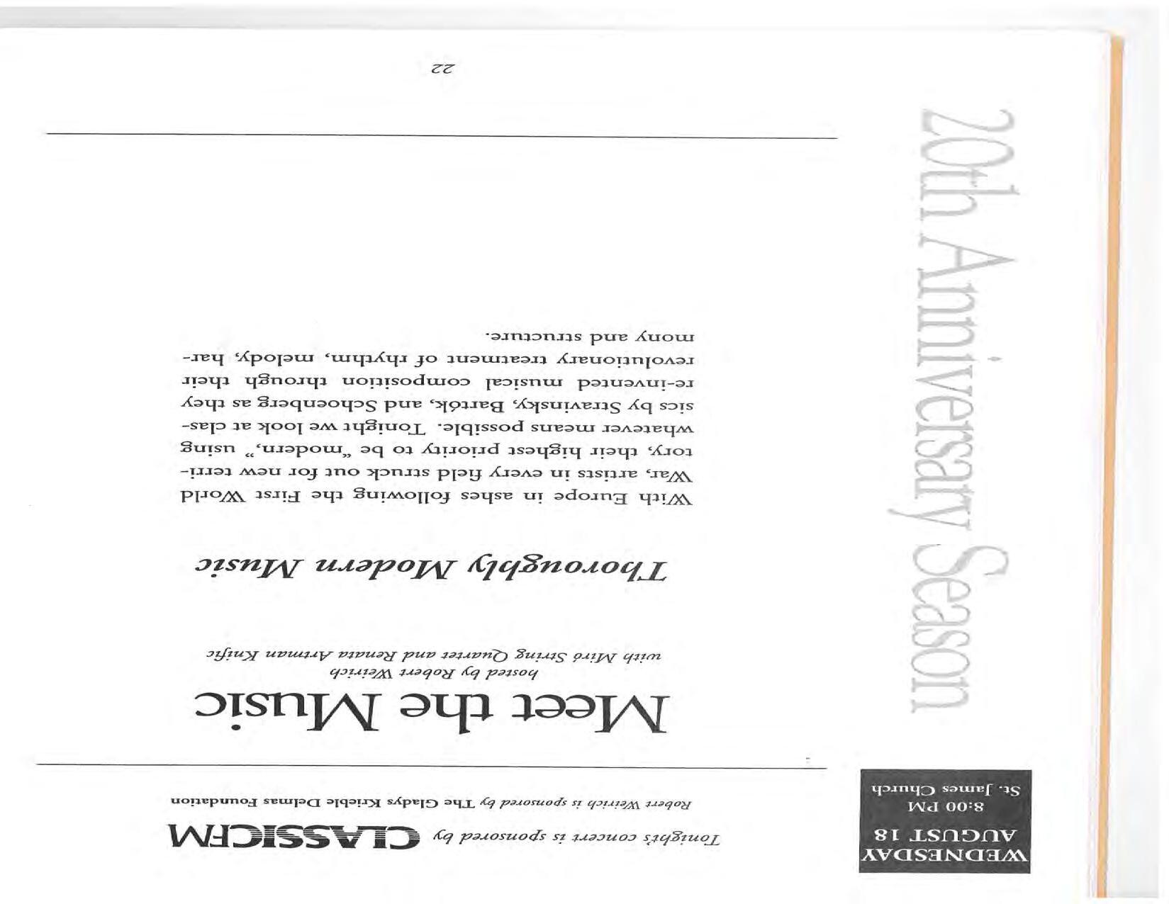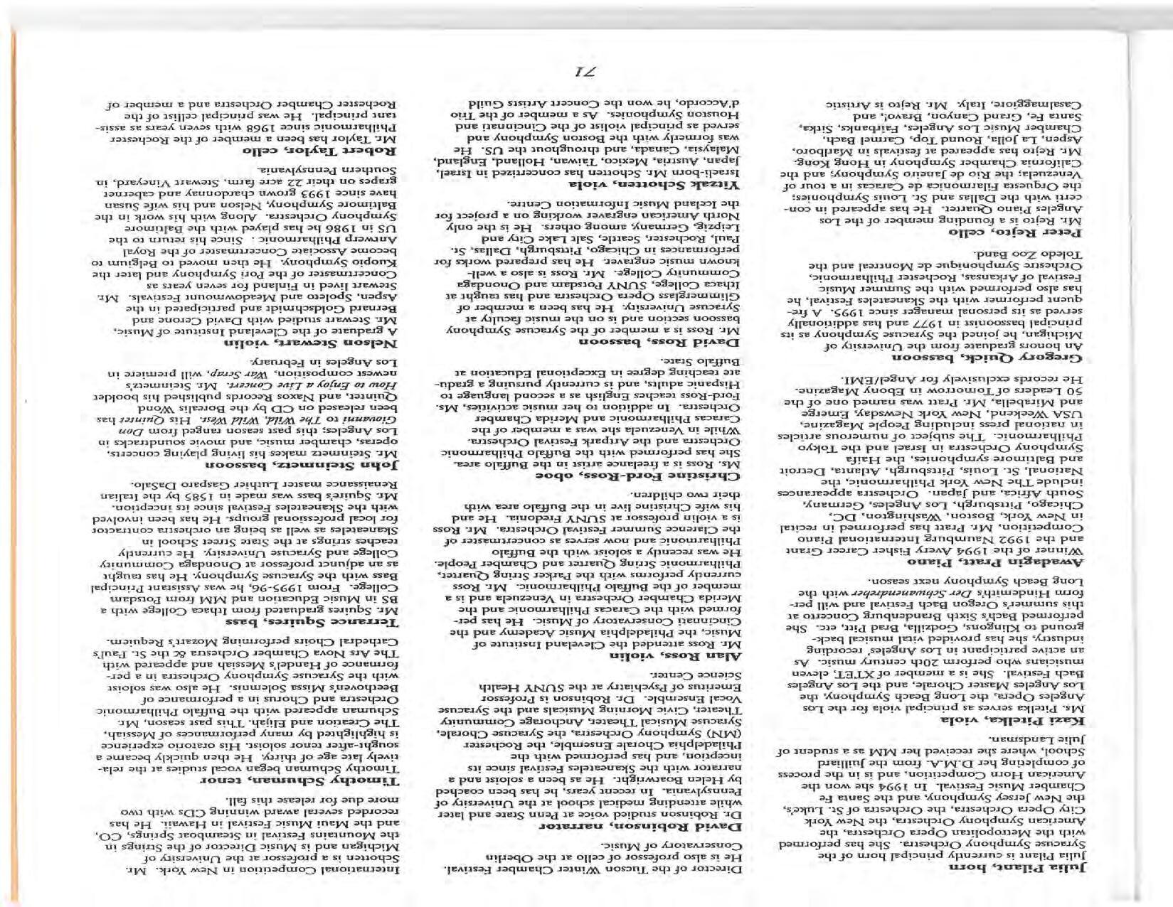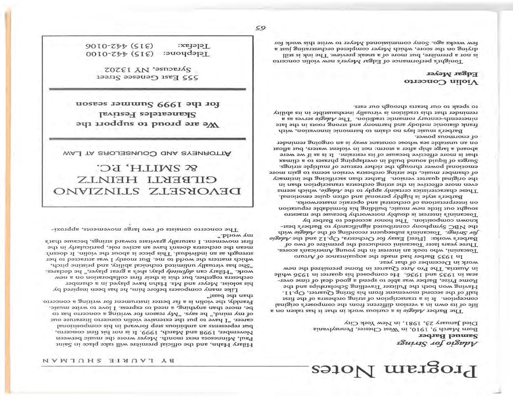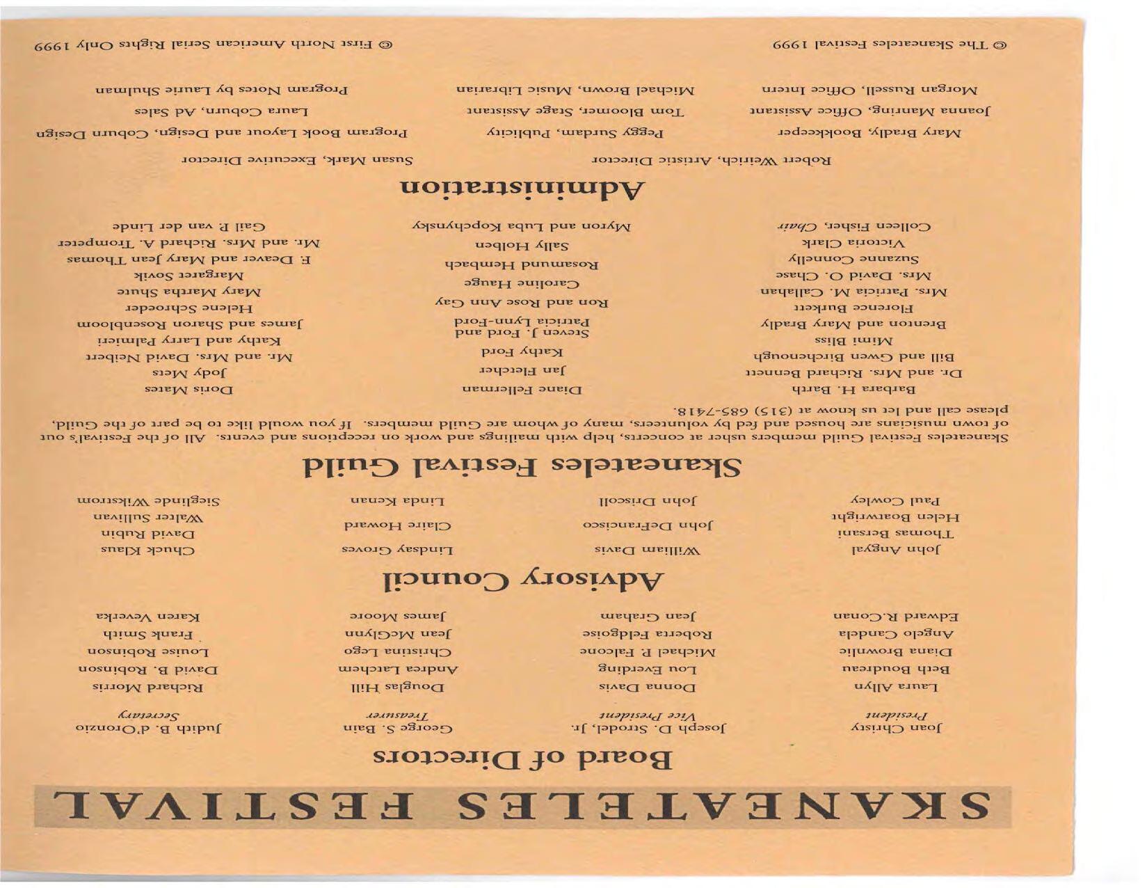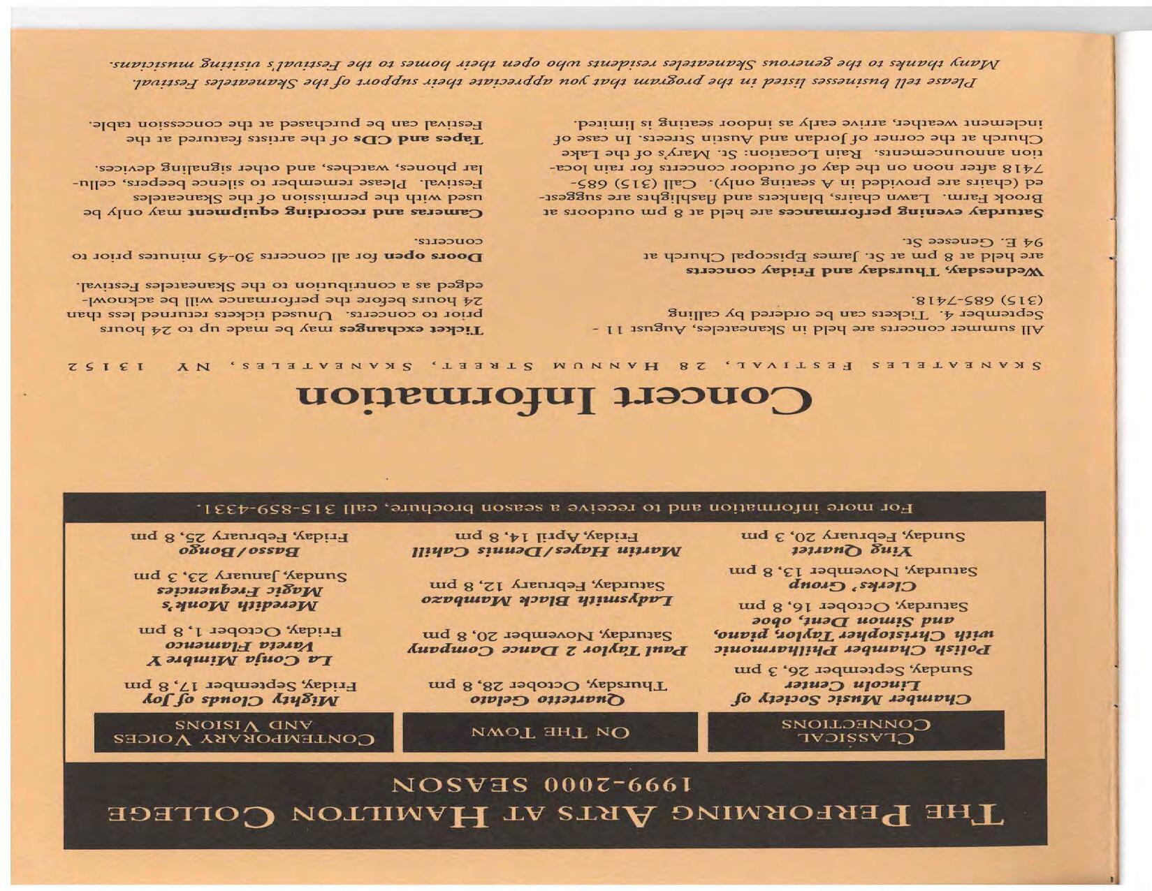 The Festival presents its first opera, Britten’s Noye’s Fludde, conducted by Grant Cooper. The Magellan String Quartet performs Ravel, Schoenberg’s Transfigured Night, and Strauss. Awadagin Pratt joins the Miro String Quartet for Dvořák’s Quintet; the Miro also plays Haydn and Bartók. Pratt solos in Mozart’s Piano Concerto No. 23 and conducts Beethoven’s Symphony No. 3. Hilary Hahn performs Beethoven’s Piano Trio, Brahms’ String Sextet, and Brahms’ Violin Sonata No. 2. In the final concert, with the composer present, Jeffrey Kahane conducts Hahn in the second-ever performance of Edgar Meyer’s Violin Concerto, shortly before she records the work.