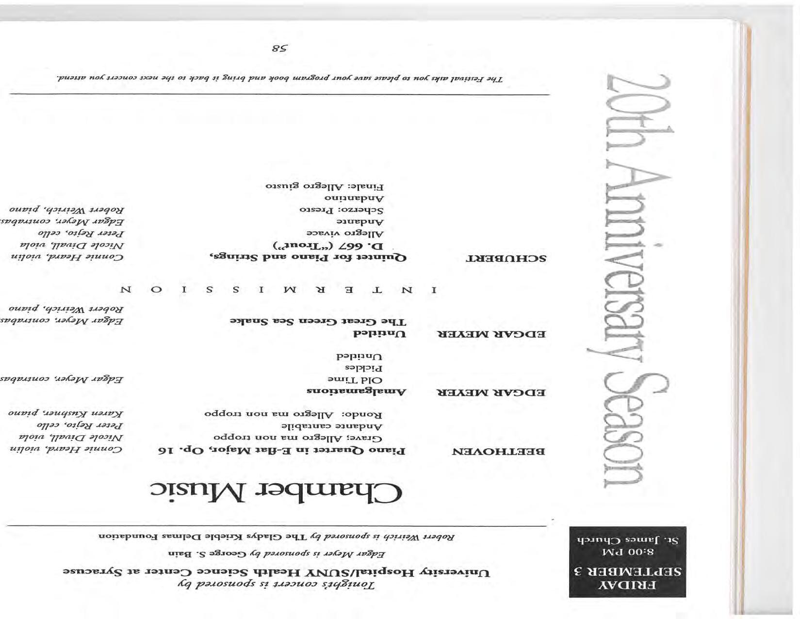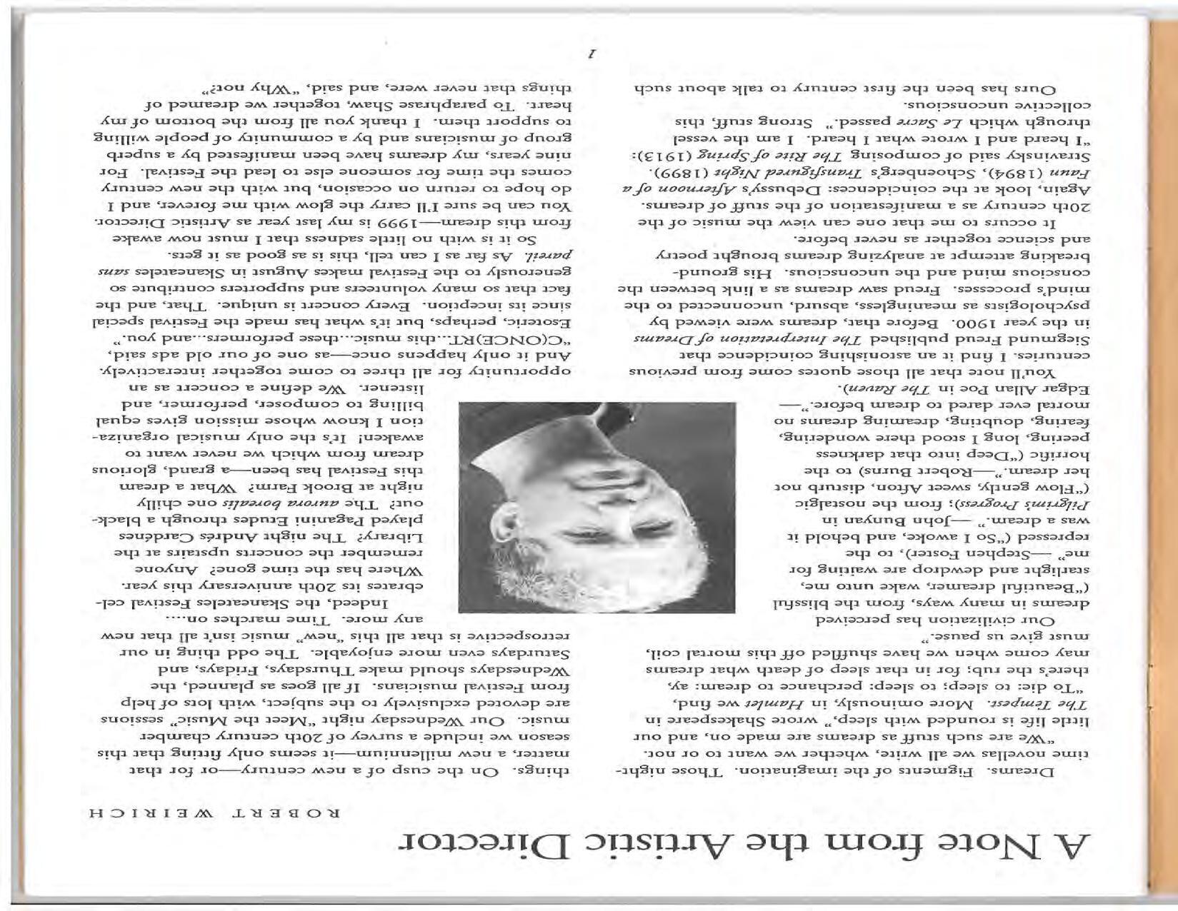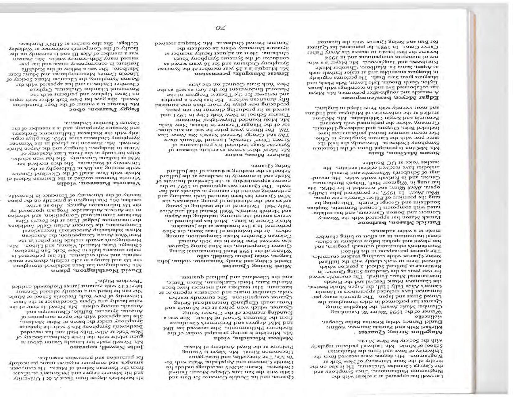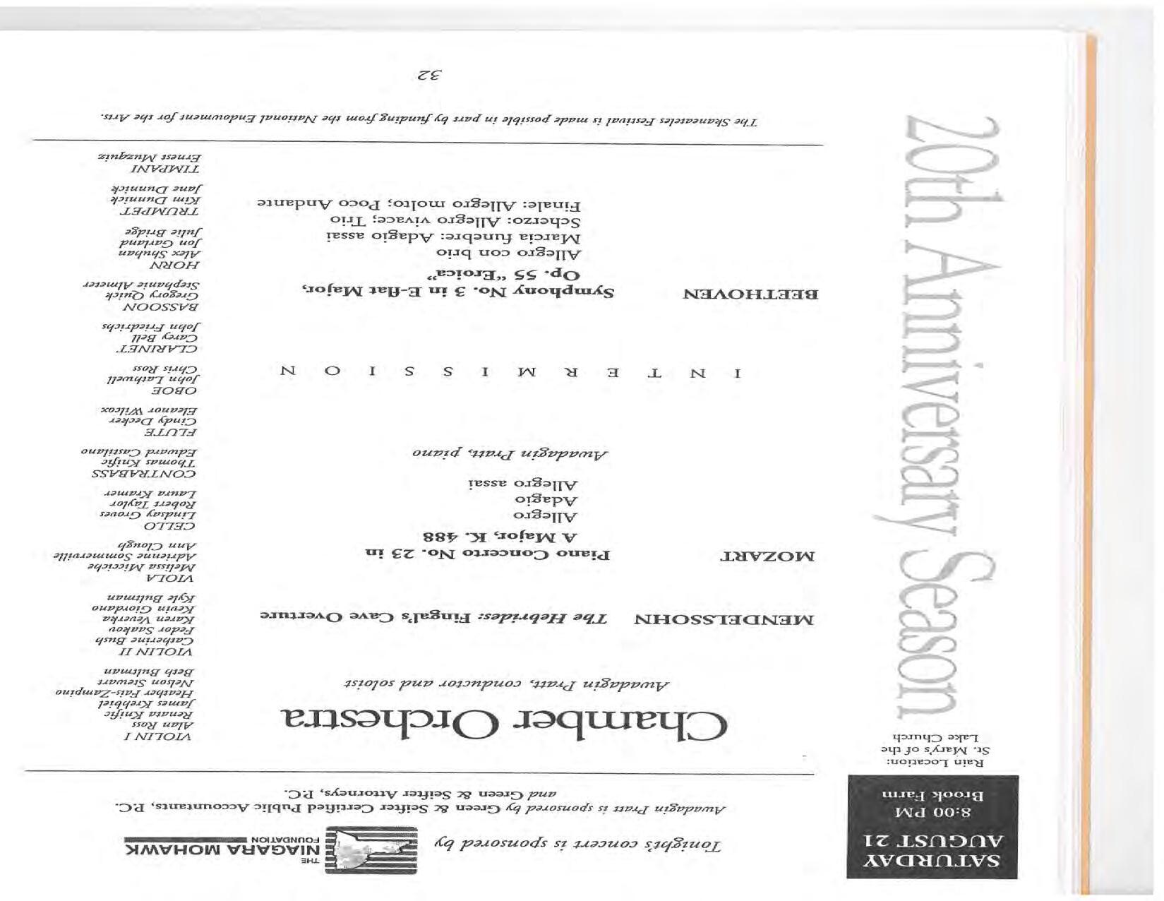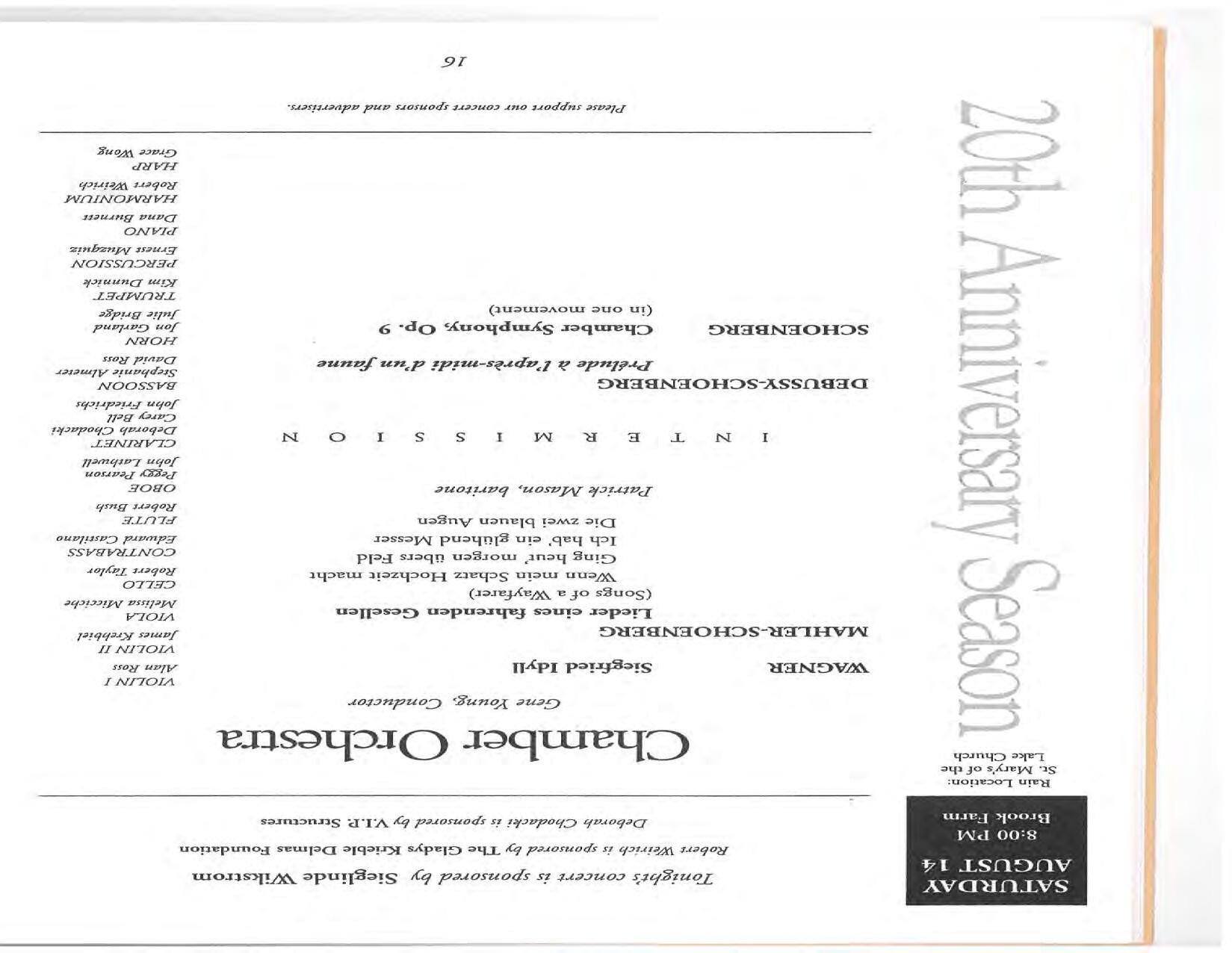 The Festival presents its first opera, Britten’s Noye’s Fludde, conducted by Grant Cooper. The Magellan String Quartet performs Ravel, Schoenberg’s Transfigured Night, and Strauss. Awadagin Pratt joins the Miro String Quartet for Dvořák’s Quintet; the Miro also plays Haydn and Bartók. Pratt solos in Mozart’s Piano Concerto No. 23 and conducts Beethoven’s Symphony No. 3. Hilary Hahn performs Beethoven’s Piano Trio, Brahms’ String Sextet, and Brahms’ Violin Sonata No. 2. In the final concert, with the composer present, Jeffrey Kahane conducts Hahn in the second-ever performance of Edgar Meyer’s Violin Concerto, shortly before she records the work.