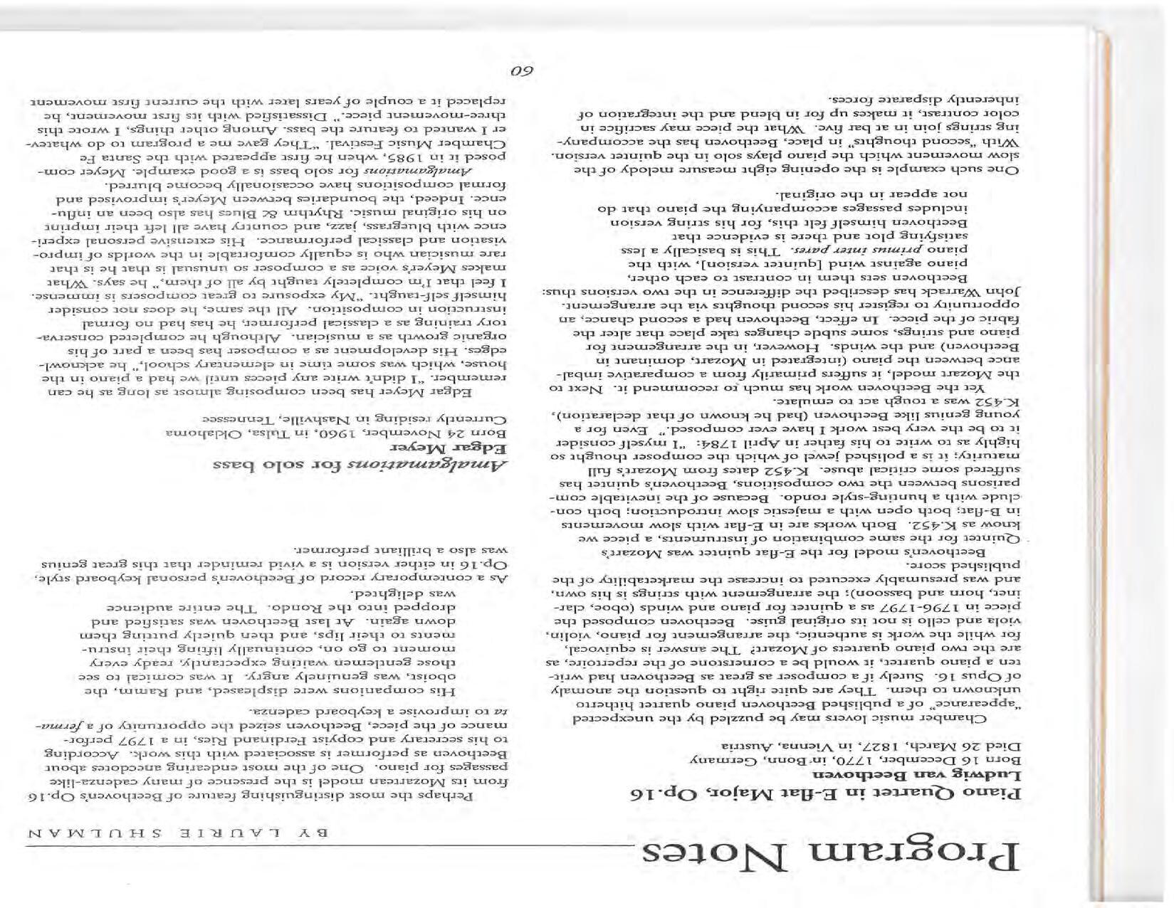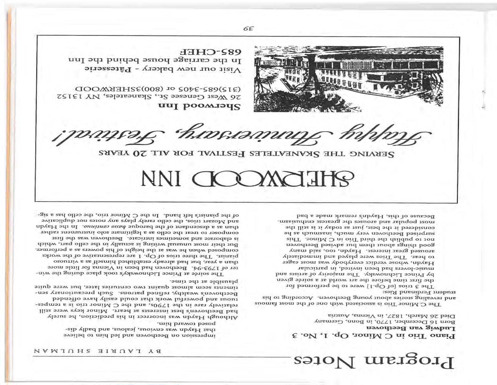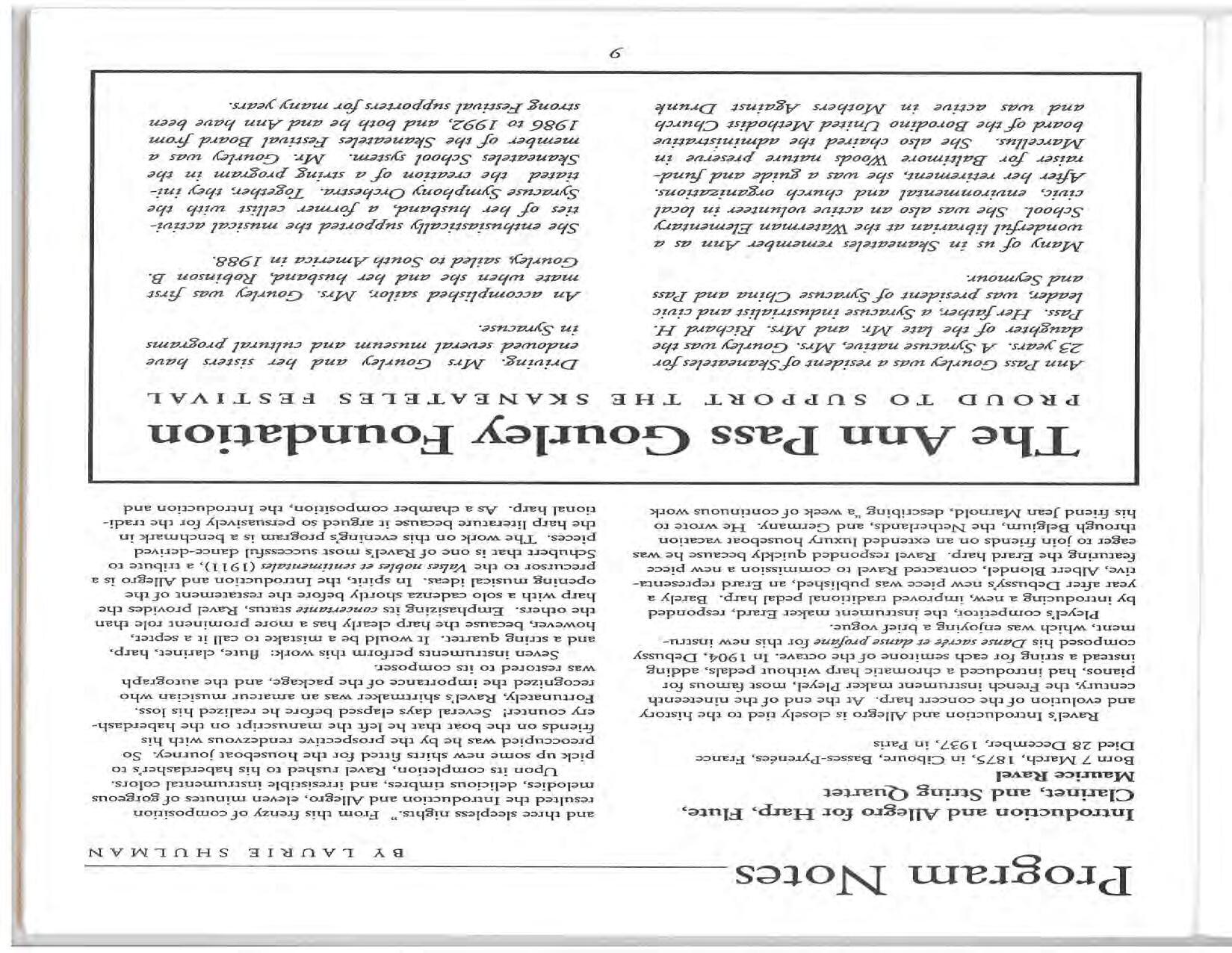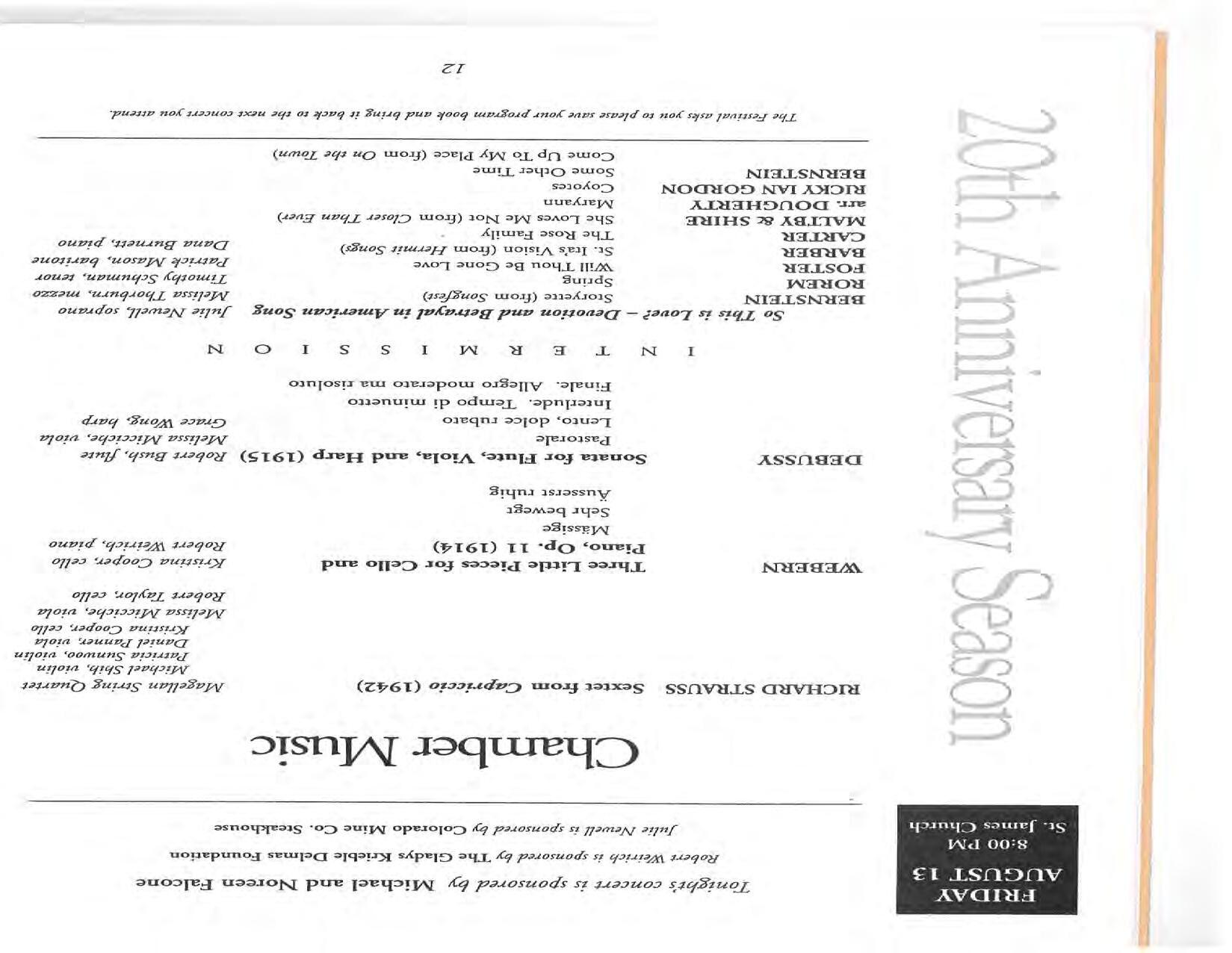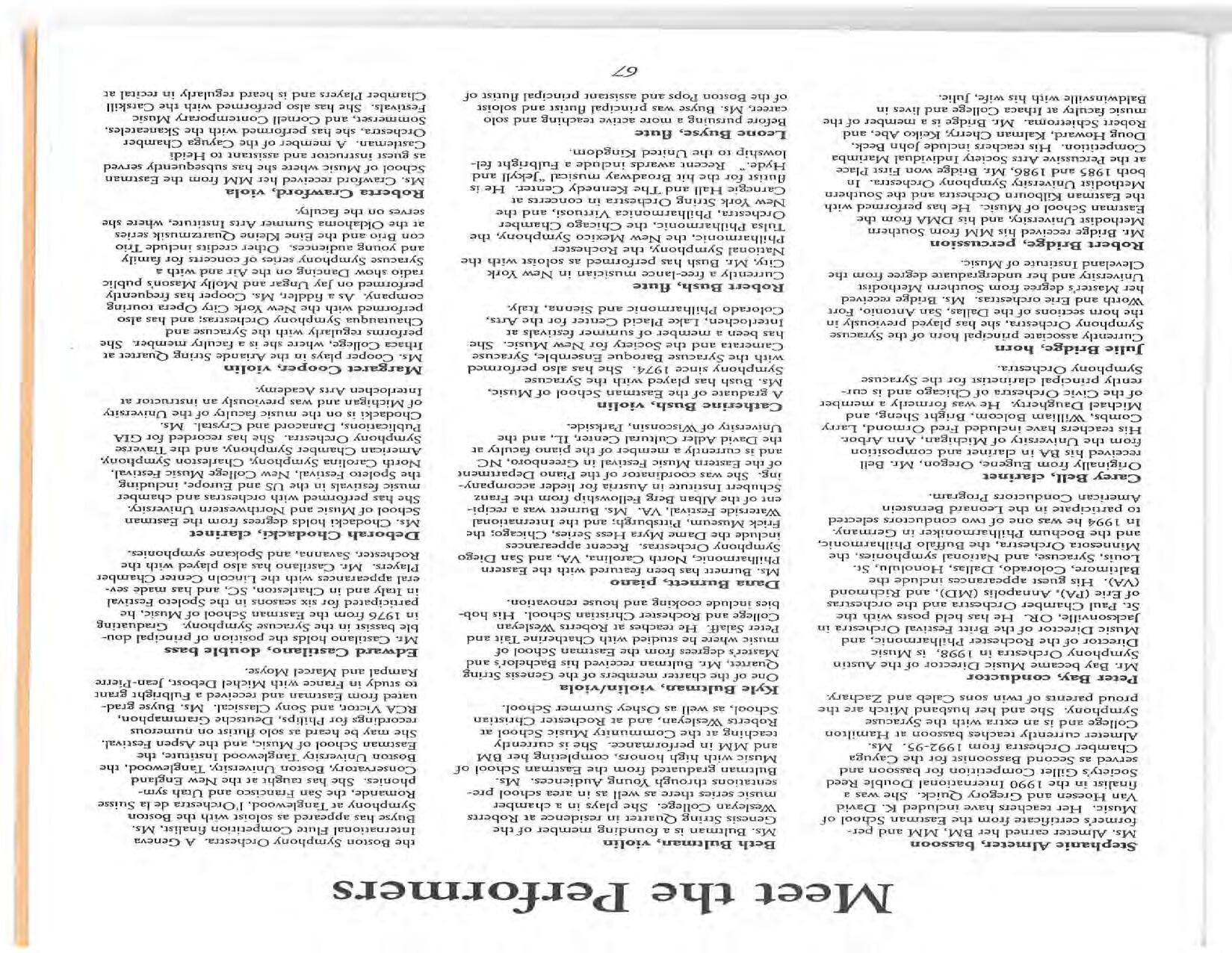 The Festival presents its first opera, Britten’s Noye’s Fludde, conducted by Grant Cooper. The Magellan String Quartet performs Ravel, Schoenberg’s Transfigured Night, and Strauss. Awadagin Pratt joins the Miro String Quartet for Dvořák’s Quintet; the Miro also plays Haydn and Bartók. Pratt solos in Mozart’s Piano Concerto No. 23 and conducts Beethoven’s Symphony No. 3. Hilary Hahn performs Beethoven’s Piano Trio, Brahms’ String Sextet, and Brahms’ Violin Sonata No. 2. In the final concert, with the composer present, Jeffrey Kahane conducts Hahn in the second-ever performance of Edgar Meyer’s Violin Concerto, shortly before she records the work.
