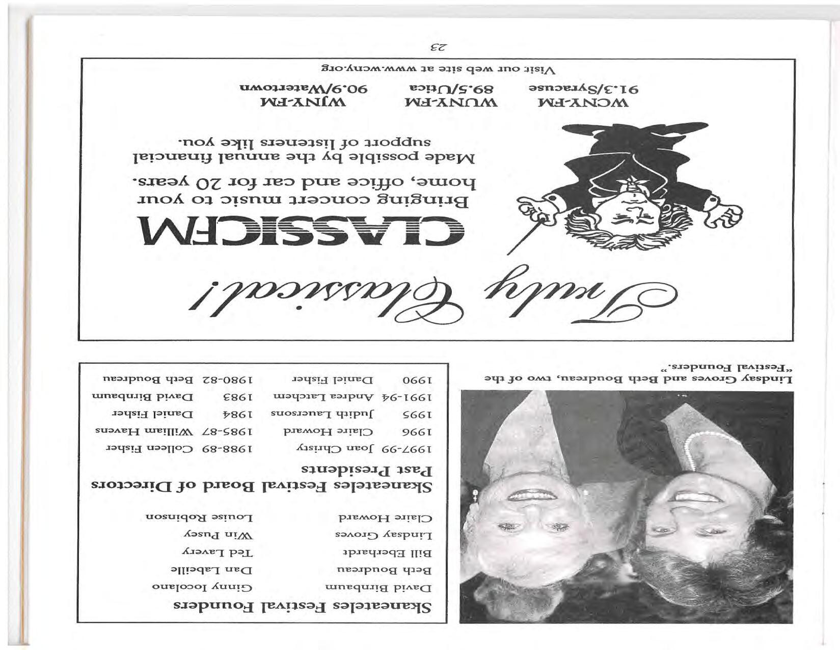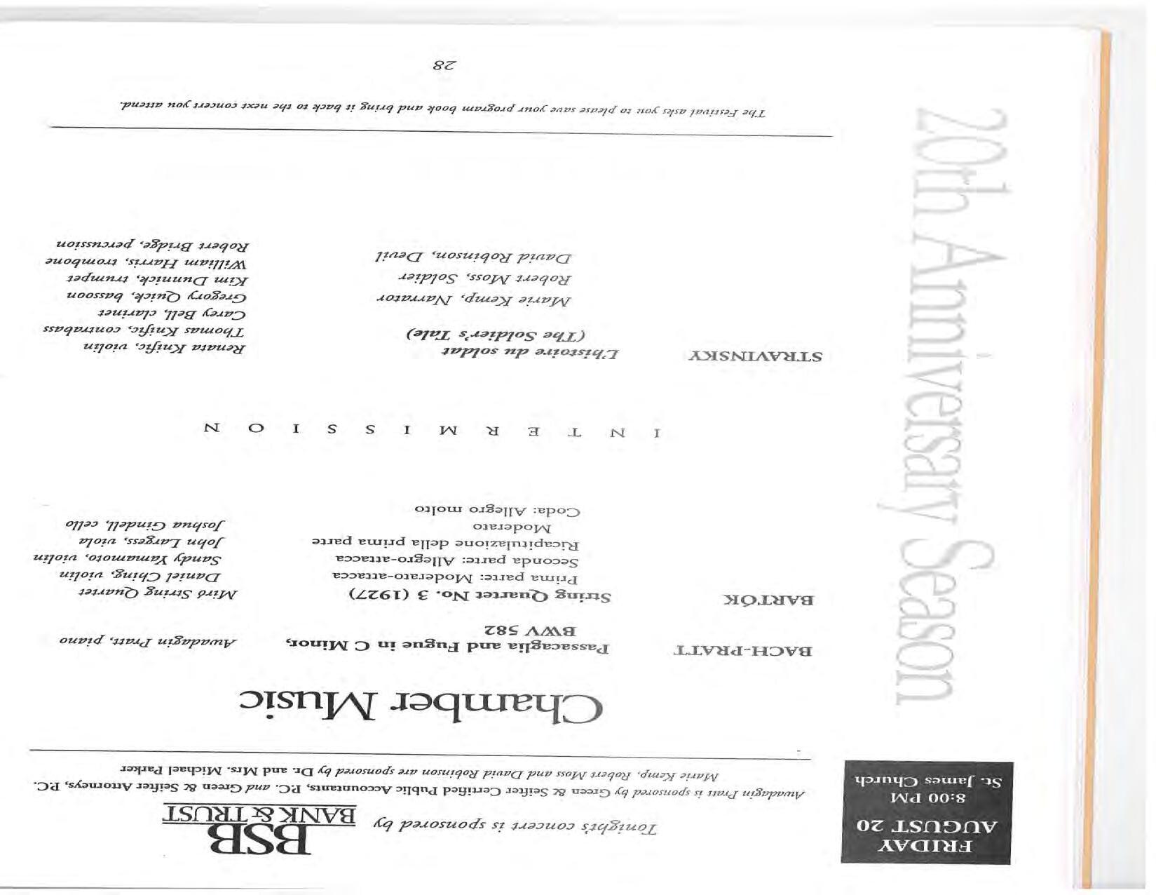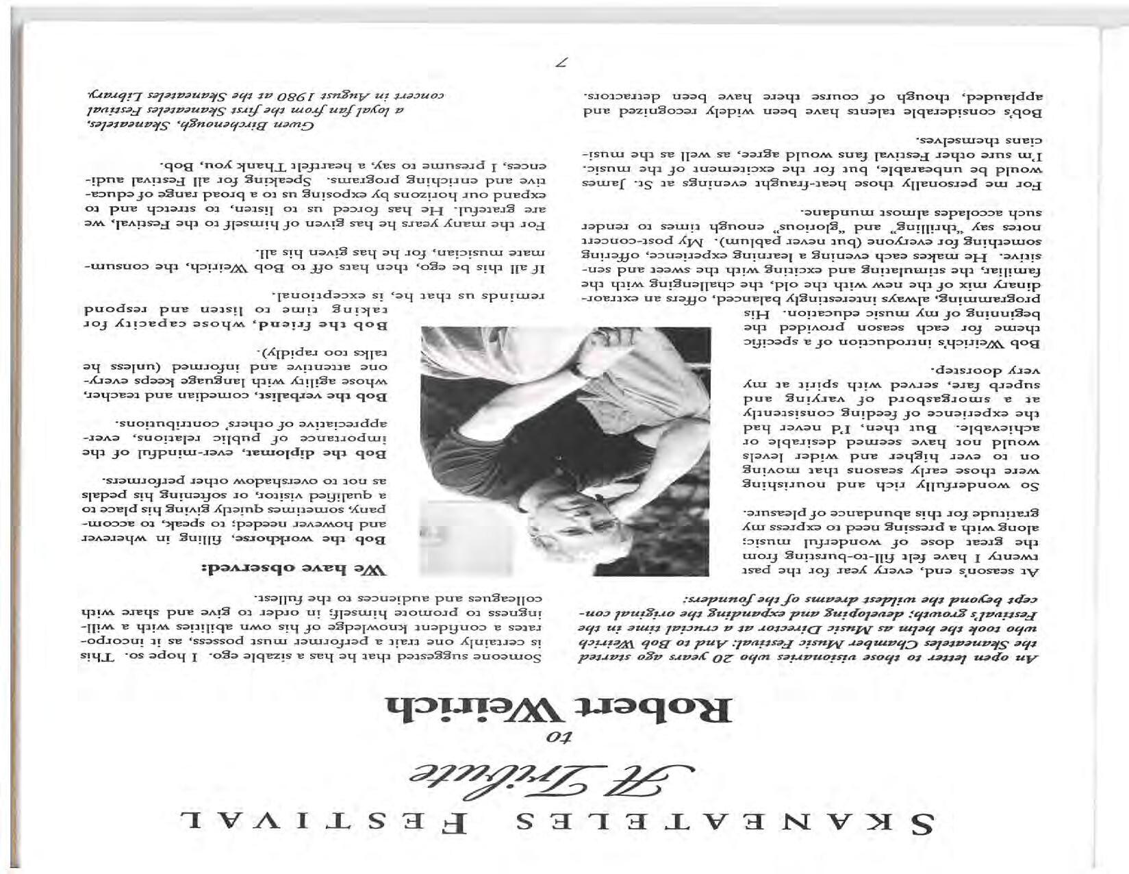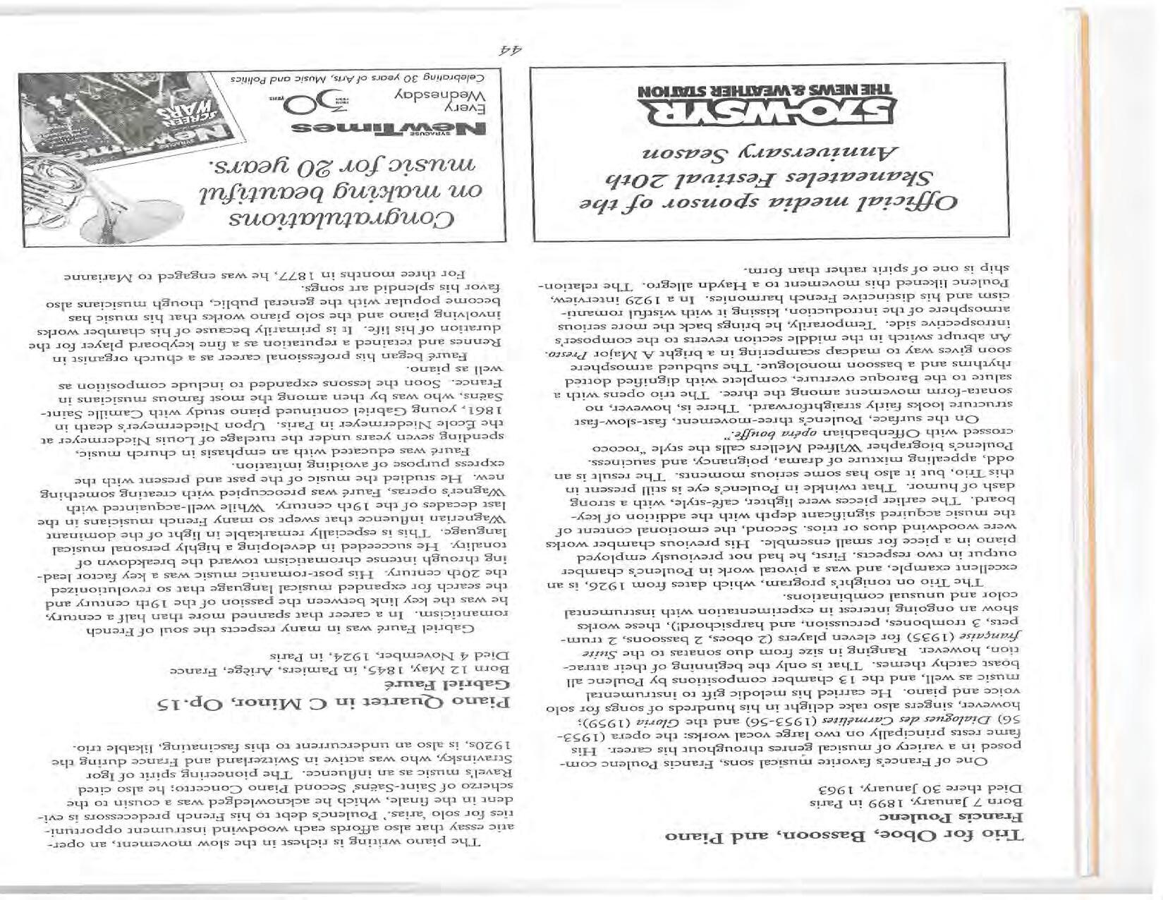 The Festival presents its first opera, Britten’s Noye’s Fludde, conducted by Grant Cooper. The Magellan String Quartet performs Ravel, Schoenberg’s Transfigured Night, and Strauss. Awadagin Pratt joins the Miro String Quartet for Dvořák’s Quintet; the Miro also plays Haydn and Bartók. Pratt solos in Mozart’s Piano Concerto No. 23 and conducts Beethoven’s Symphony No. 3. Hilary Hahn performs Beethoven’s Piano Trio, Brahms’ String Sextet, and Brahms’ Violin Sonata No. 2. In the final concert, with the composer present, Jeffrey Kahane conducts Hahn in the second-ever performance of Edgar Meyer’s Violin Concerto, shortly before she records the work.