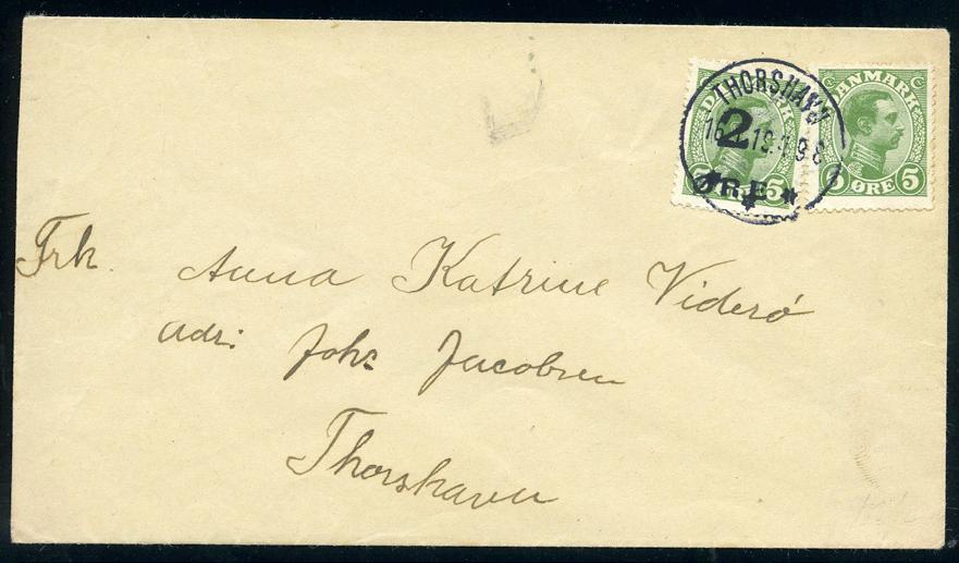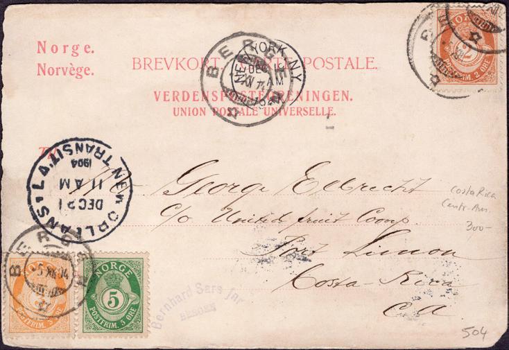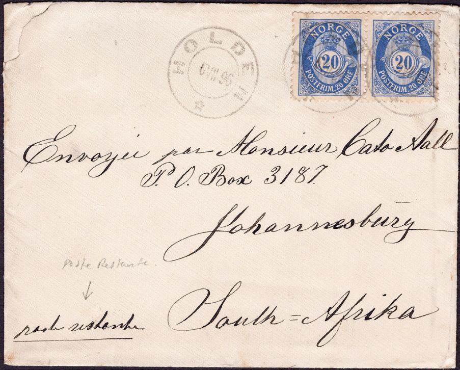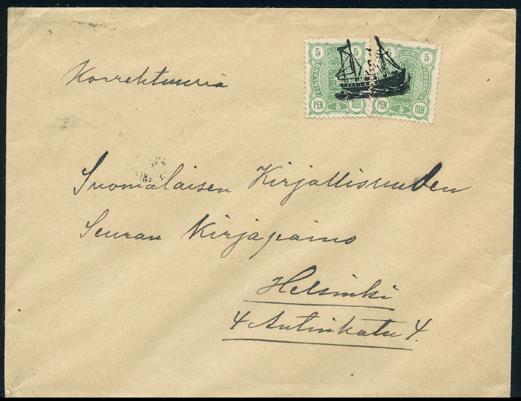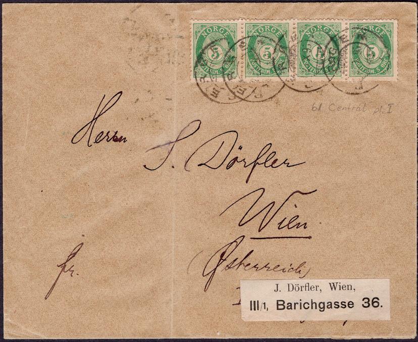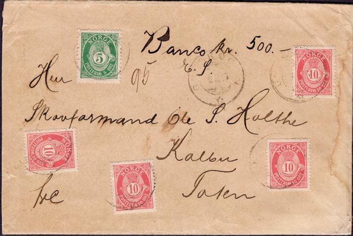 1456 24 brev frankert med posthorn 1909. Alle adressert til Lars Evensen på barken “Hafrsfjord” og er med innhold. Sendt til USA, Chile, South Africa, Australia og New Foundland. De fleste i litt “rufset” kvalitet.