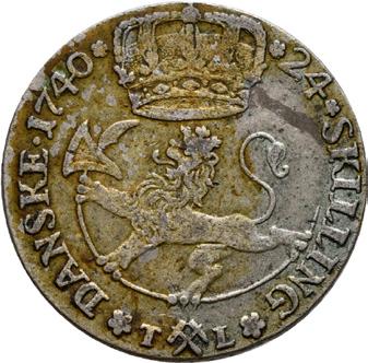 31 24 sk 1734, NMD 4, kv. 1/1+, lagd om til flott skje. 600 32 24 skilling 1737 i kvalitet 1-. 500 F 33 24 skilling 1740 i kvalitet 1+. 1200 34 24 sk 1746, 1762, NMD 17, 19, kv. 1/1+. Begge lagd om til flotte skjeer. 400