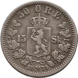 74 50 øre - samling i Sieg-perm til 1985 med blant annet 1877, 1889, 1891, 1893, 1895, 1896, 1898, 1902, 1914, 1916, 1918 og 1919. VK.