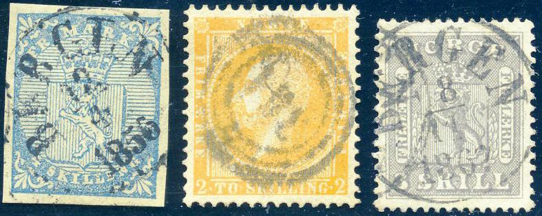 1363 o Tre gamle utvalgshefter med merker fra 1856 til 1985. Noen merker er tatt ut, men her er flere bedre merker igjen - deriblant 16 skillingsmerker i ok kvalitet.