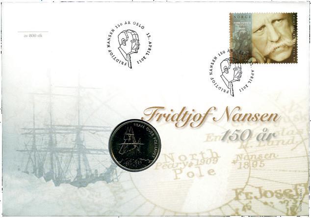 Bergen Mynt og Seddels myntbrev nr. 70, Fridtjof Nansen 150 år (unummerert). Med NK 1782 og 5 kr mynt Fram over polhavet 1996. Normalpris kr. 225,-.