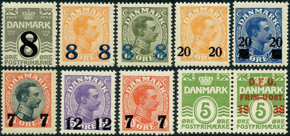 9 postfriske frimerker 1921/1938 med overtrykk. AFA 117-19, 152-53, 158-59, 175 og 245. Sistnevnte i par med AFA 199a.
